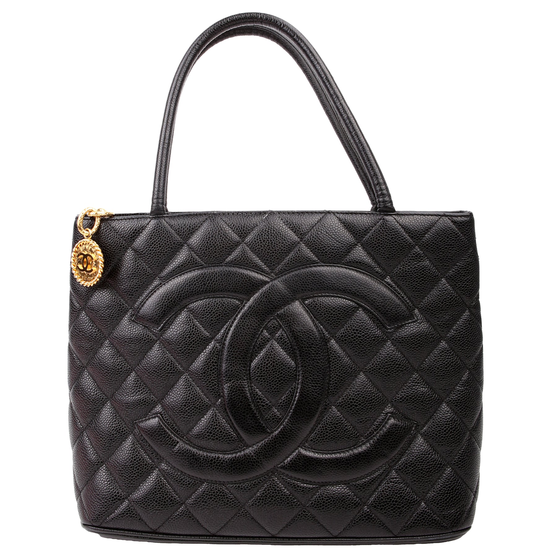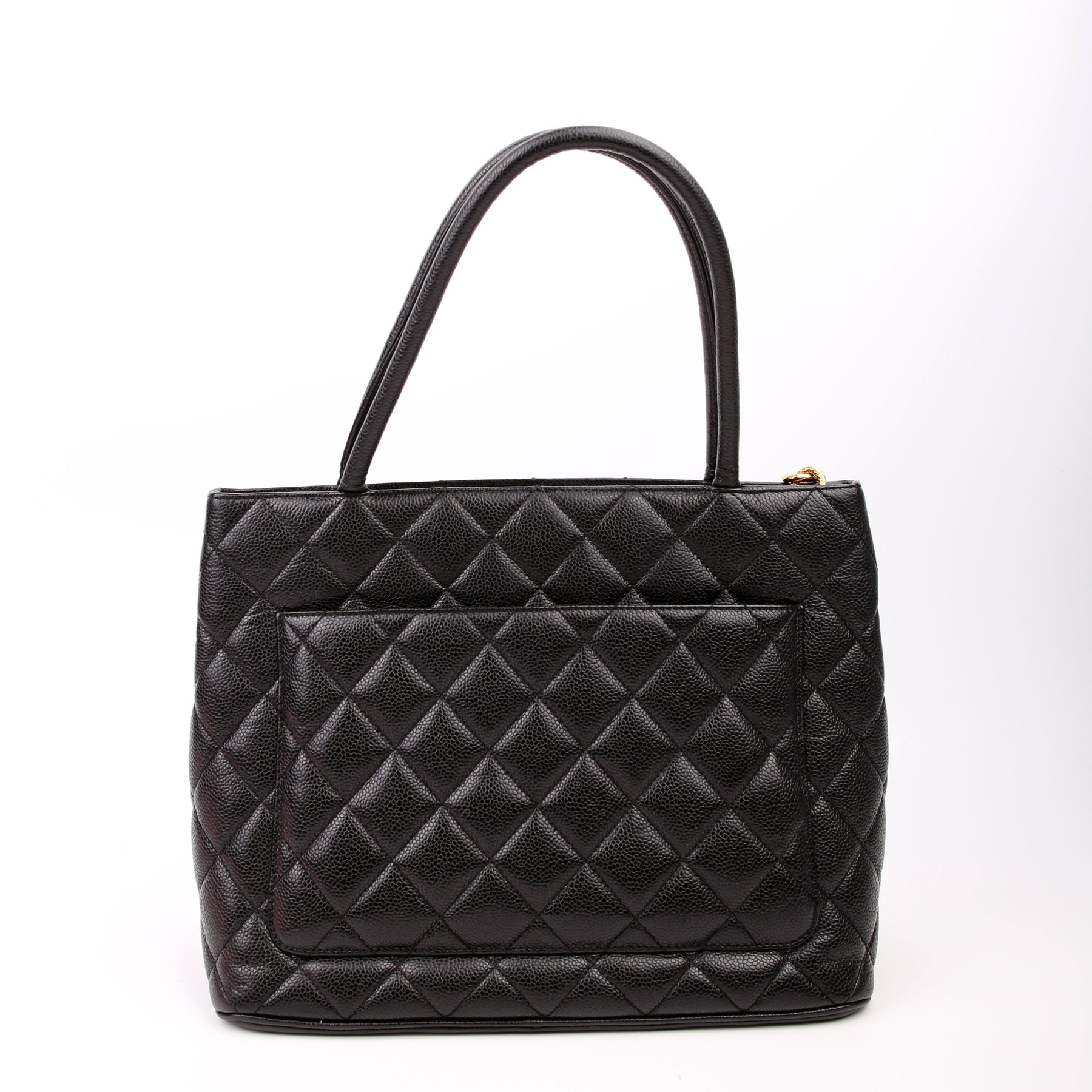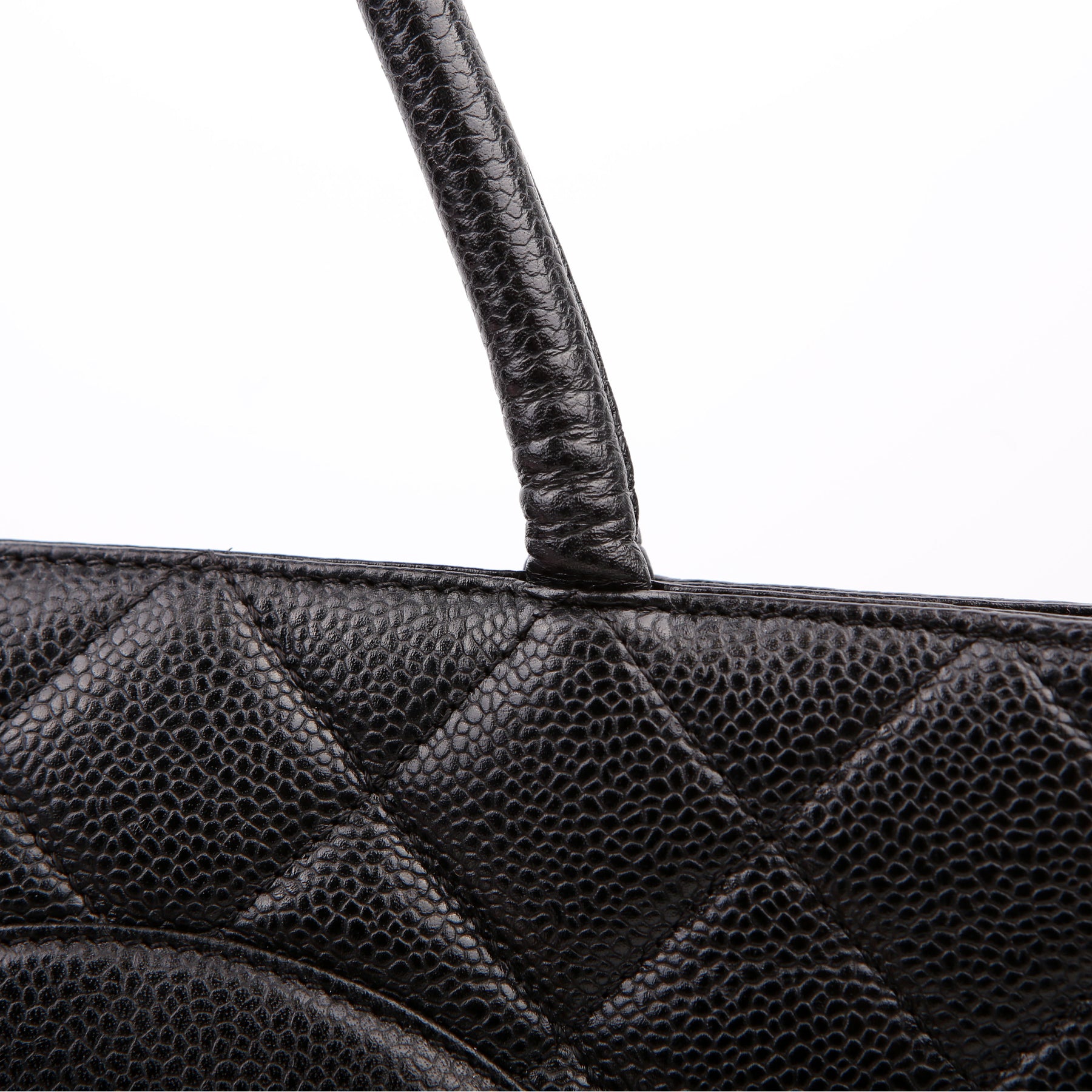 This pre-owned Chanel Medallion Tote is guaranteed 100% authentic. The exterior is in the classic Chanel Caviar leather.