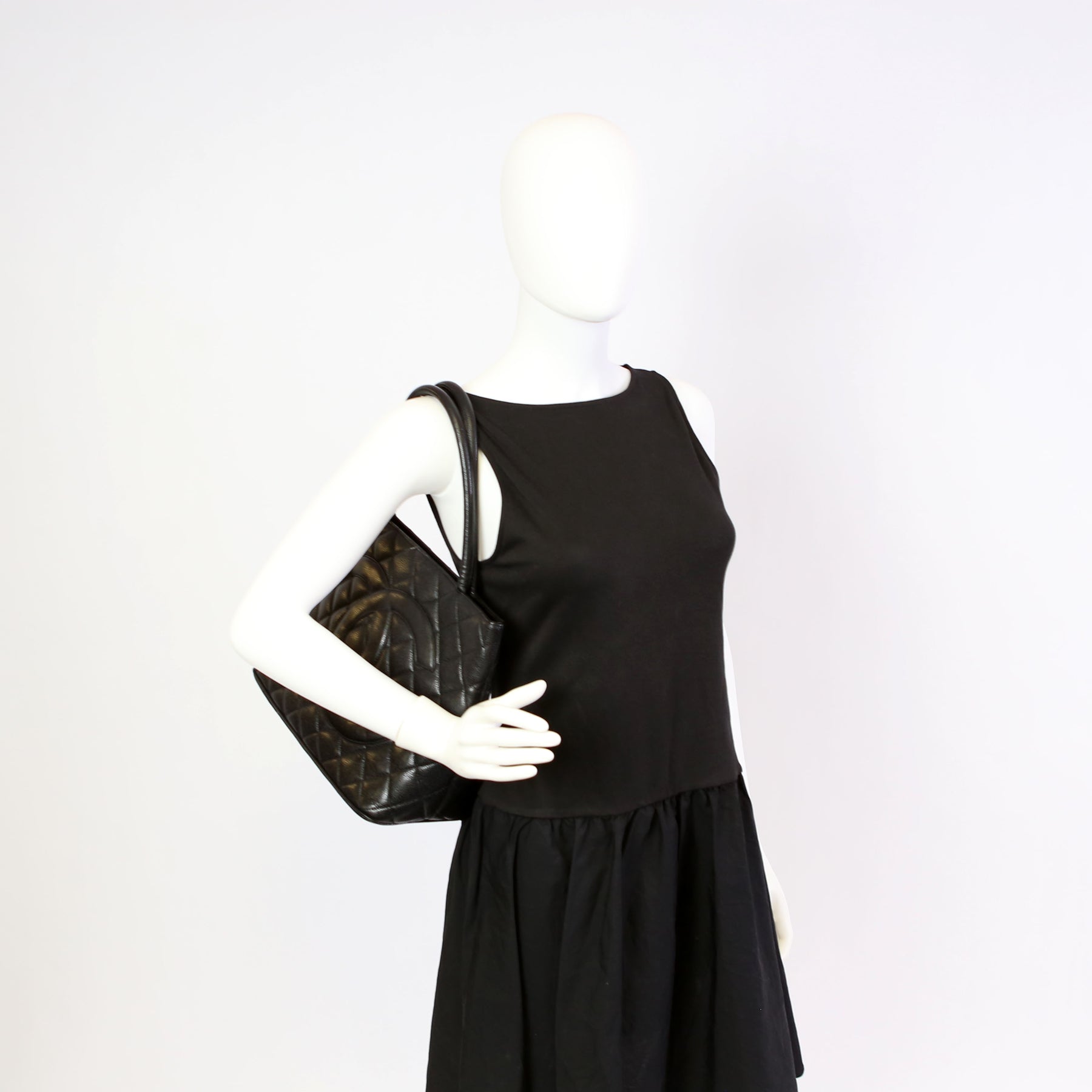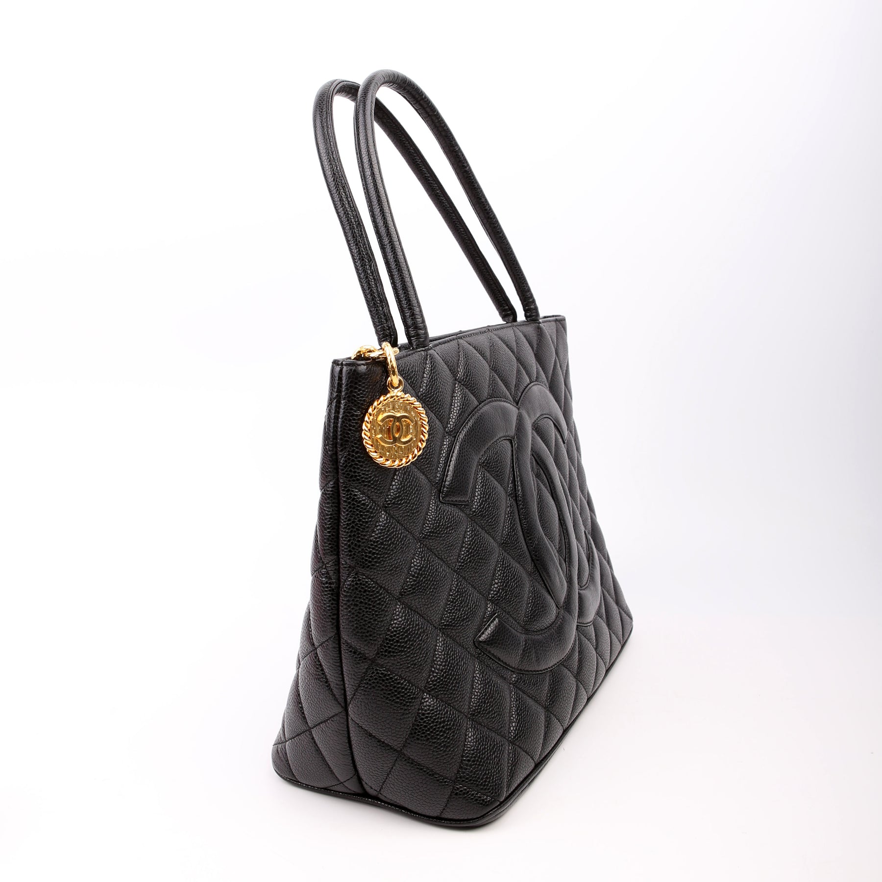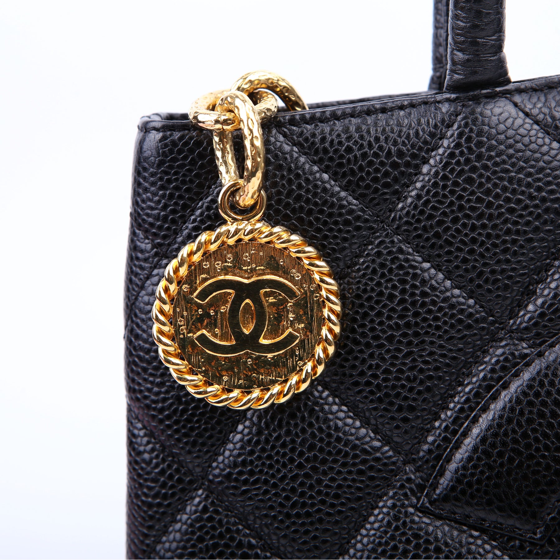 This pre-owned Chanel Medallion Tote is guaranteed 100% authentic. The exterior is in the classic Chanel Caviar leather.