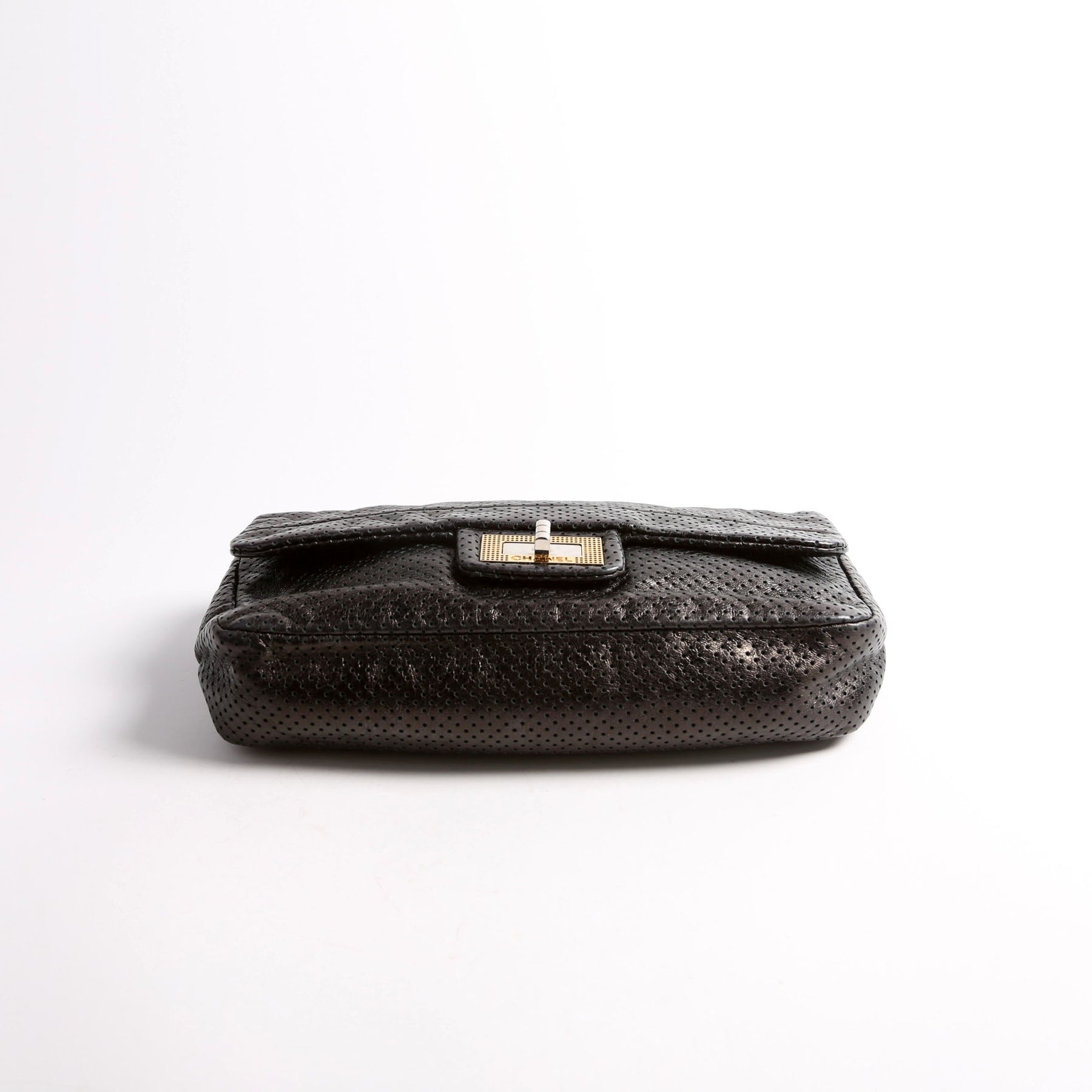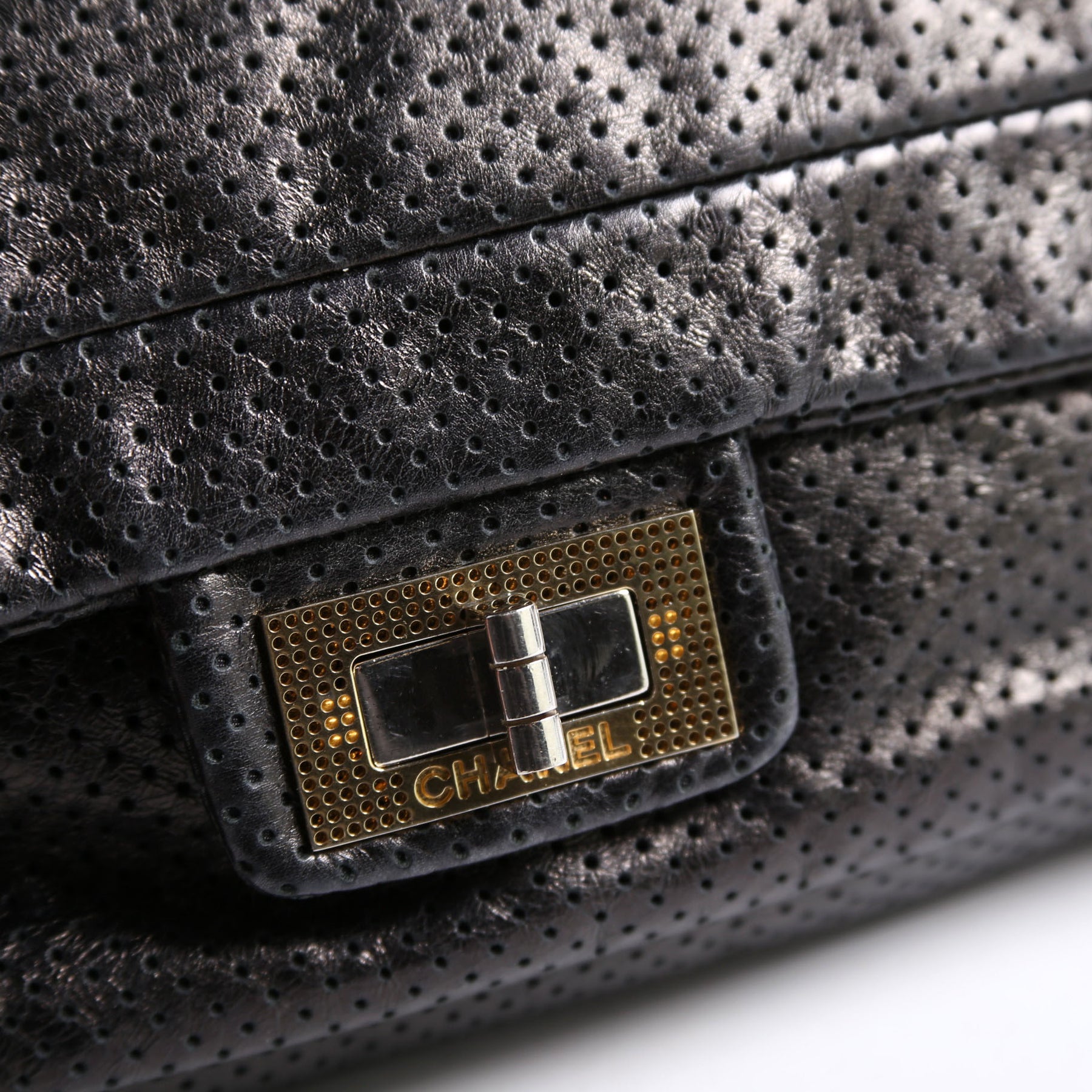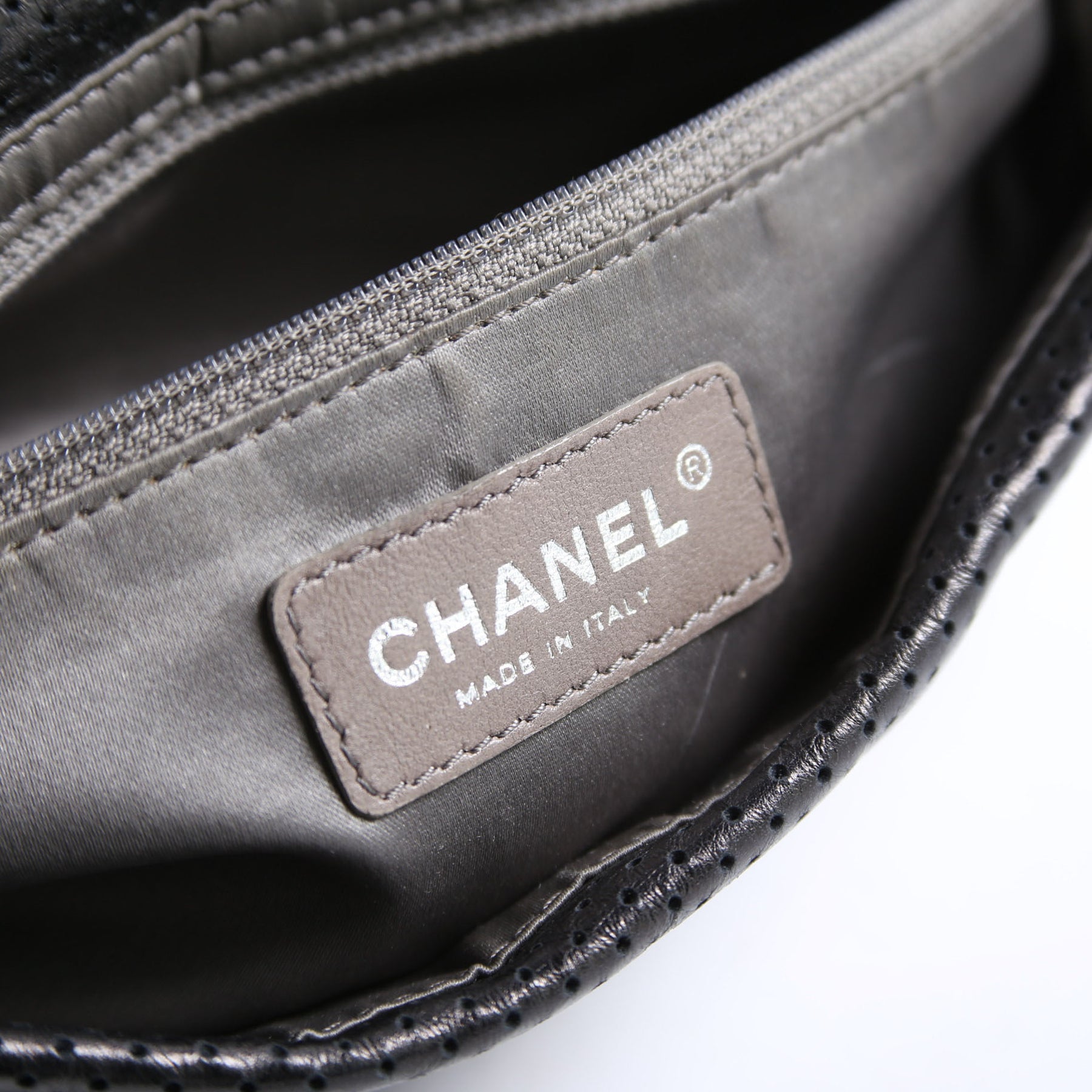 This pre-owned Chanel Metallic Perforated Drill Flap is guaranteed 100% authentic.