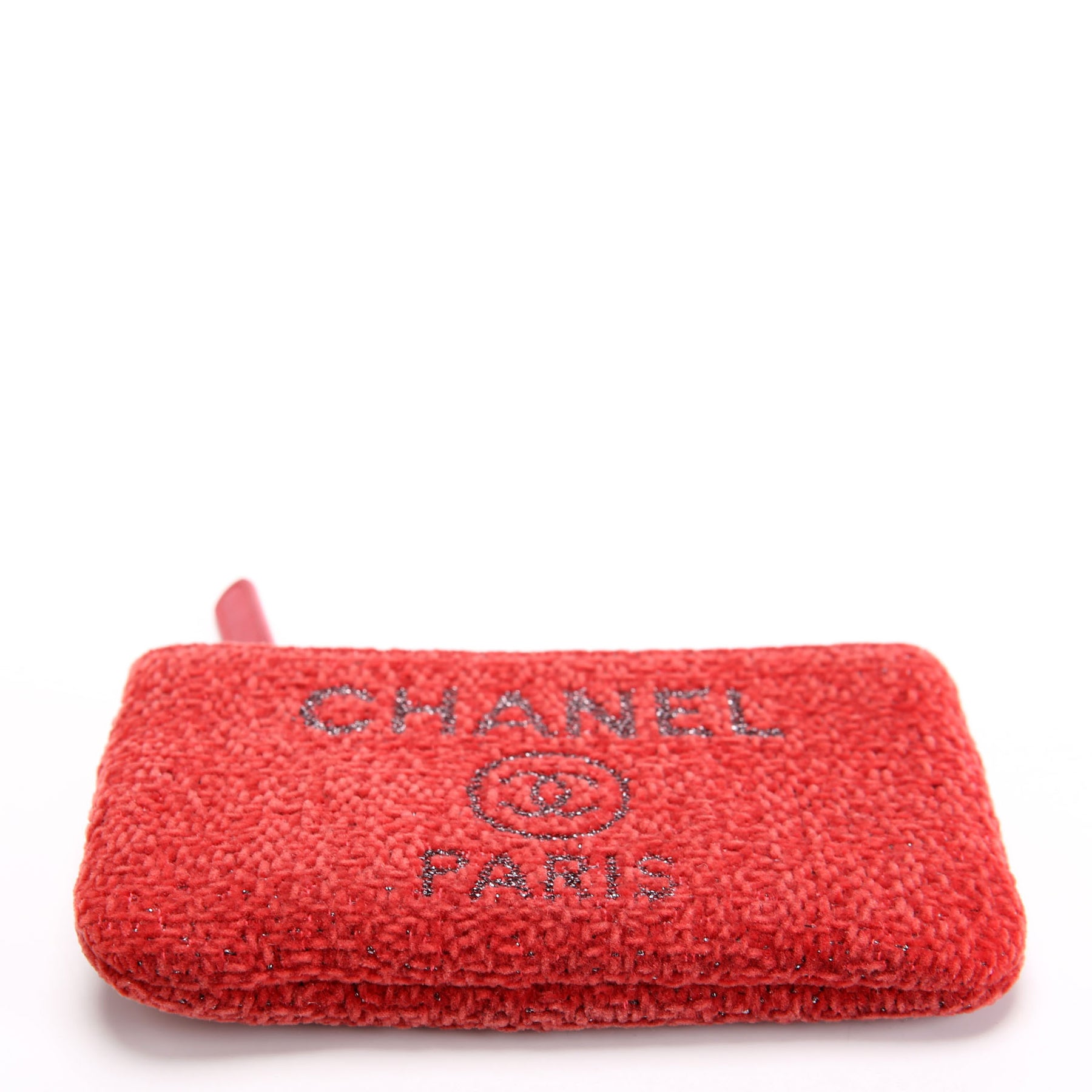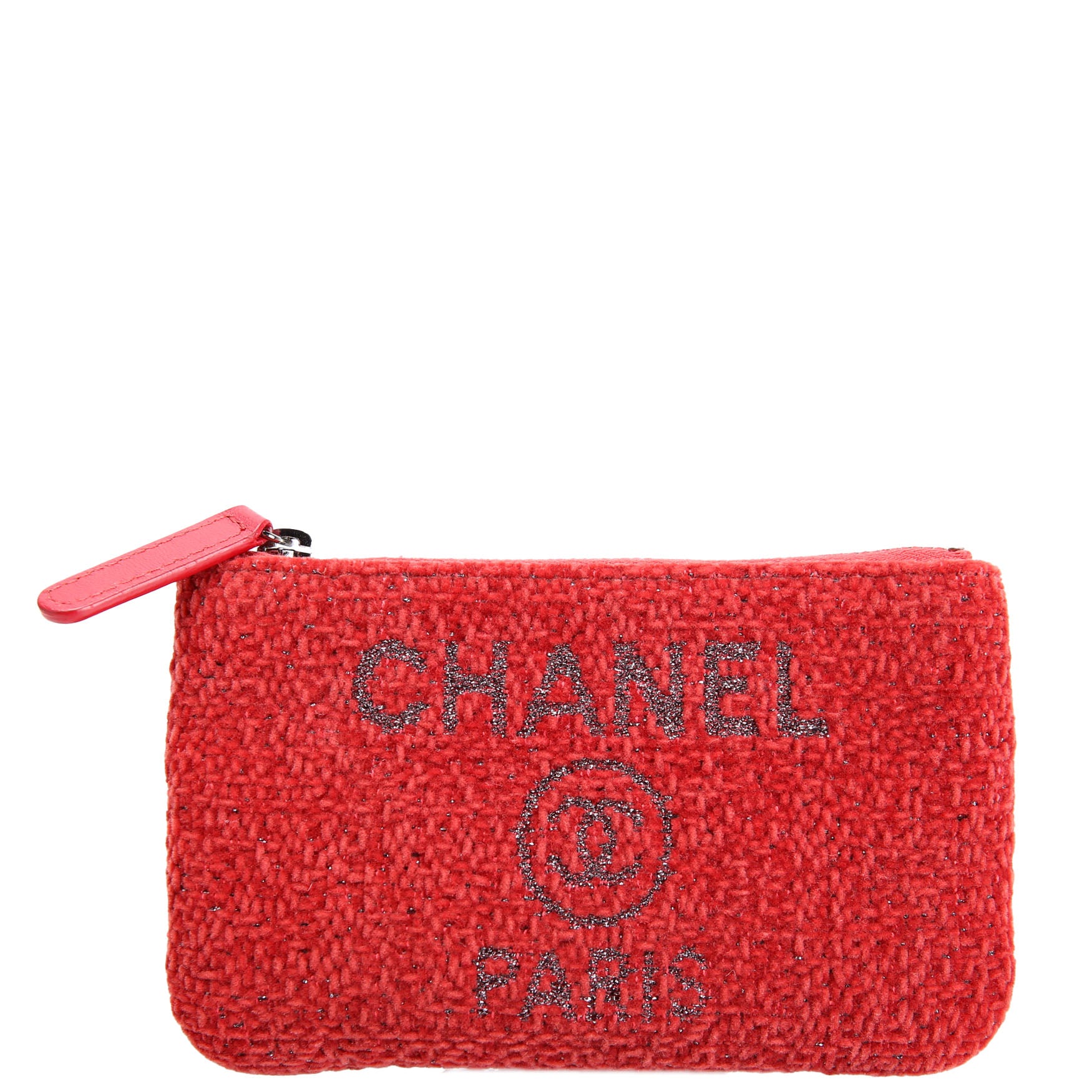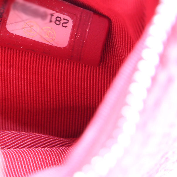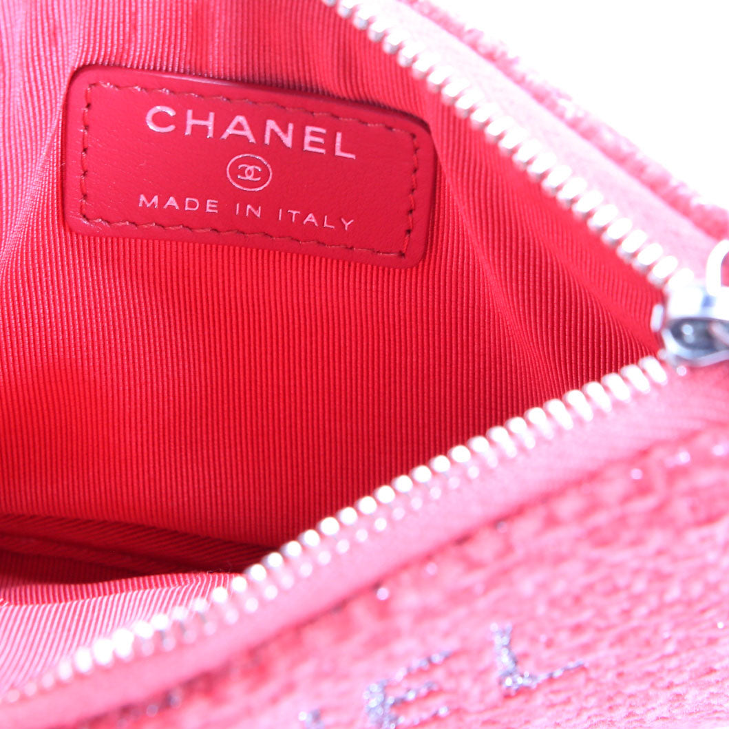 This pre-owned Chanel Mini Deauville Pouch Lurex Boucle is guaranteed 100% authentic. The exterior is in the classic Chanel Canvas.