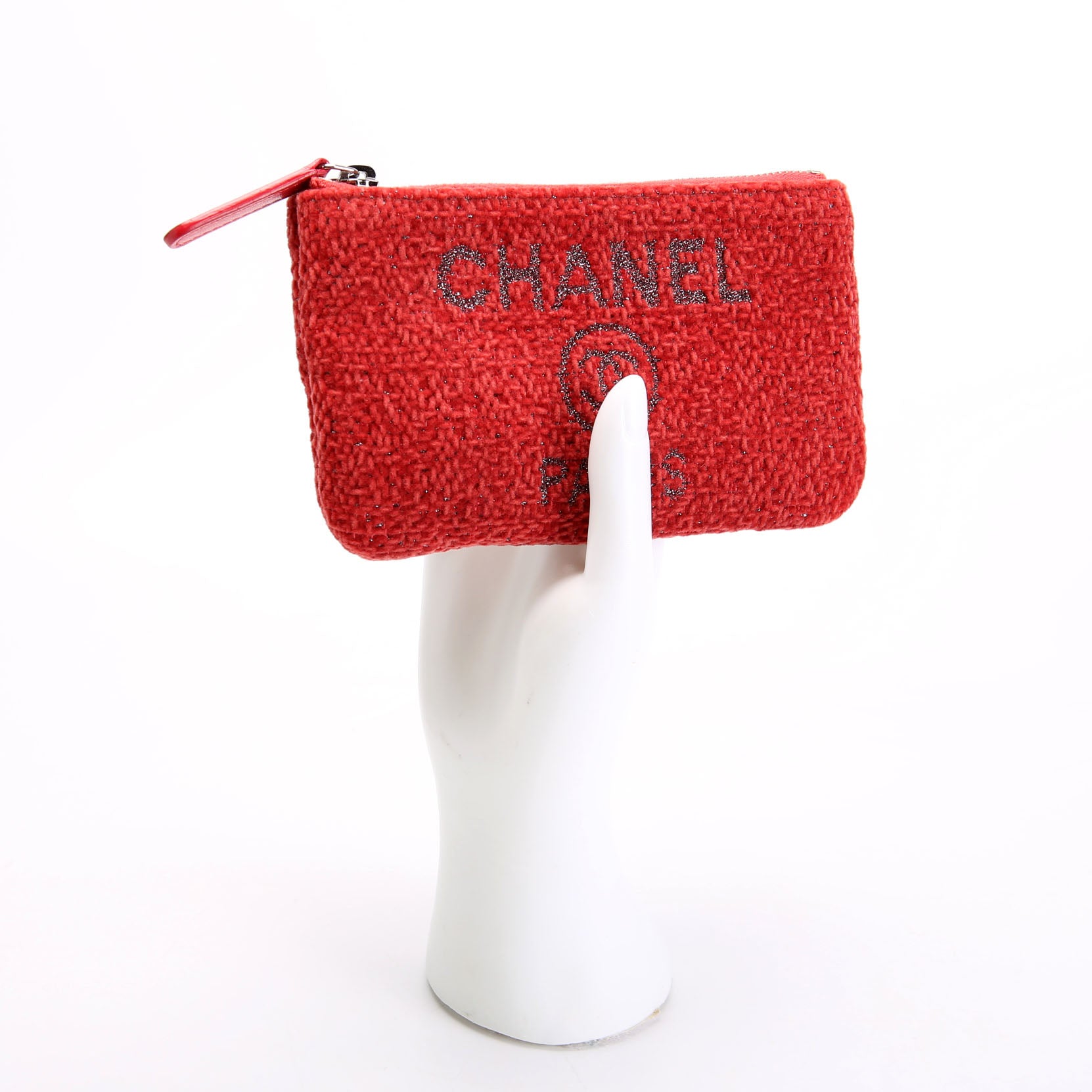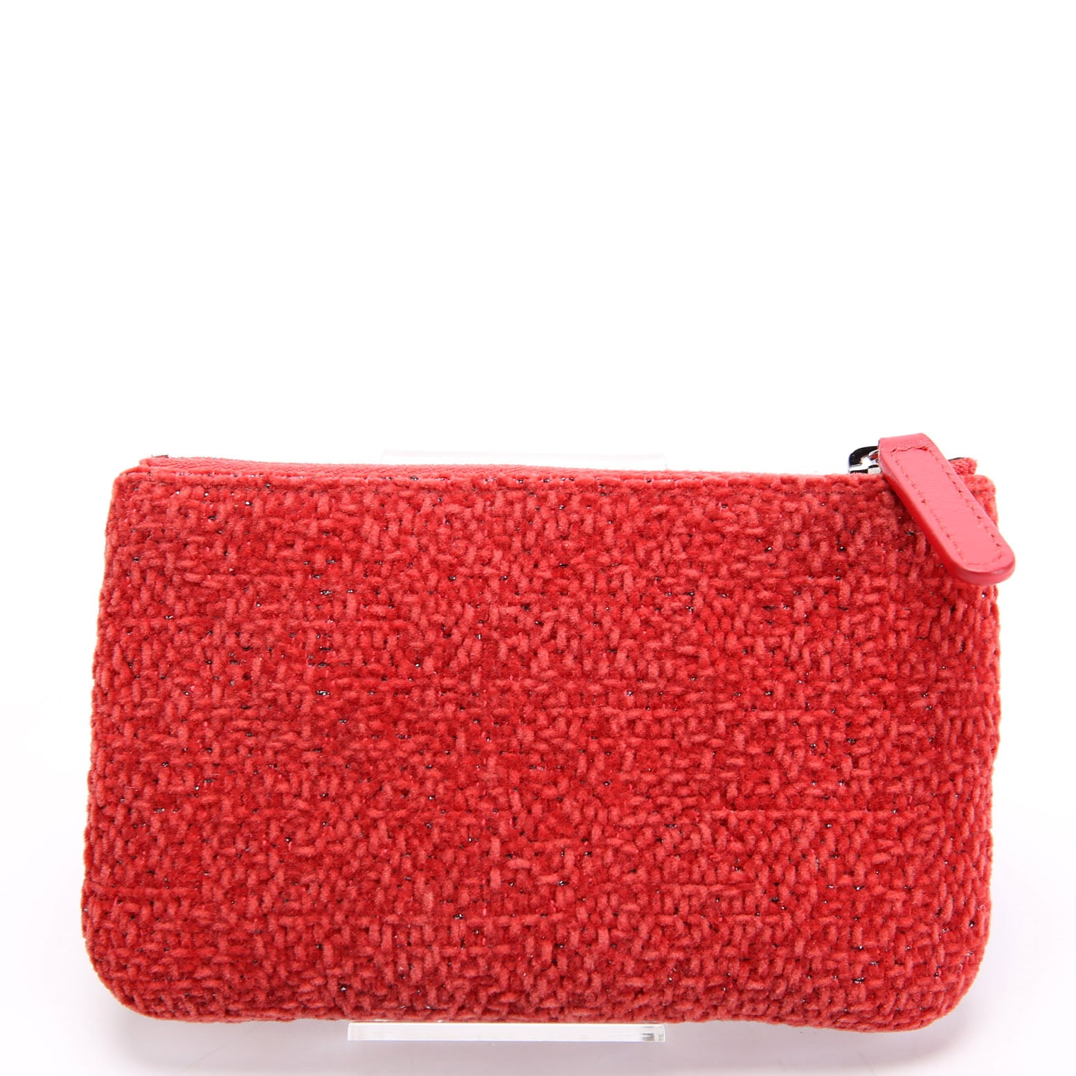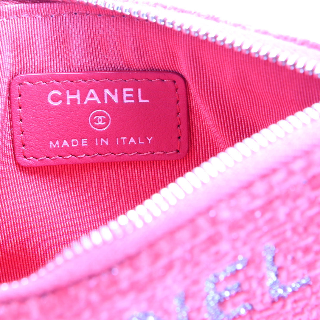 This pre-owned Chanel Mini Deauville Pouch Lurex Boucle is guaranteed 100% authentic. The exterior is in the classic Chanel Canvas.