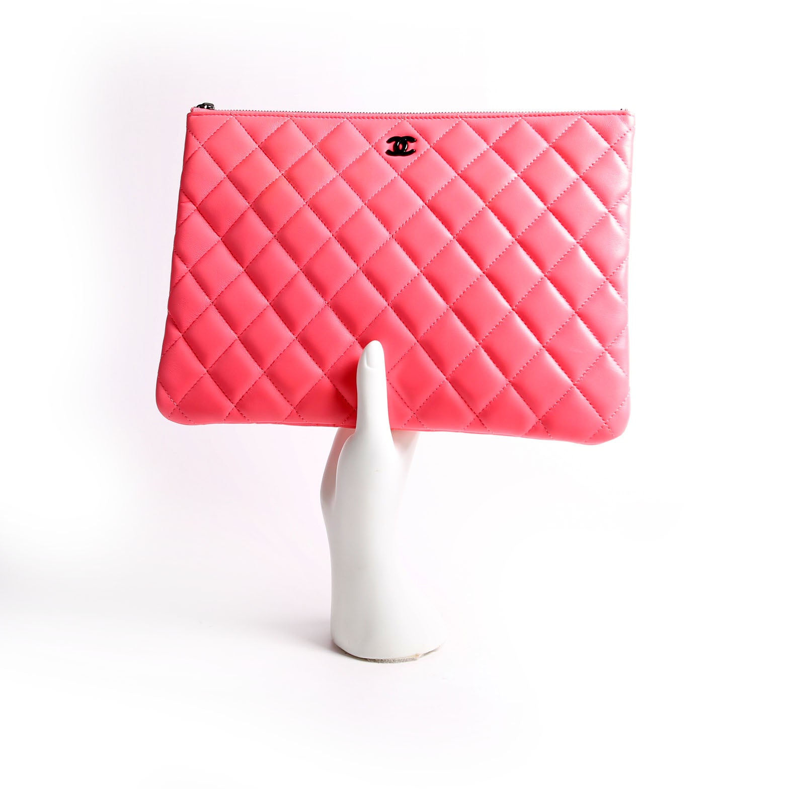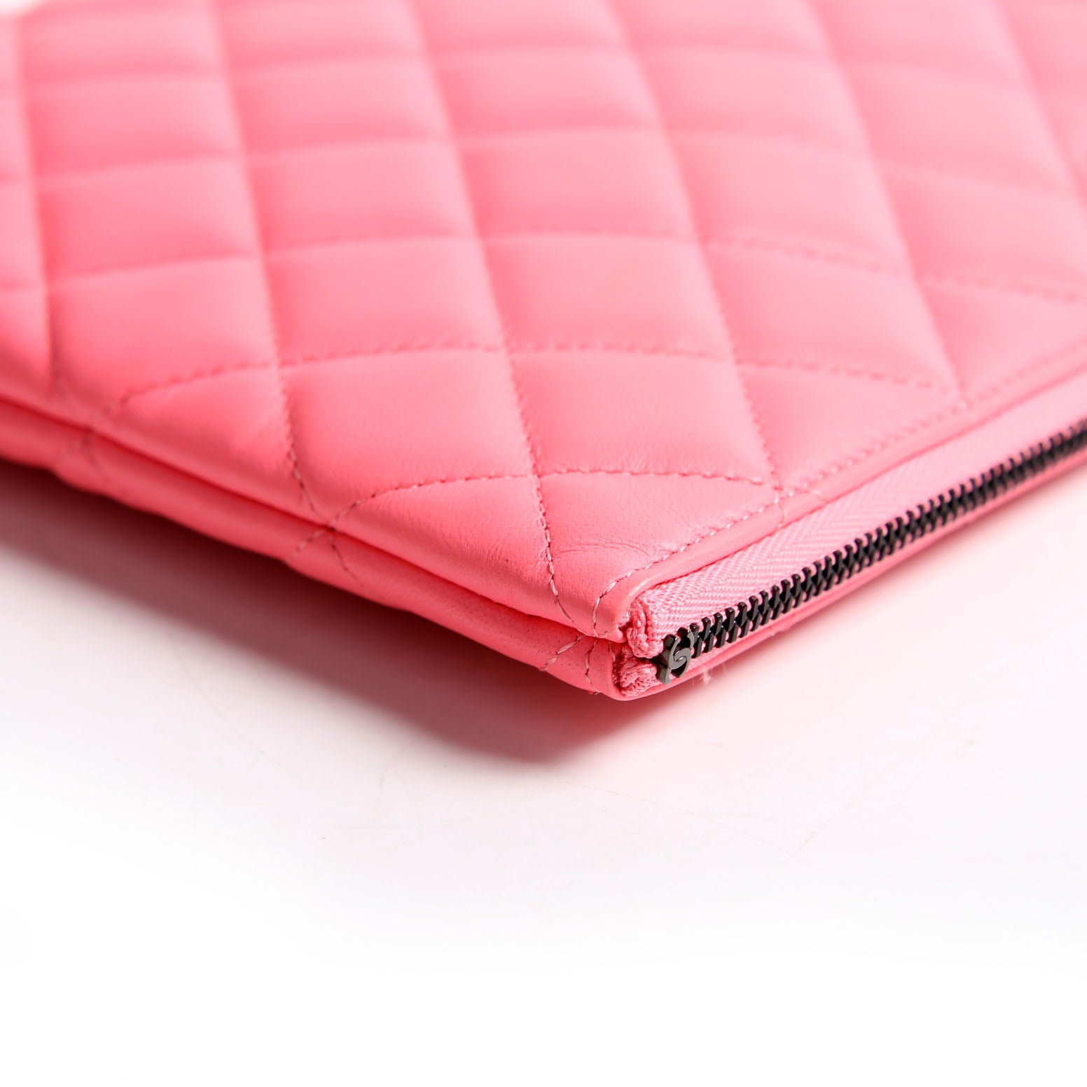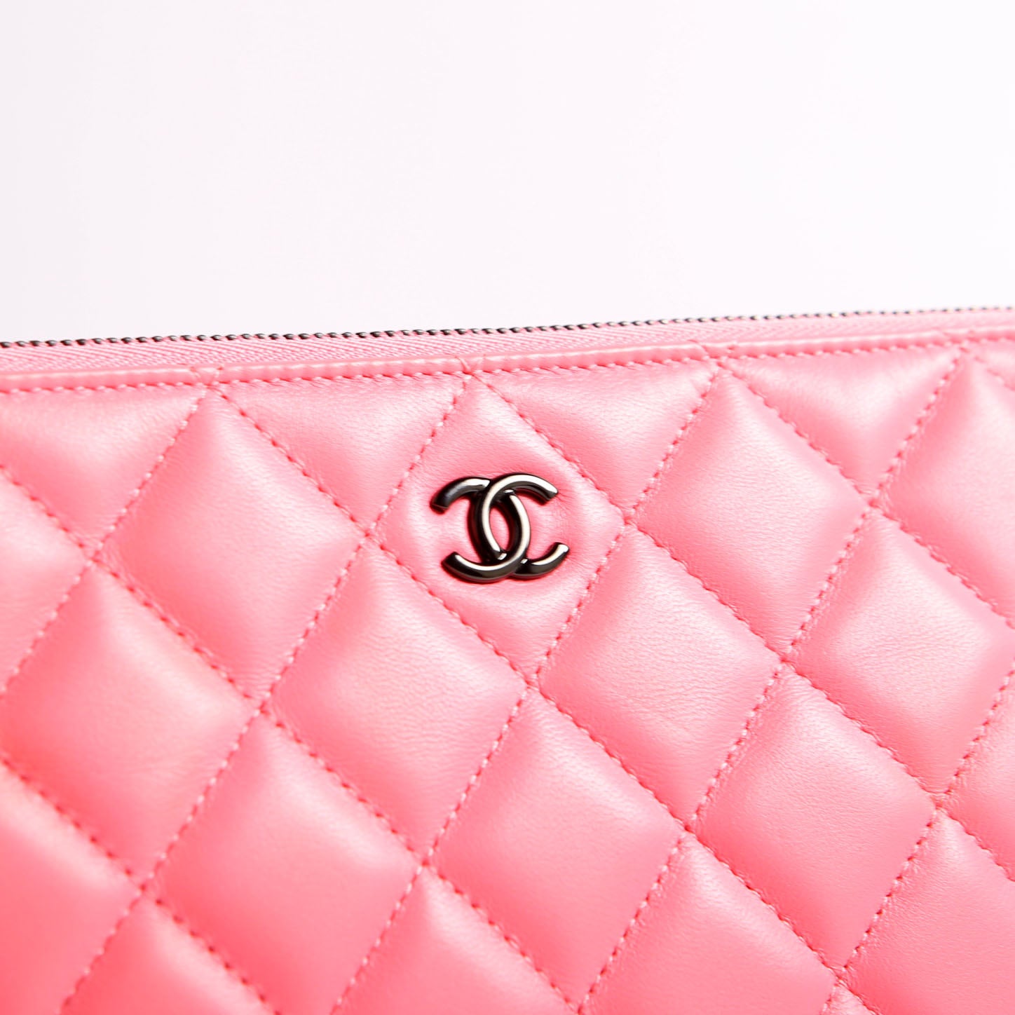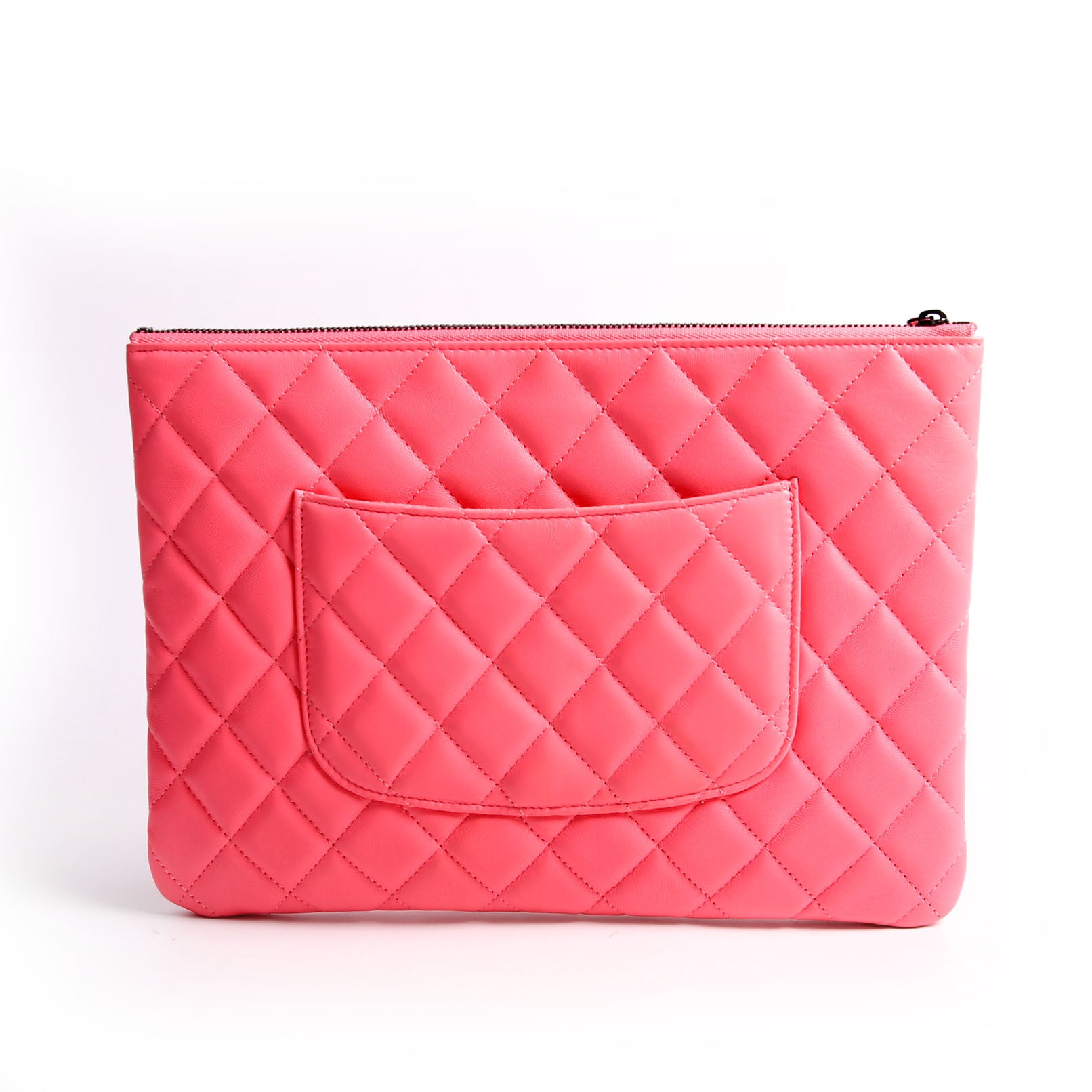 This pre-owned Chanel O Case Medium is guaranteed 100% authentic. The exterior is in the classic Chanel Lambskin leather.