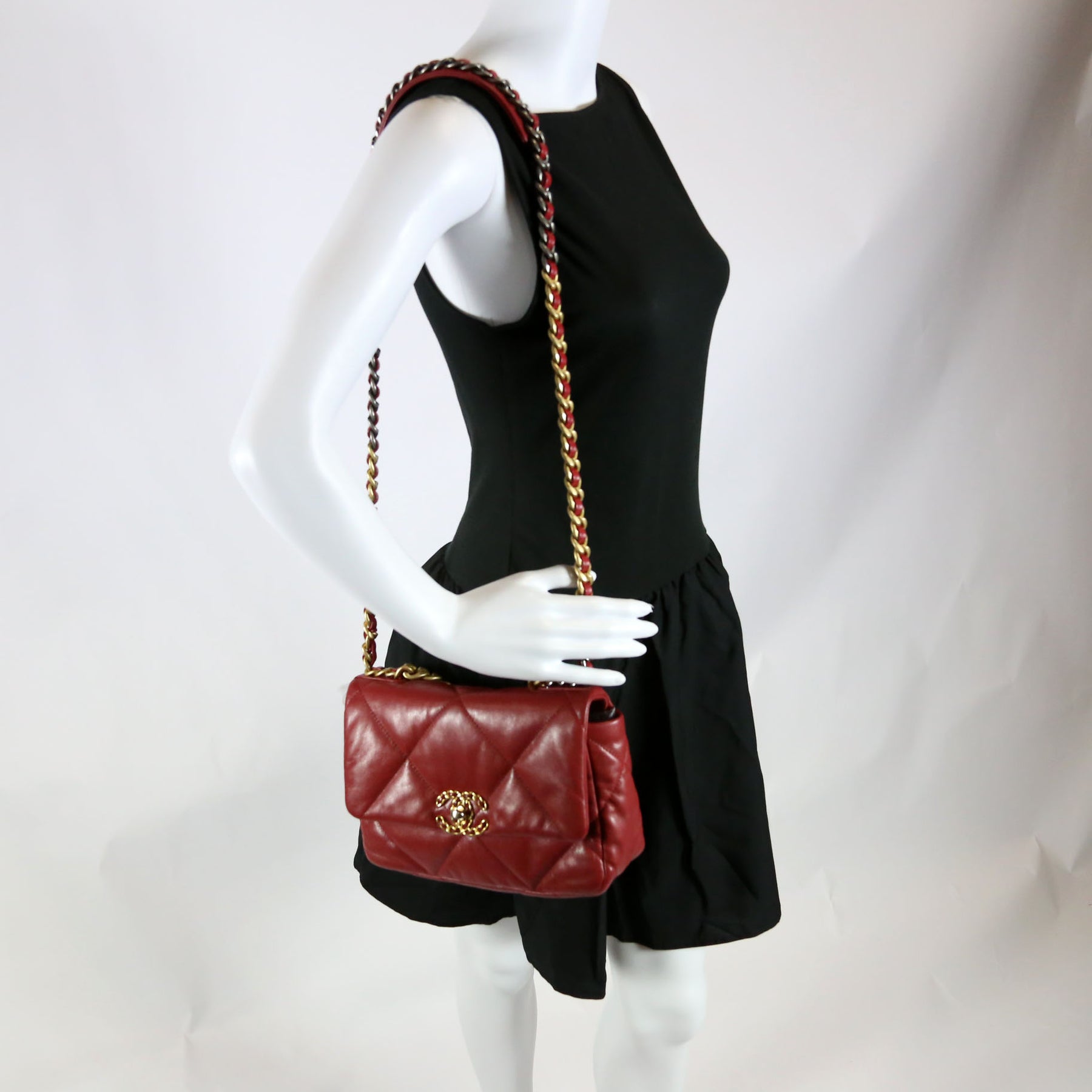 This pre-owned Chanel 19 Medium Flap is guaranteed 100% authentic. The exterior is in the classic Chanel Quilted Goatskin leather.