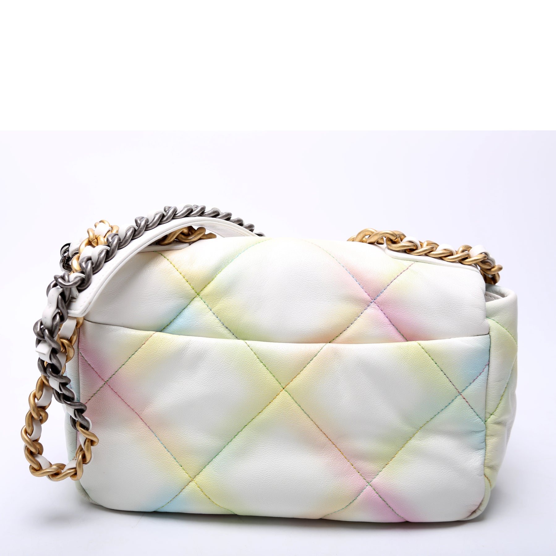 This pre-owned Chanel 19 Medium Flap is guaranteed 100% authentic. The exterior is in the classic Chanel Quilted Goatskin leather.