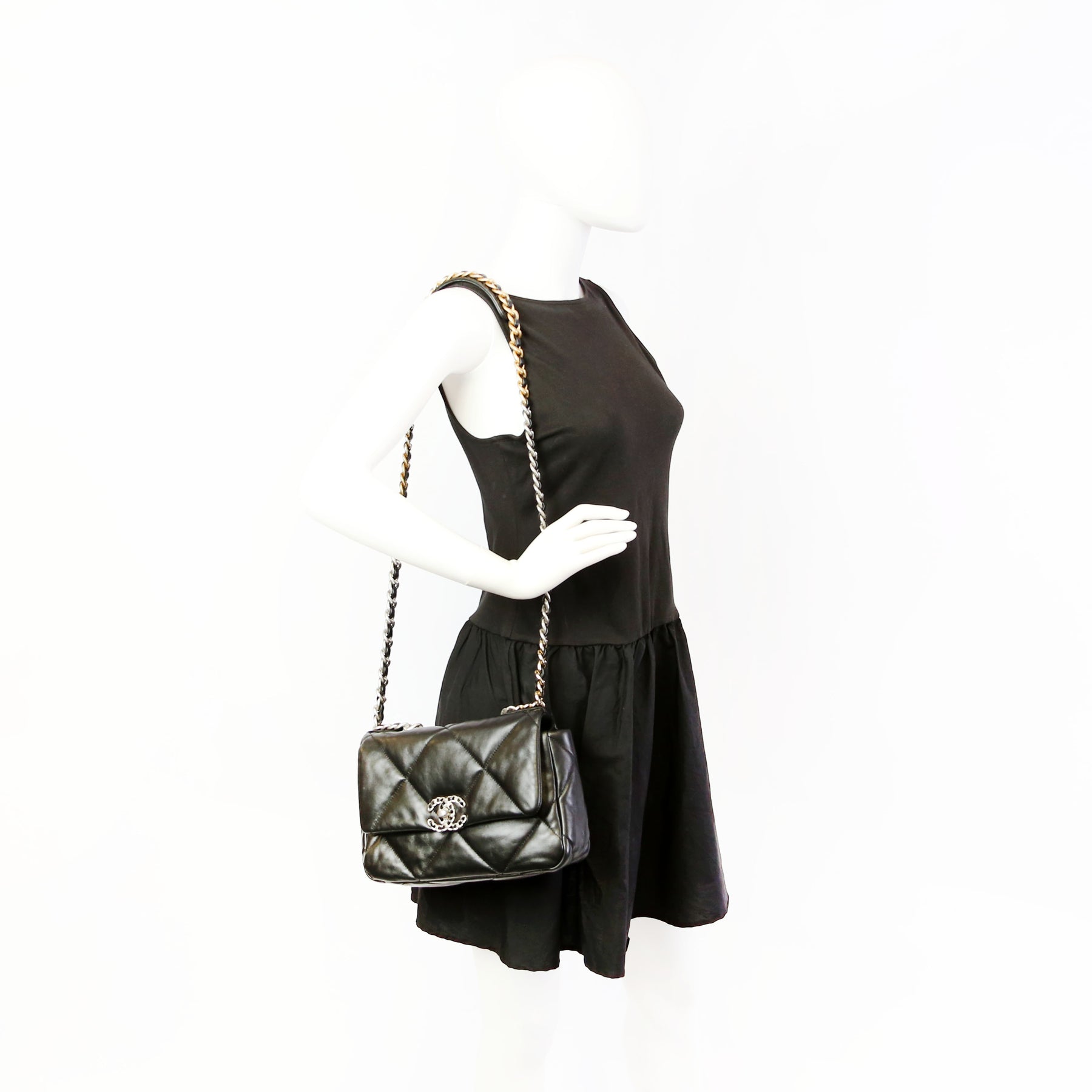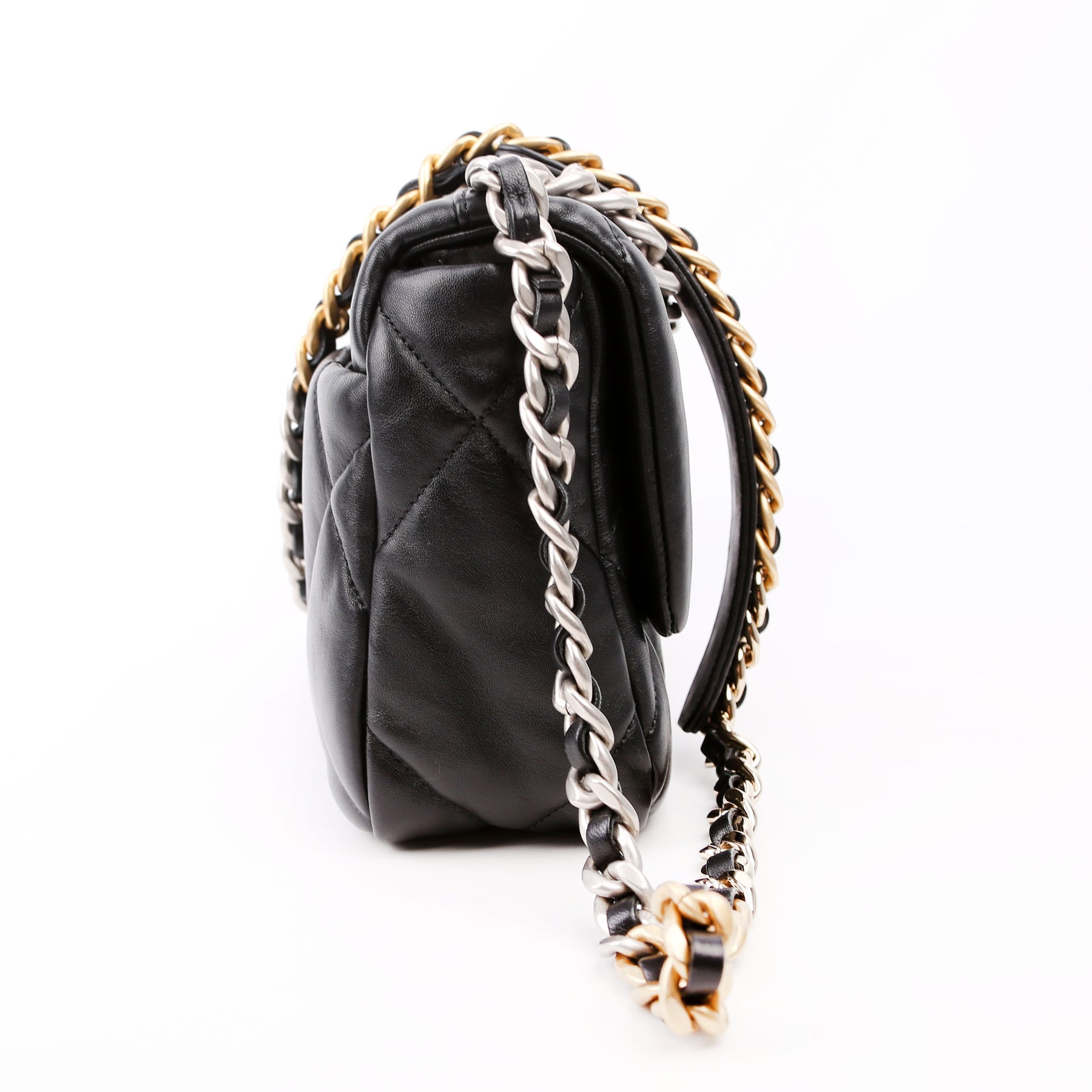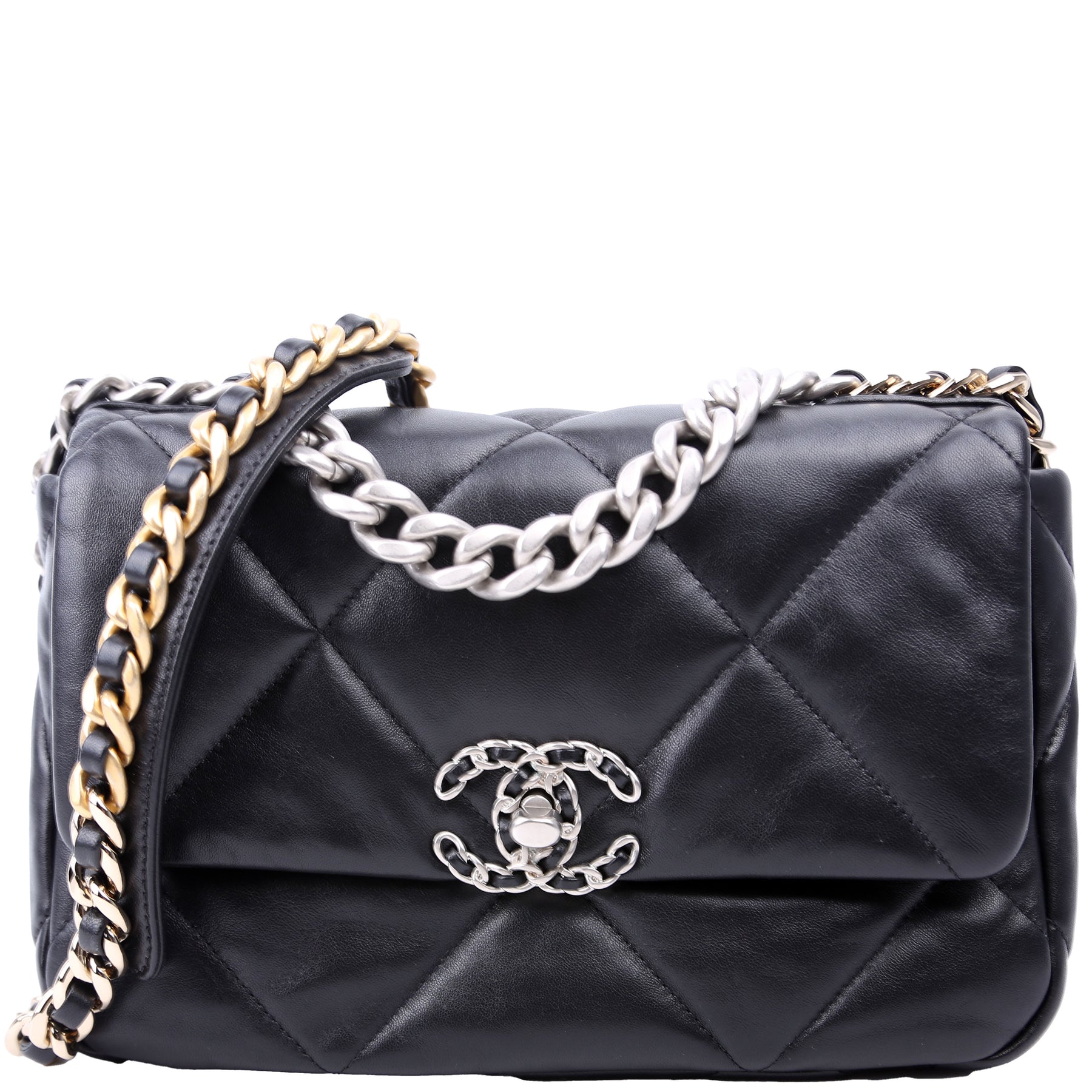 This pre-owned Chanel 19 Medium Flap is guaranteed 100% authentic. The exterior is in the classic Chanel Quilted Goatskin leather.