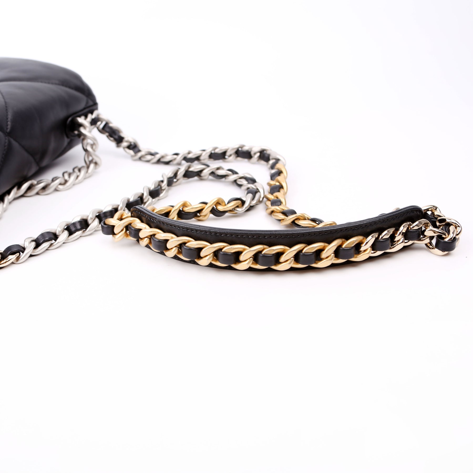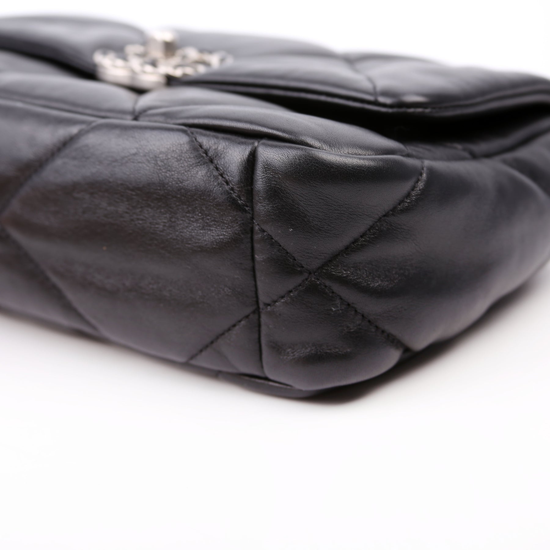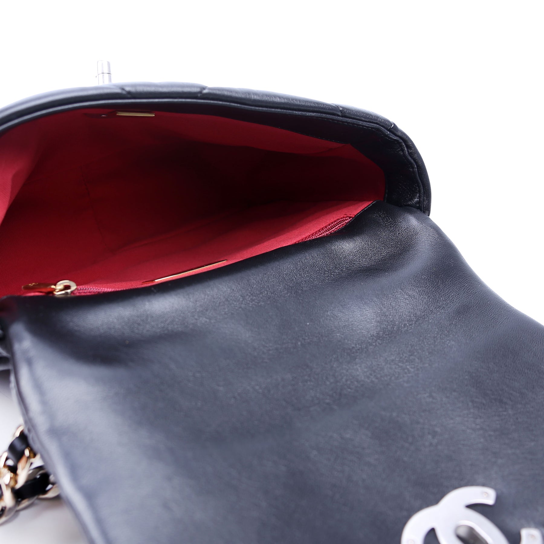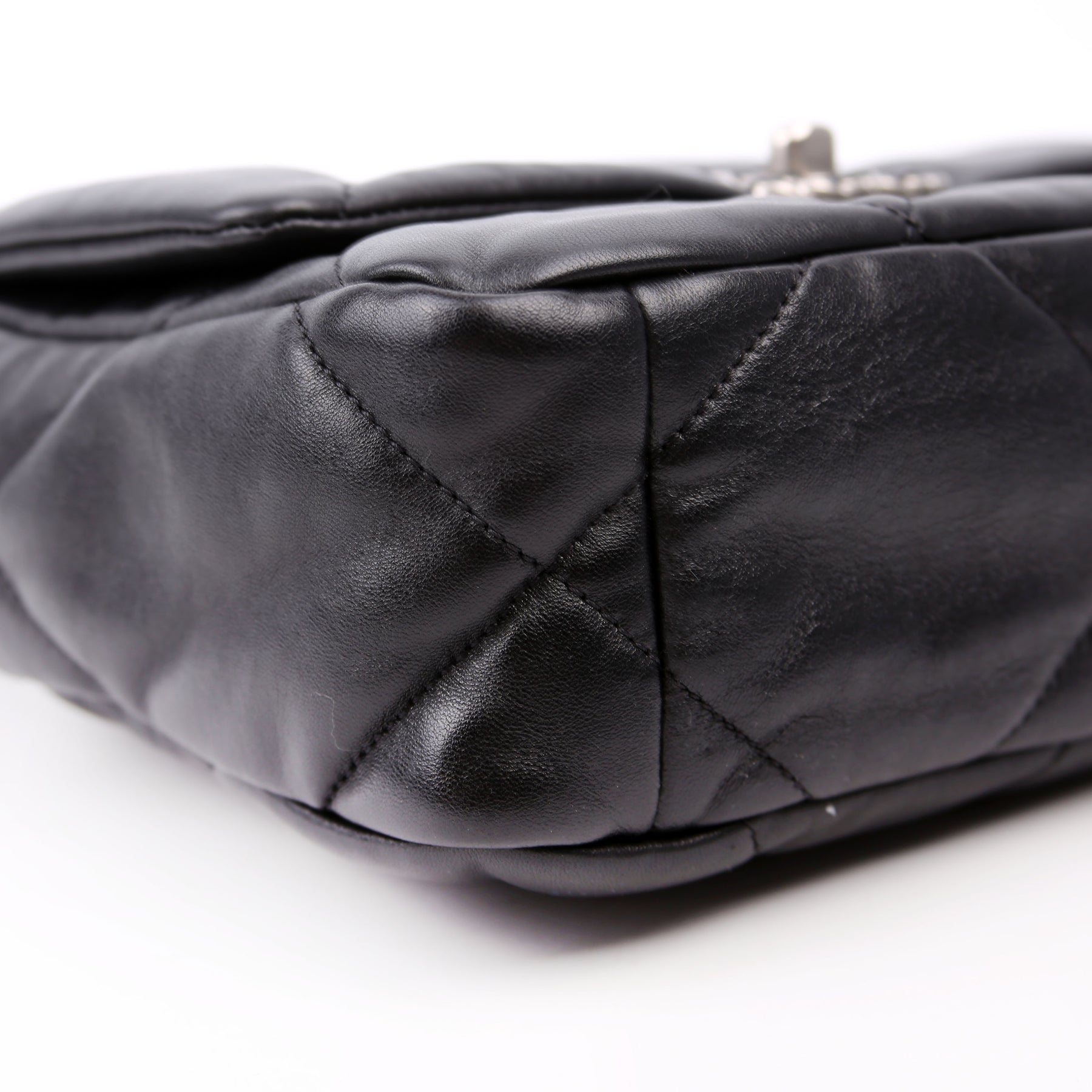 This pre-owned Chanel 19 Medium Flap is guaranteed 100% authentic. The exterior is in the classic Chanel Quilted Goatskin leather.