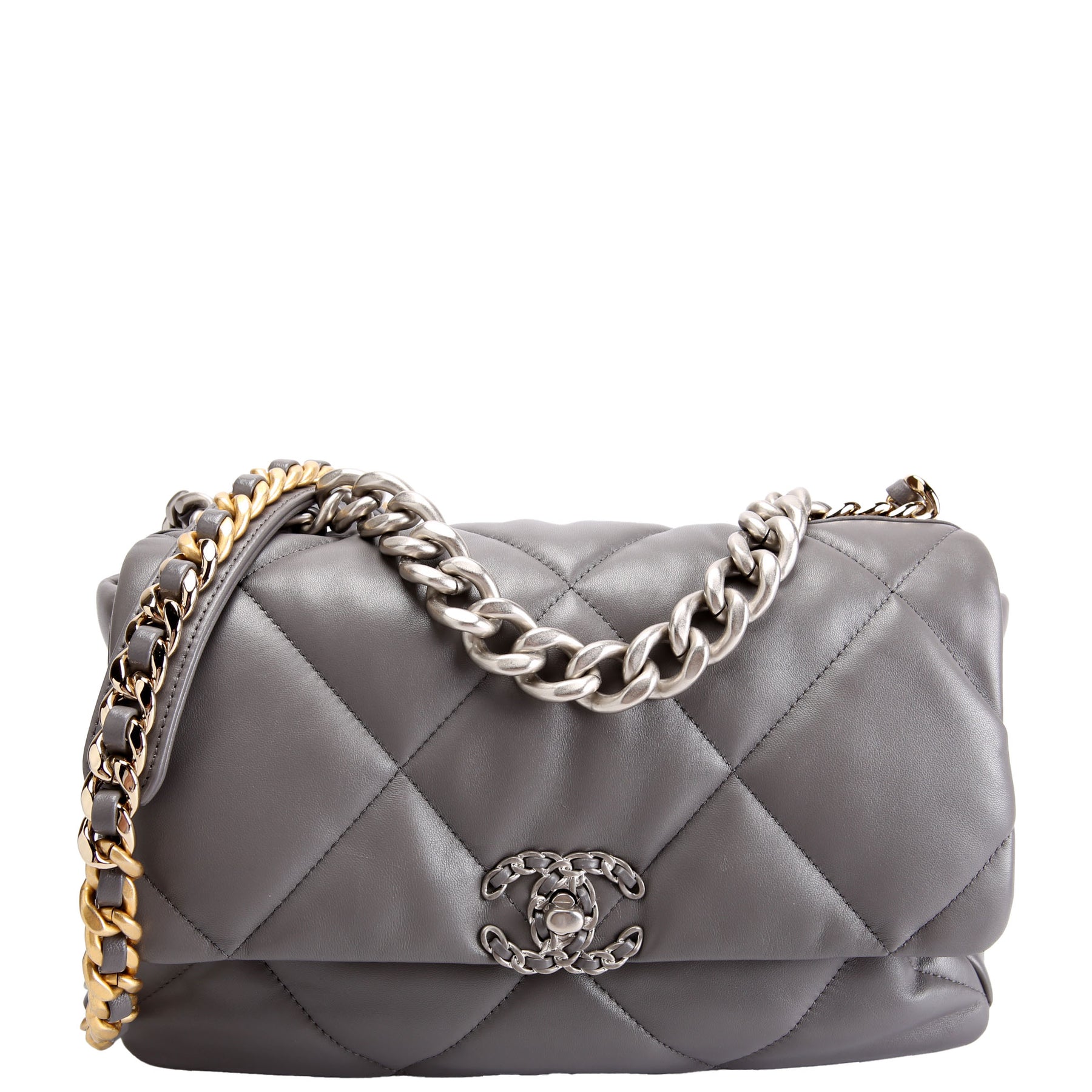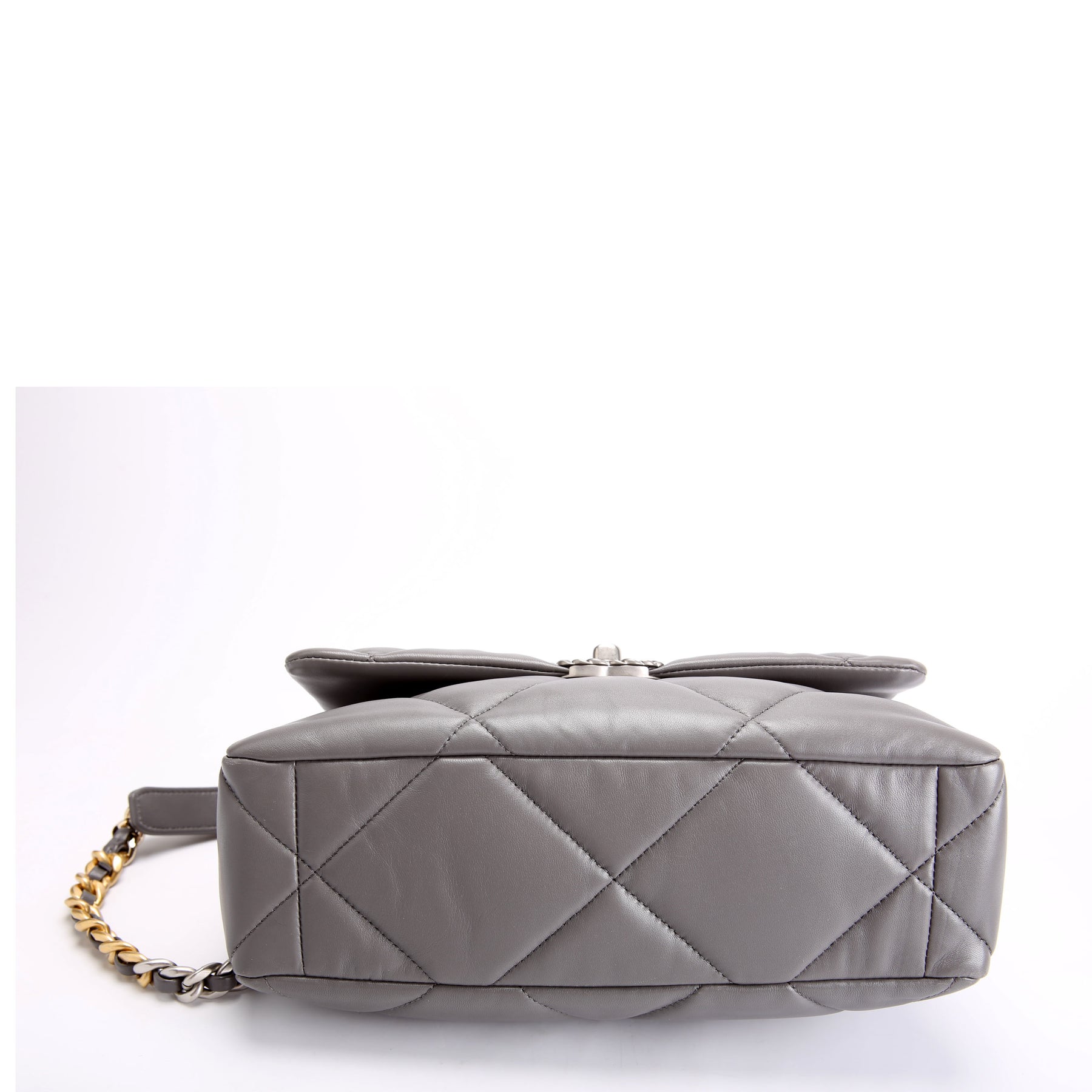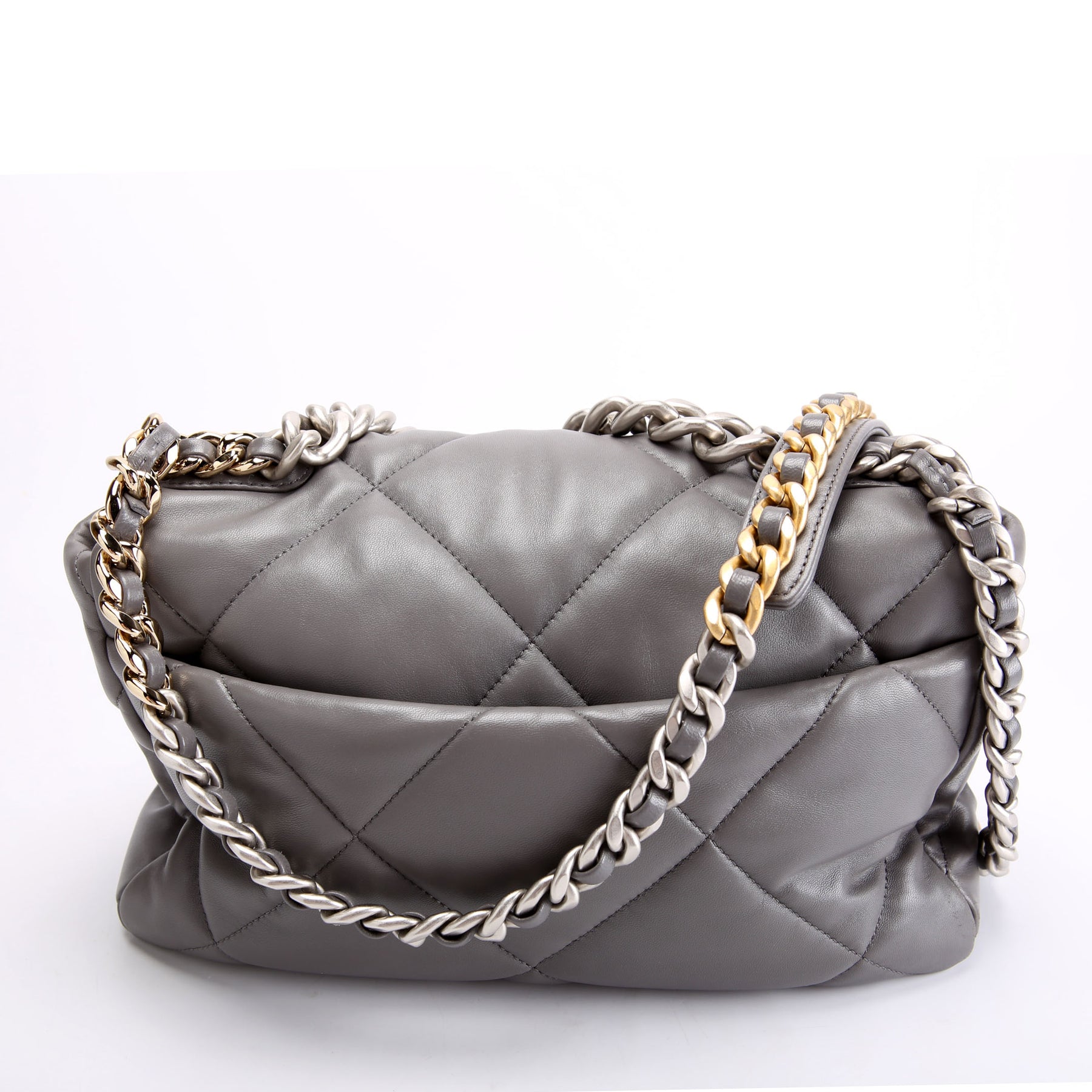 This pre-owned Chanel Quilted Goatskin 19Medium Flap RFID is guaranteed 100% authentic. The exterior is in the classic Chanel Goatskin leather.