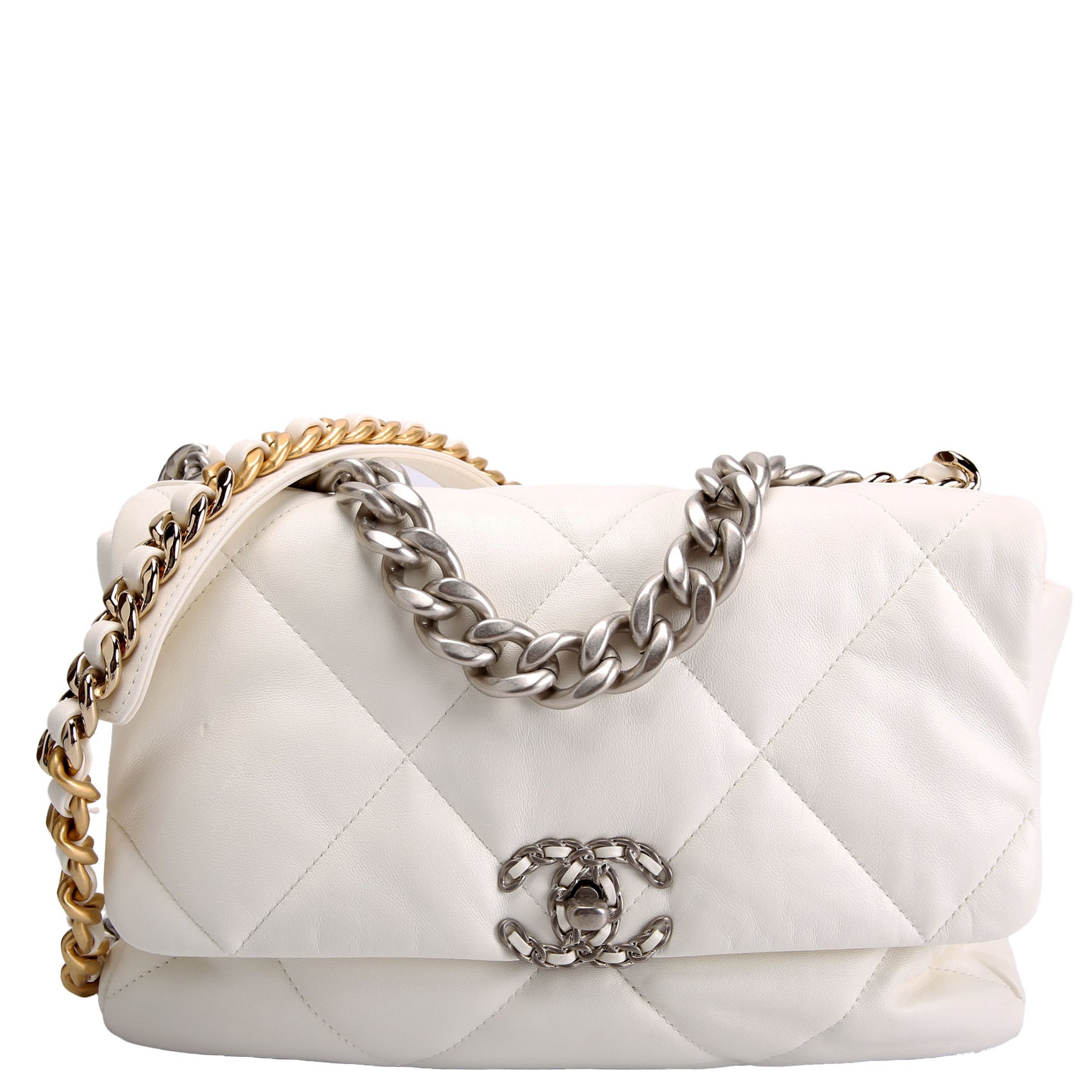 This pre-owned Chanel Quilted Goatskin 19 Medium Flap RFID is guaranteed 100% authentic. The exterior is in the classic Chanel Goatskin leather.