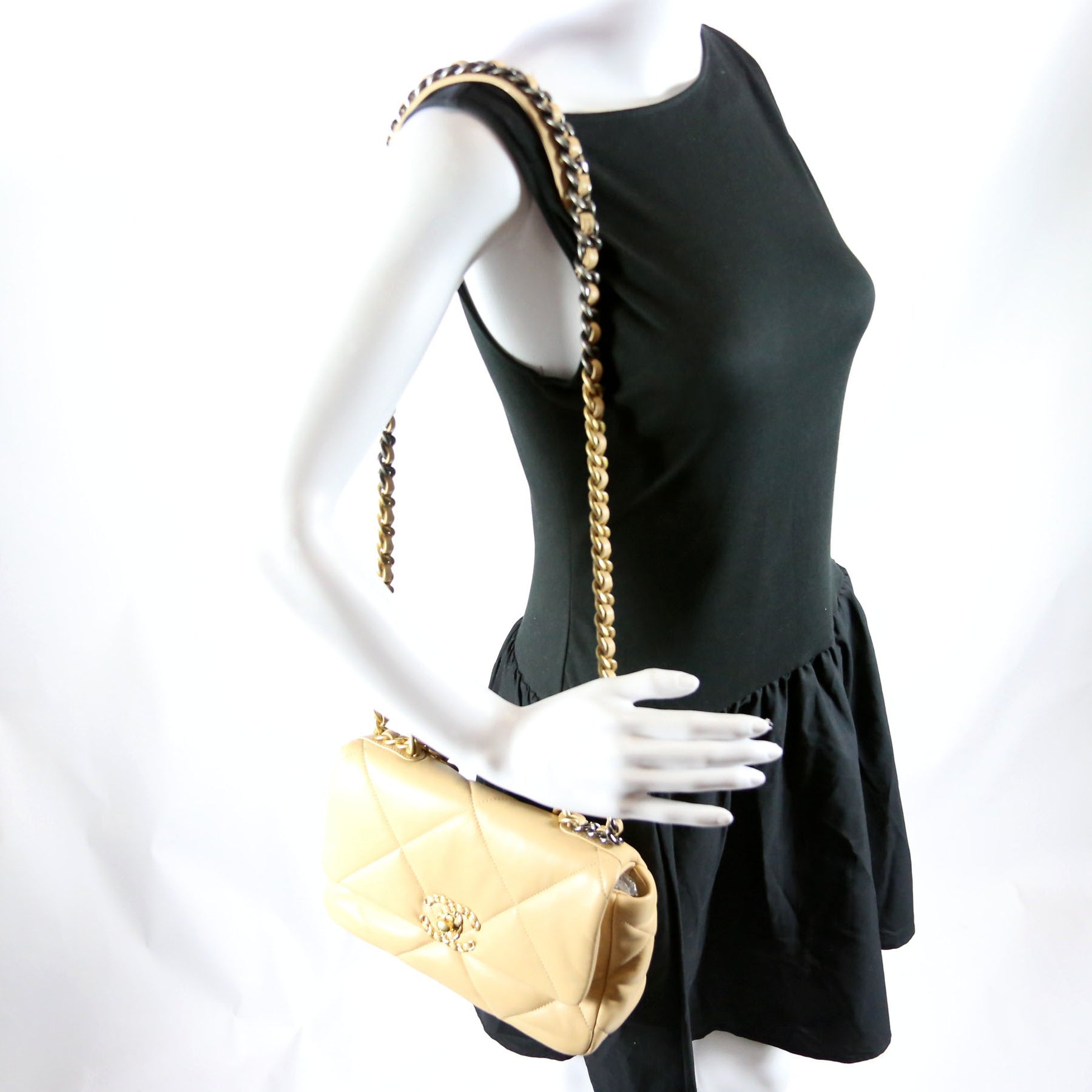 This pre-owned Chanel 19 Medium Flap RFID is guaranteed 100% authentic. The exterior is in the classic Chanel Quilted Lambskin leather.
