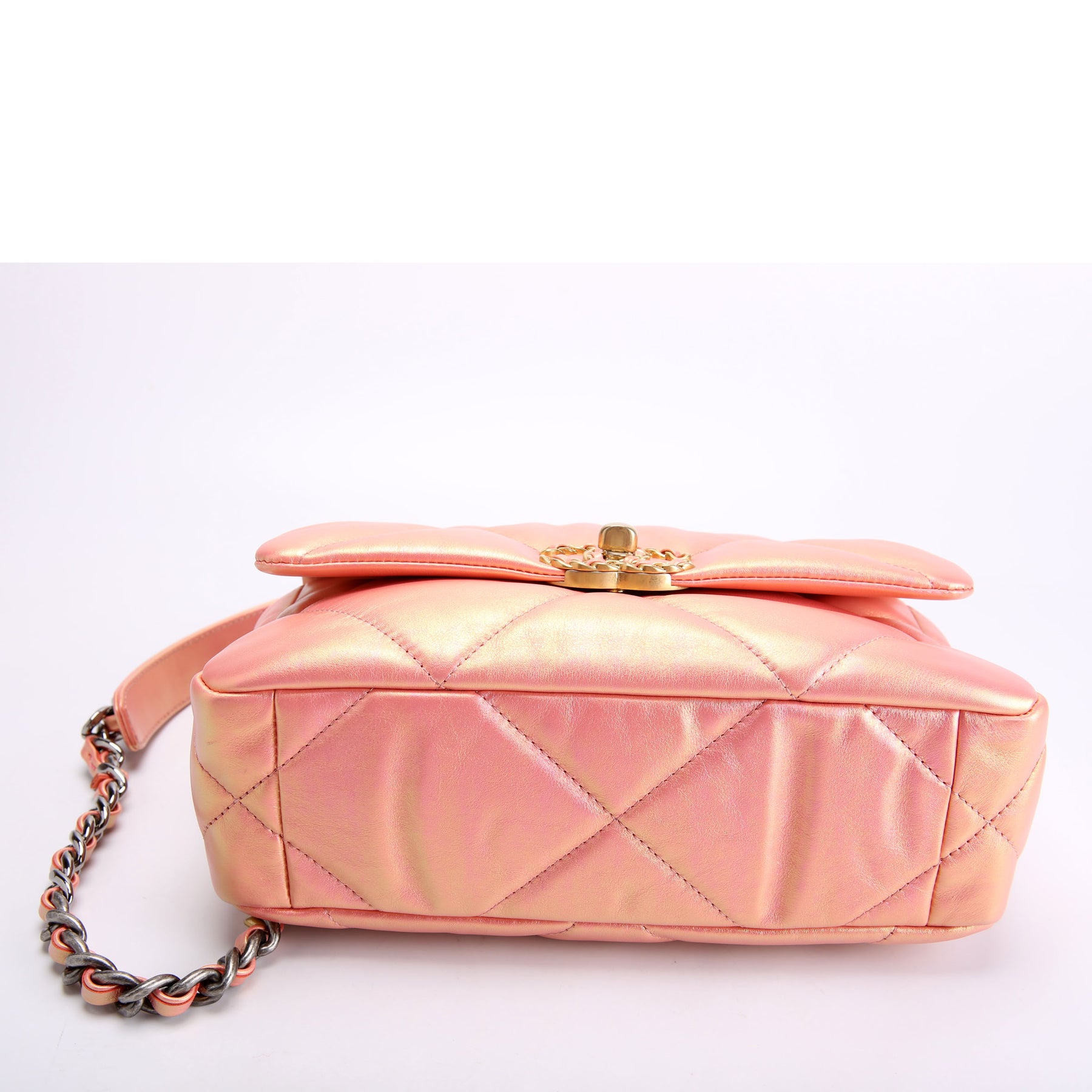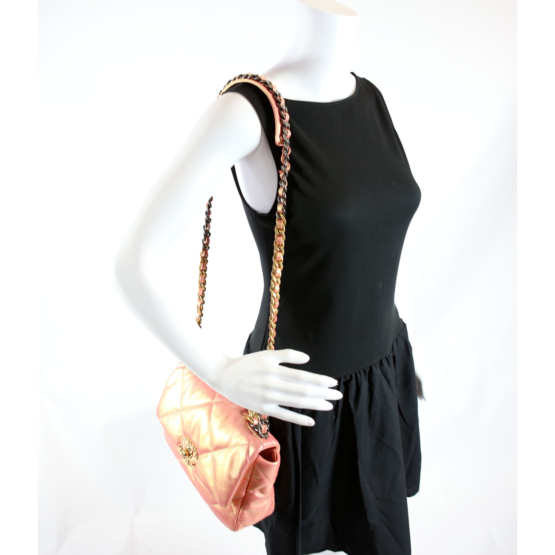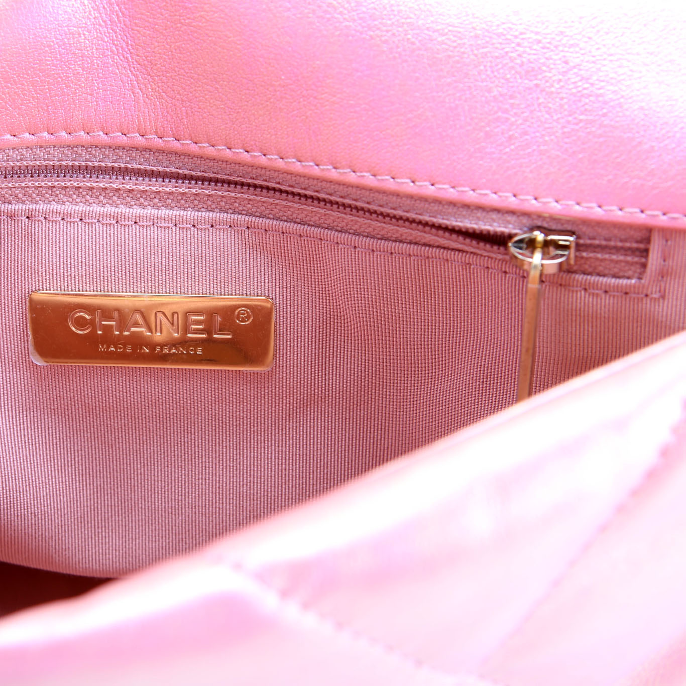 This pre-owned Chanel Quilted Metallic Lambskin 19 Small Flap is guaranteed 100% authentic. The exterior is in the classic Chanel Lambskin leather.