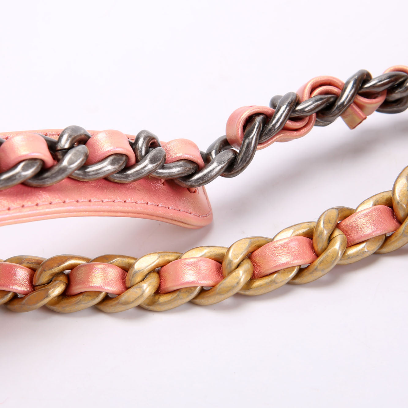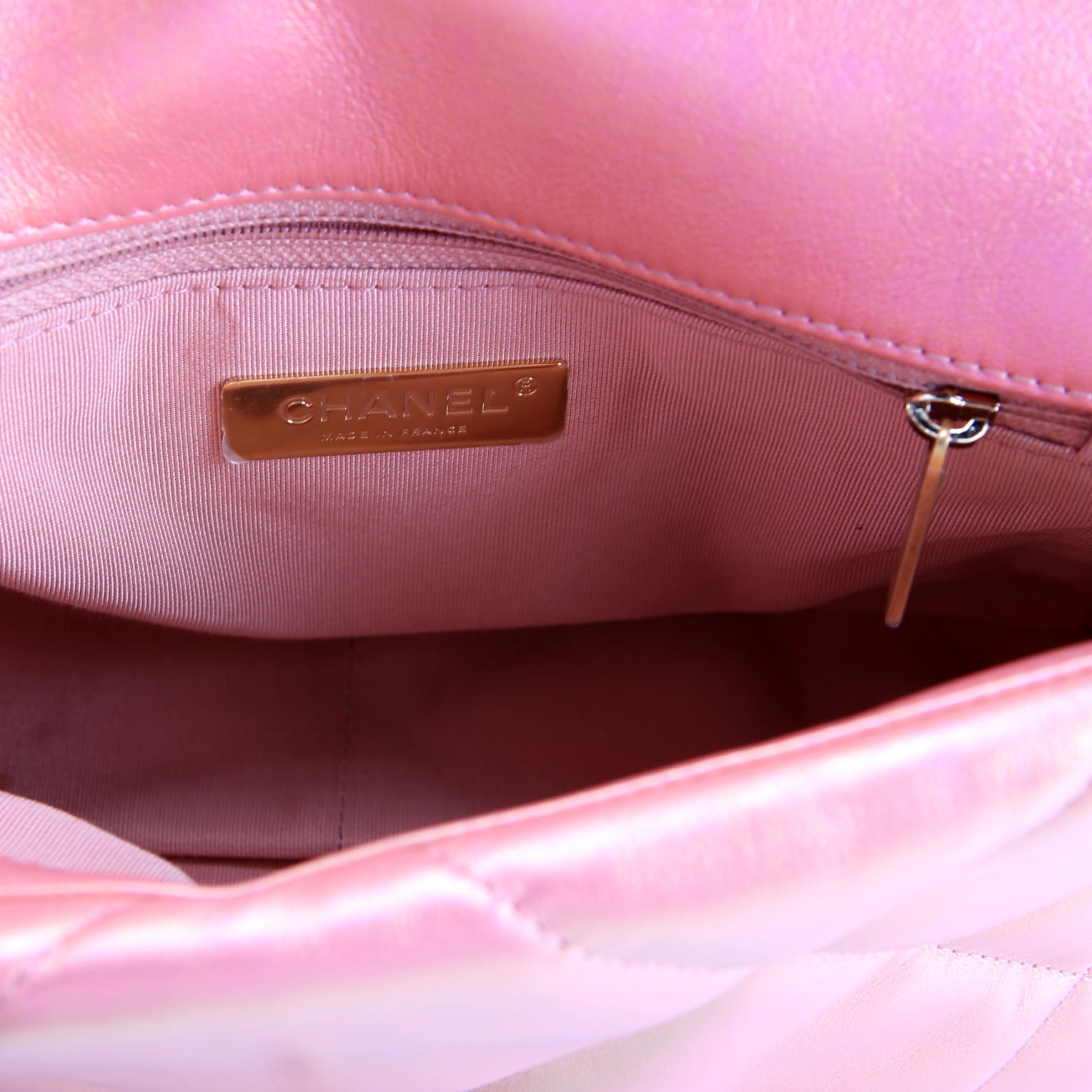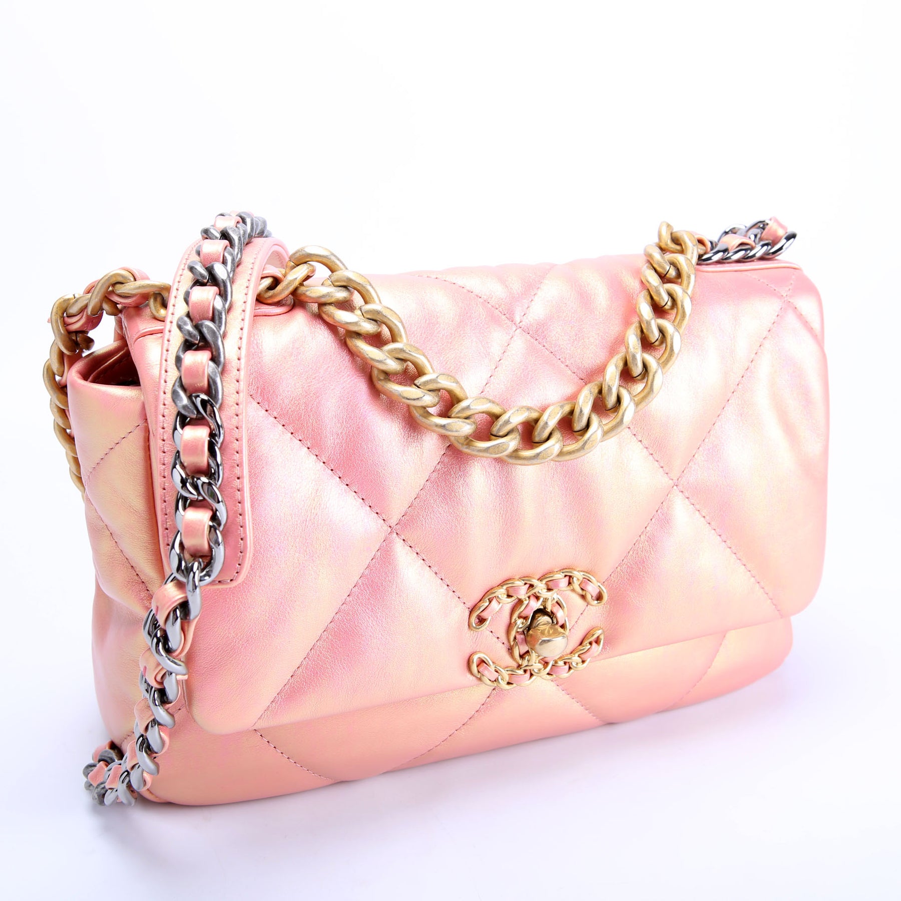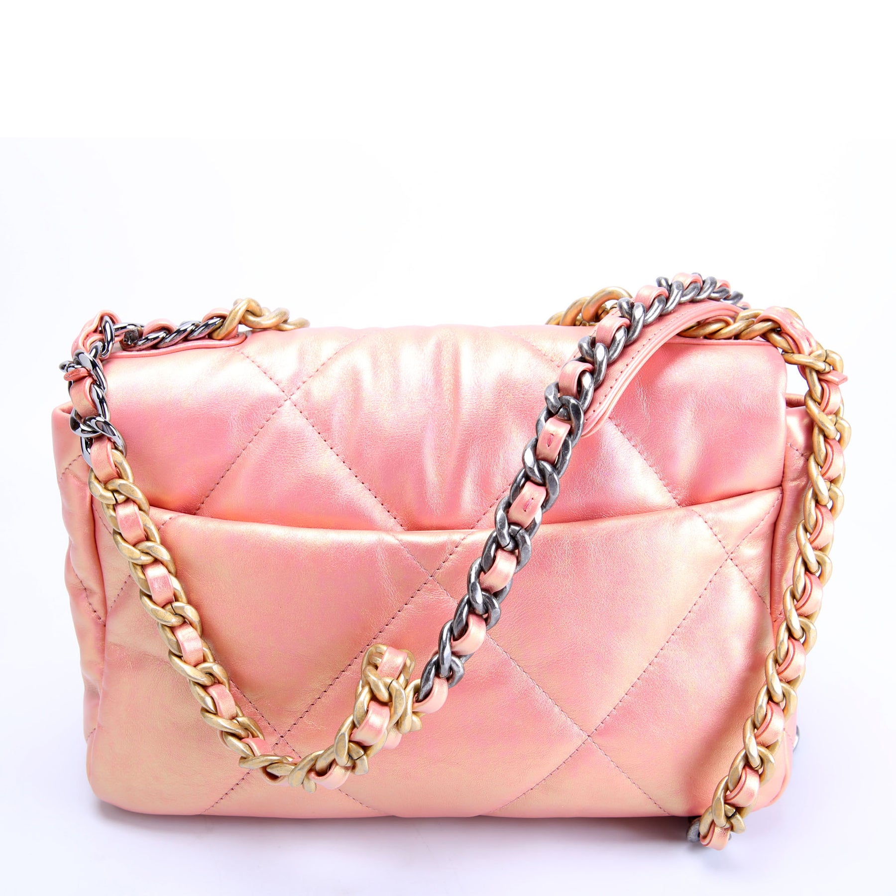 This pre-owned Chanel Quilted Metallic Lambskin 19 Small Flap is guaranteed 100% authentic. The exterior is in the classic Chanel Lambskin leather.