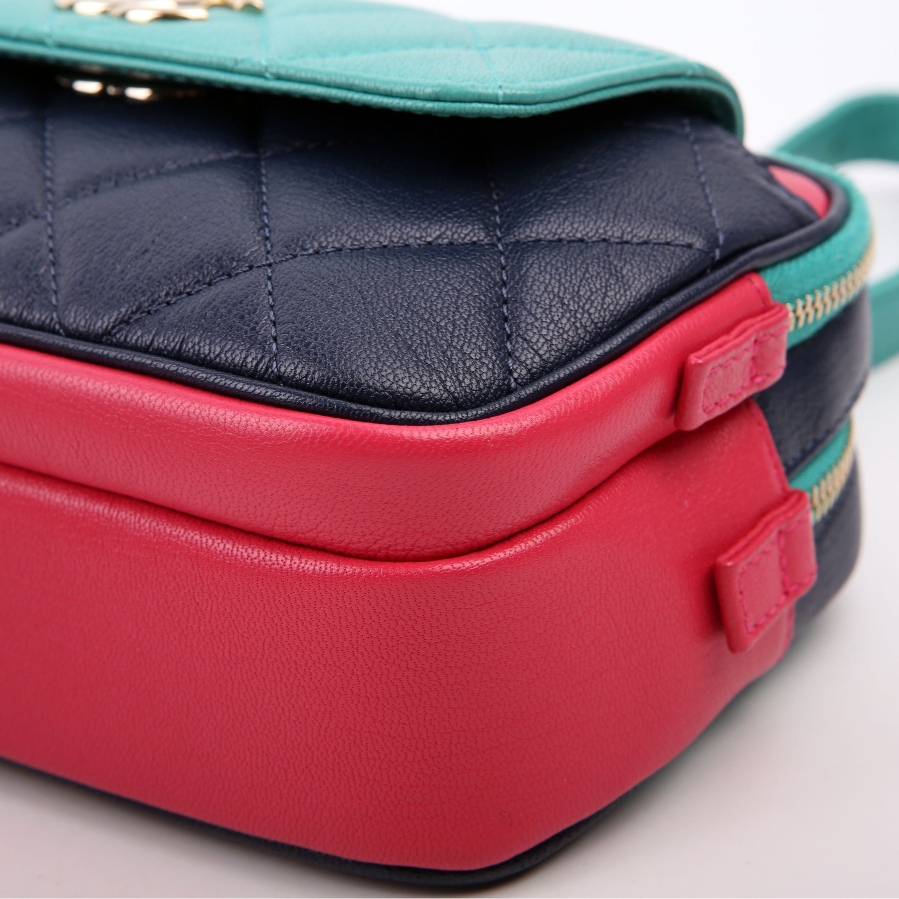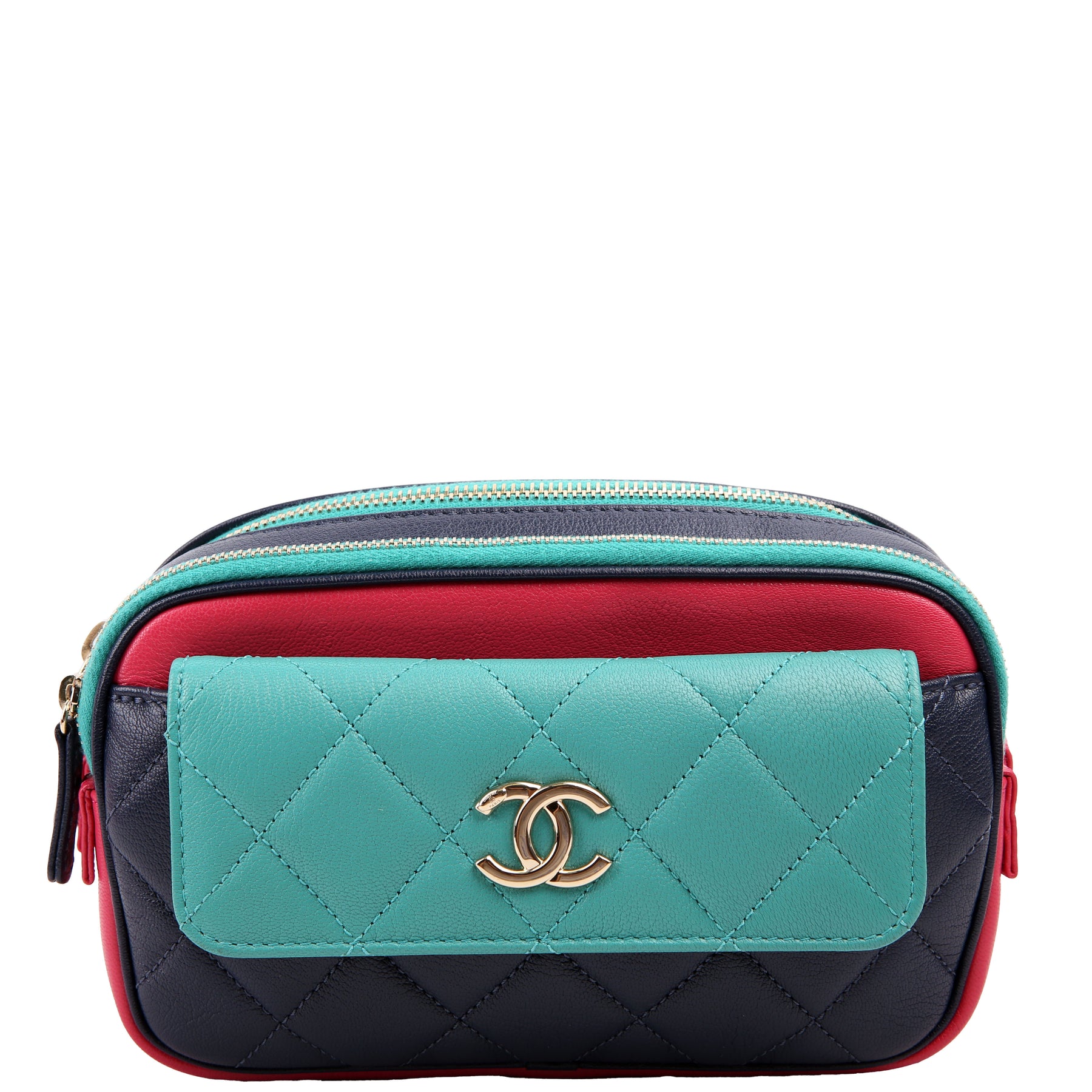 This pre-owned Chanel Tri-color In & Out Waist Bag 29M is guaranteed 100% authentic. The exterior is in the classic Chanel Goatskin leather.