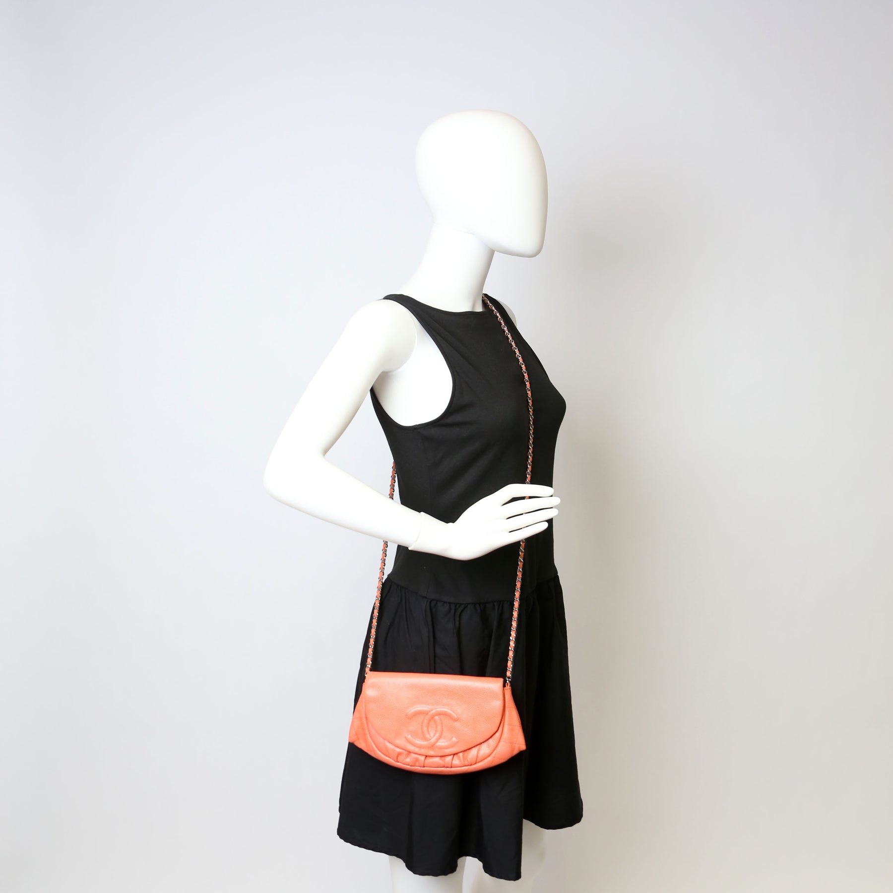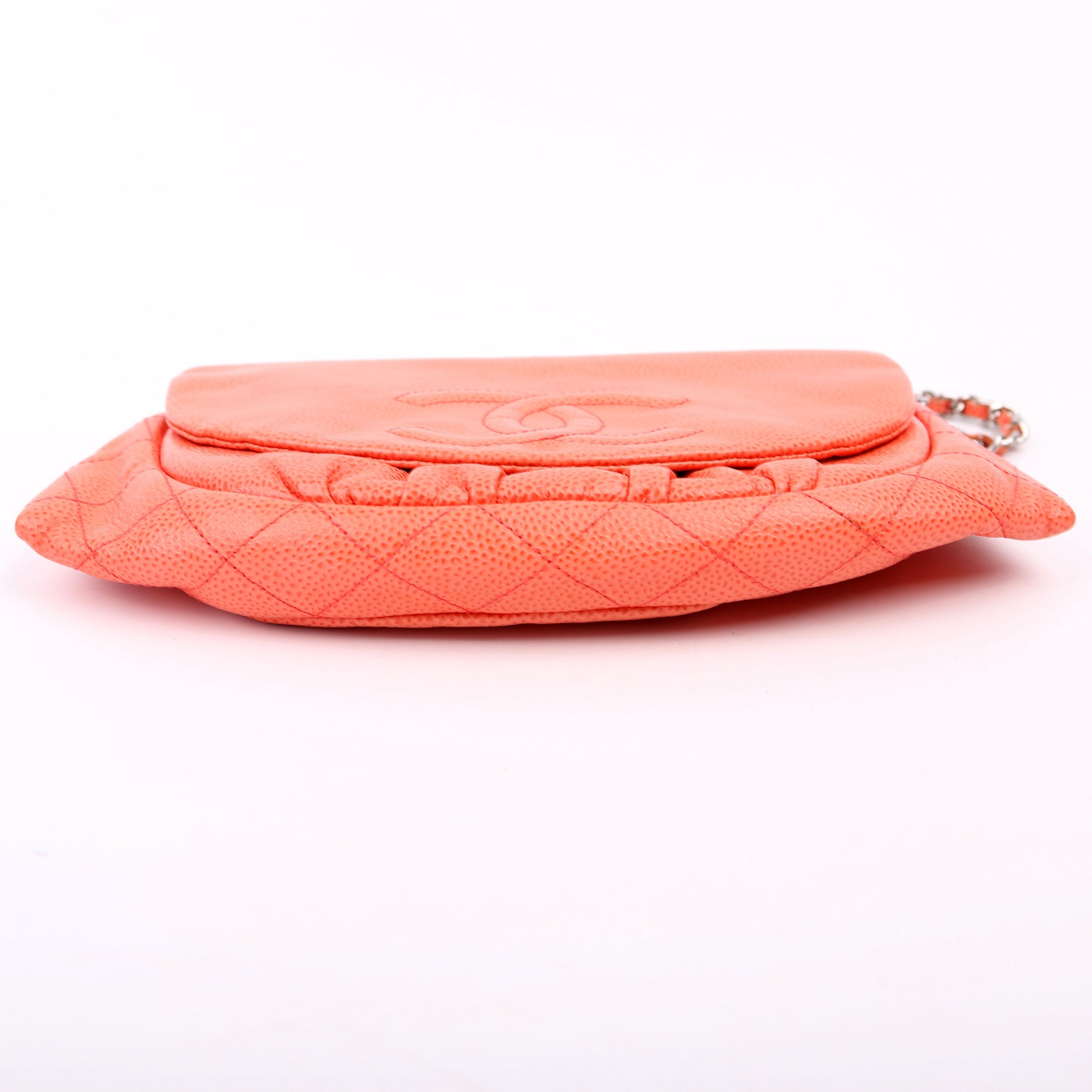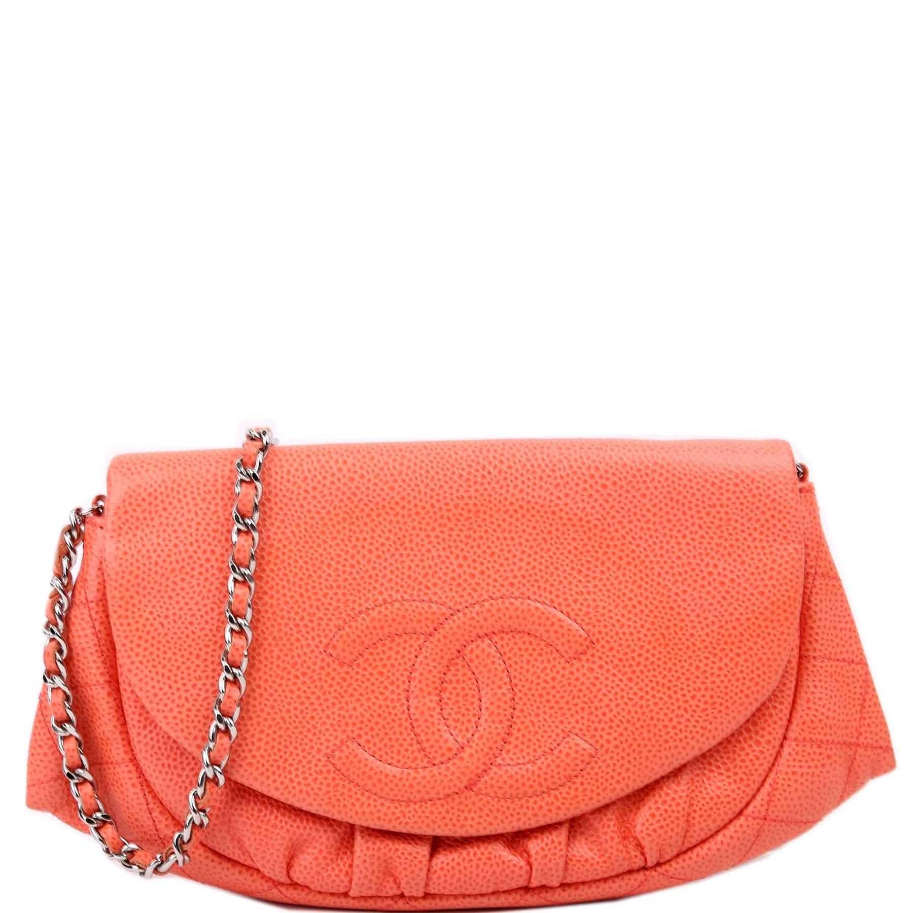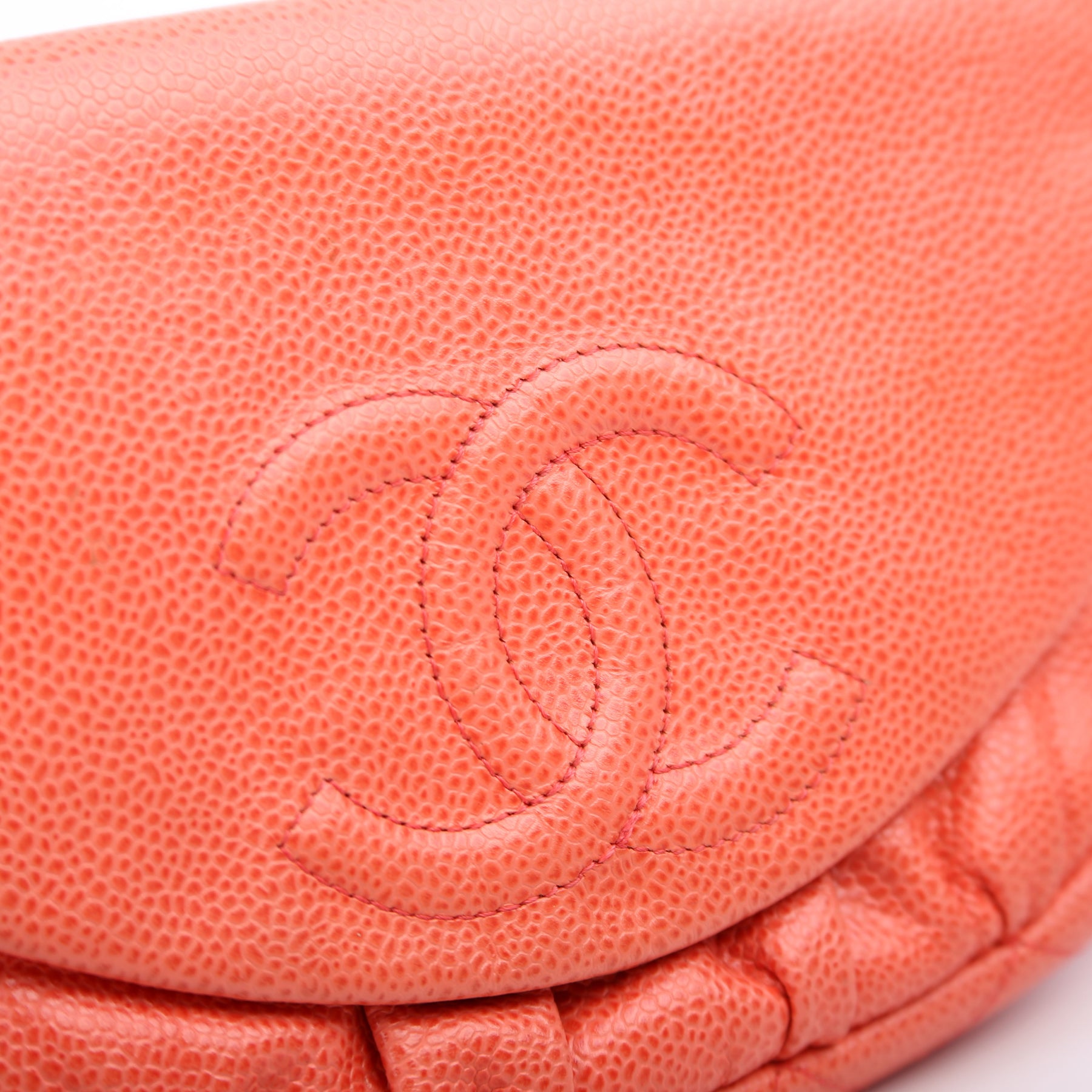 This pre-owned Chanel WOC Half Moon is guaranteed 100% authentic. The exterior is in Caviar leather.