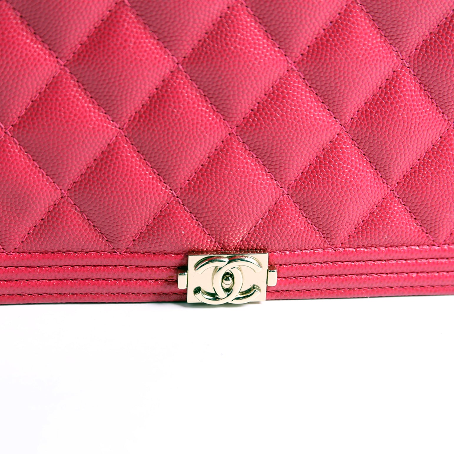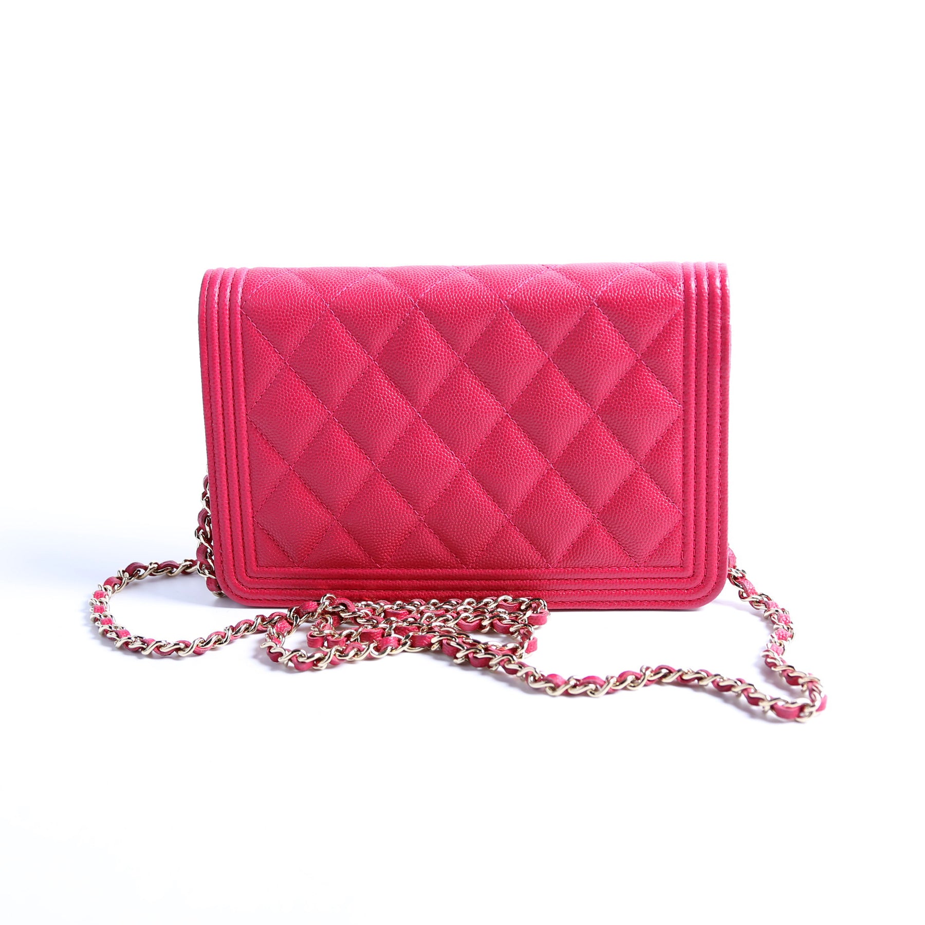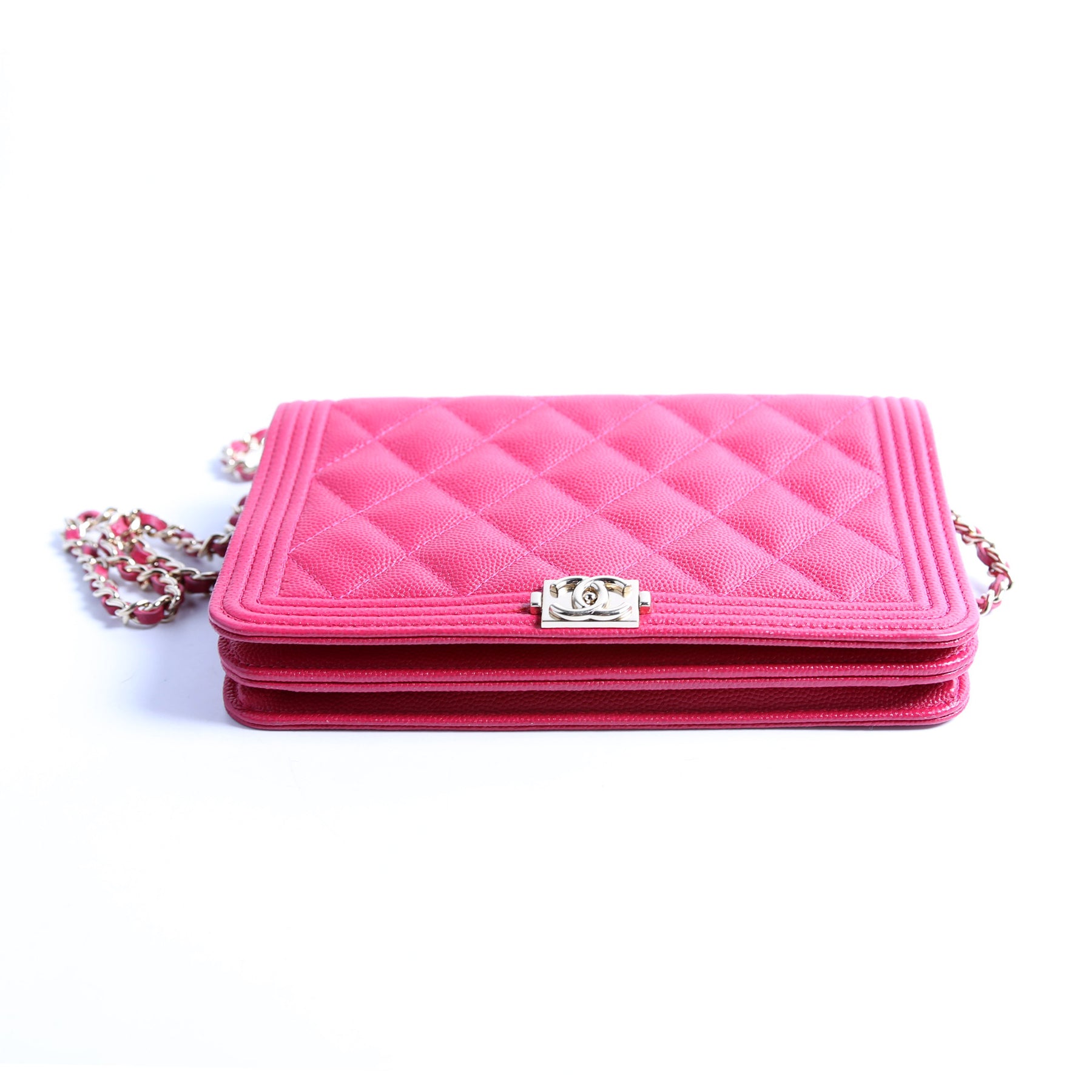 This pre-owned Chanel WOC Boy is guaranteed 100% authentic. The exterior is in the classic Chanel Caviar leather.