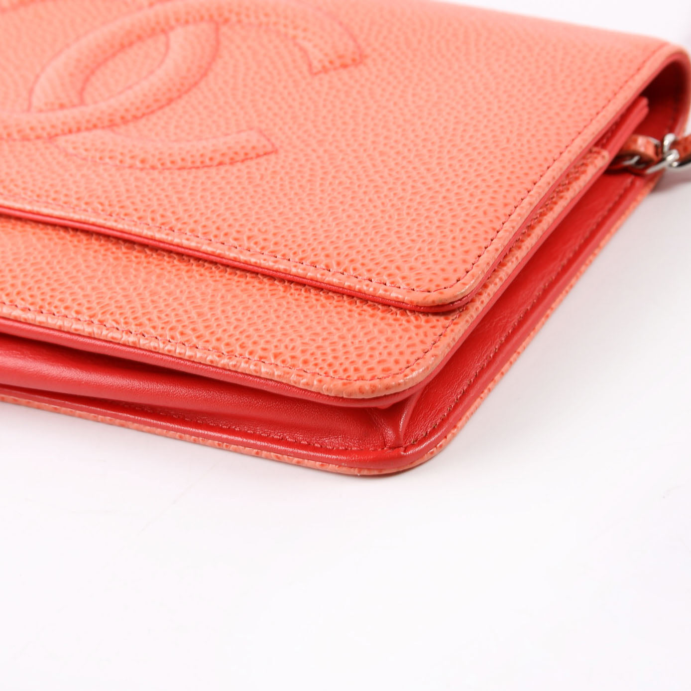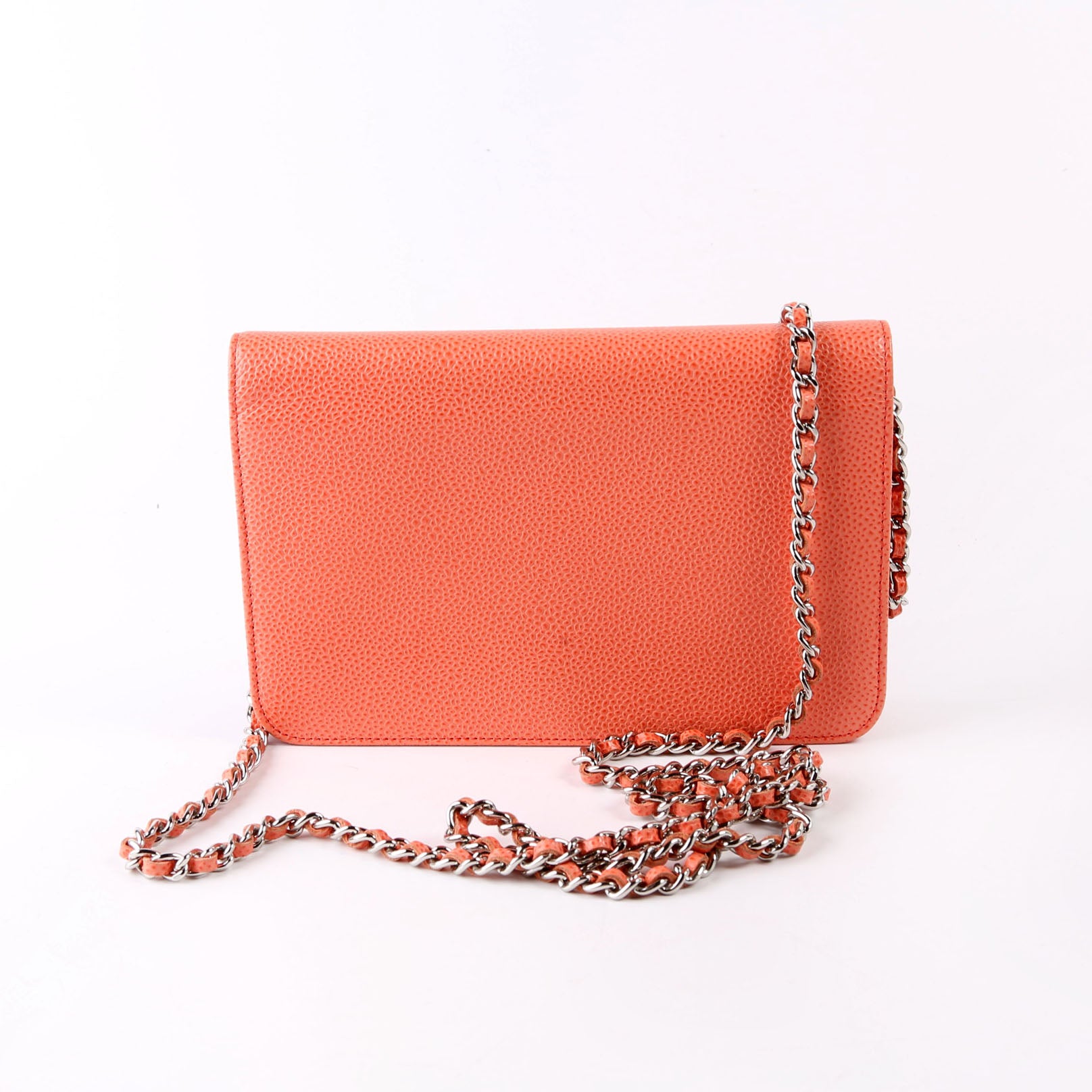 This pre-owned Chanel WOC Timeless CC is guaranteed 100% authentic. The exterior is in the classic Chanel Caviar leather.