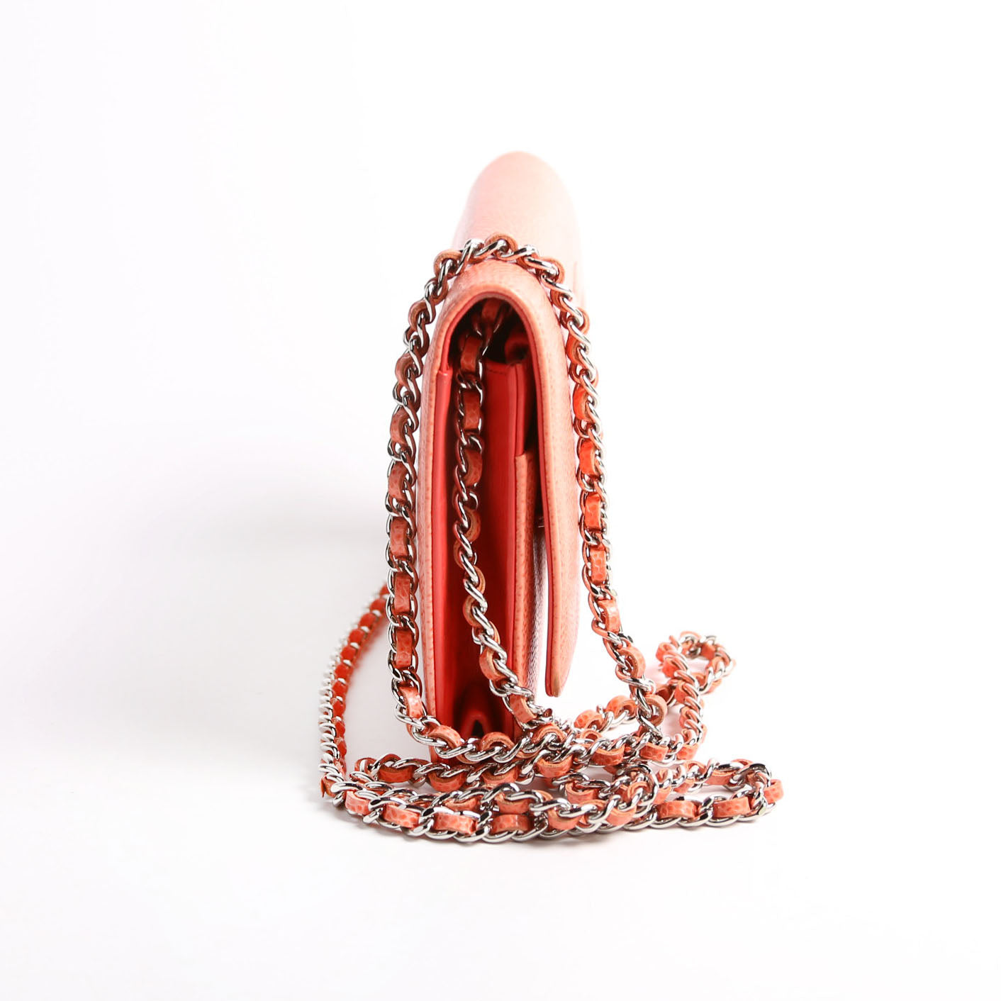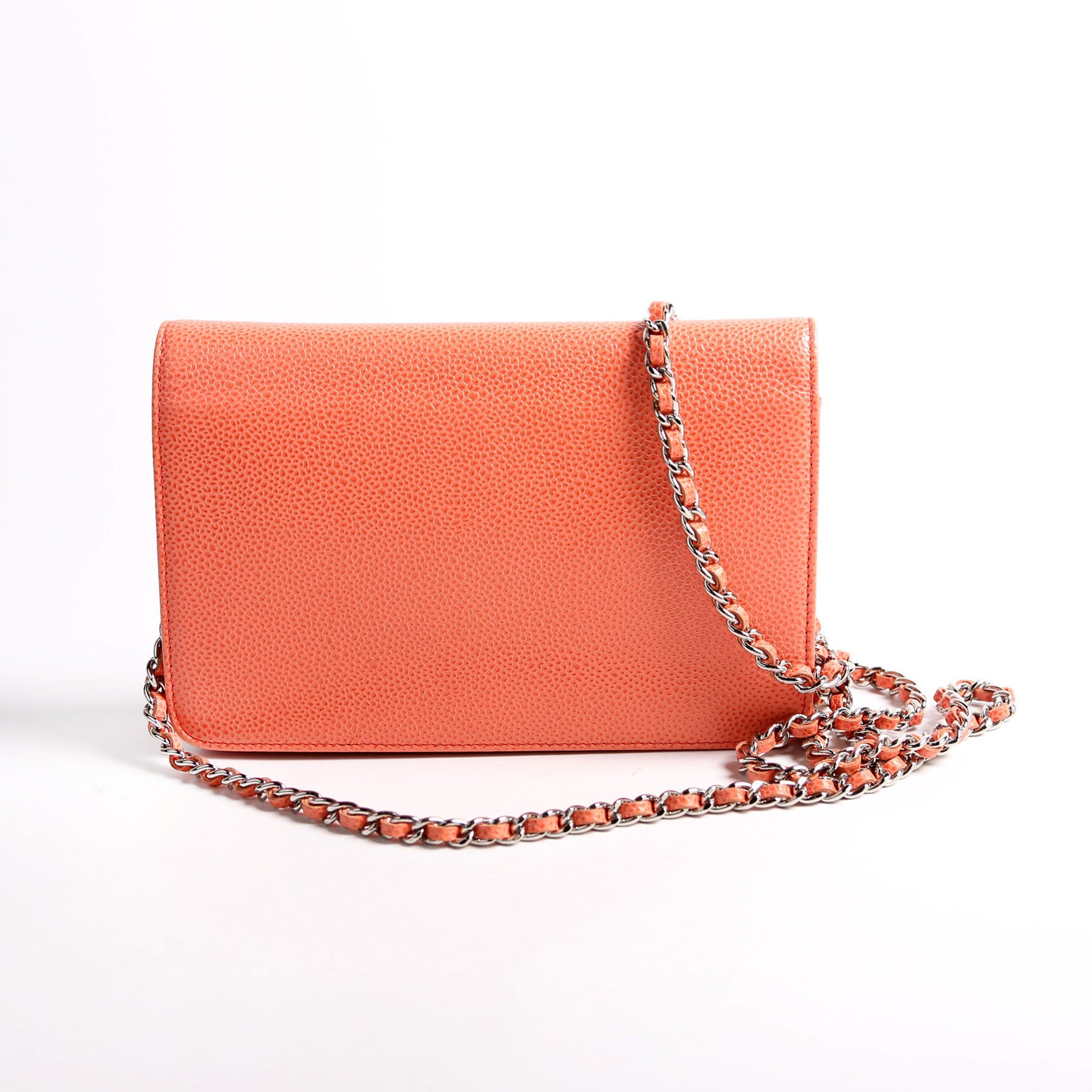This pre-owned Chanel WOC Timeless CC is guaranteed 100% authentic. The exterior is in the classic Chanel Caviar leather.
