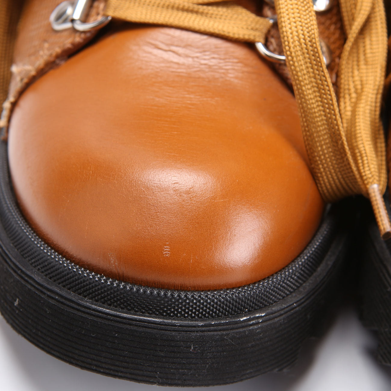Exterior: The exterior shows creasing throughout. They also show minor scuff marks. There is slight damage to the right shoe near the toe box. The laces show minor wear.