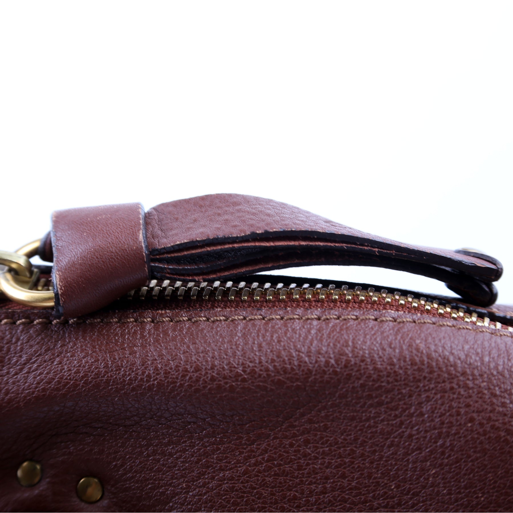 Exterior: The exterior leather is free of any rips or cracks. The exterior features one flap pocket. The corners show fading and wear. There are minor scuffs throughout.