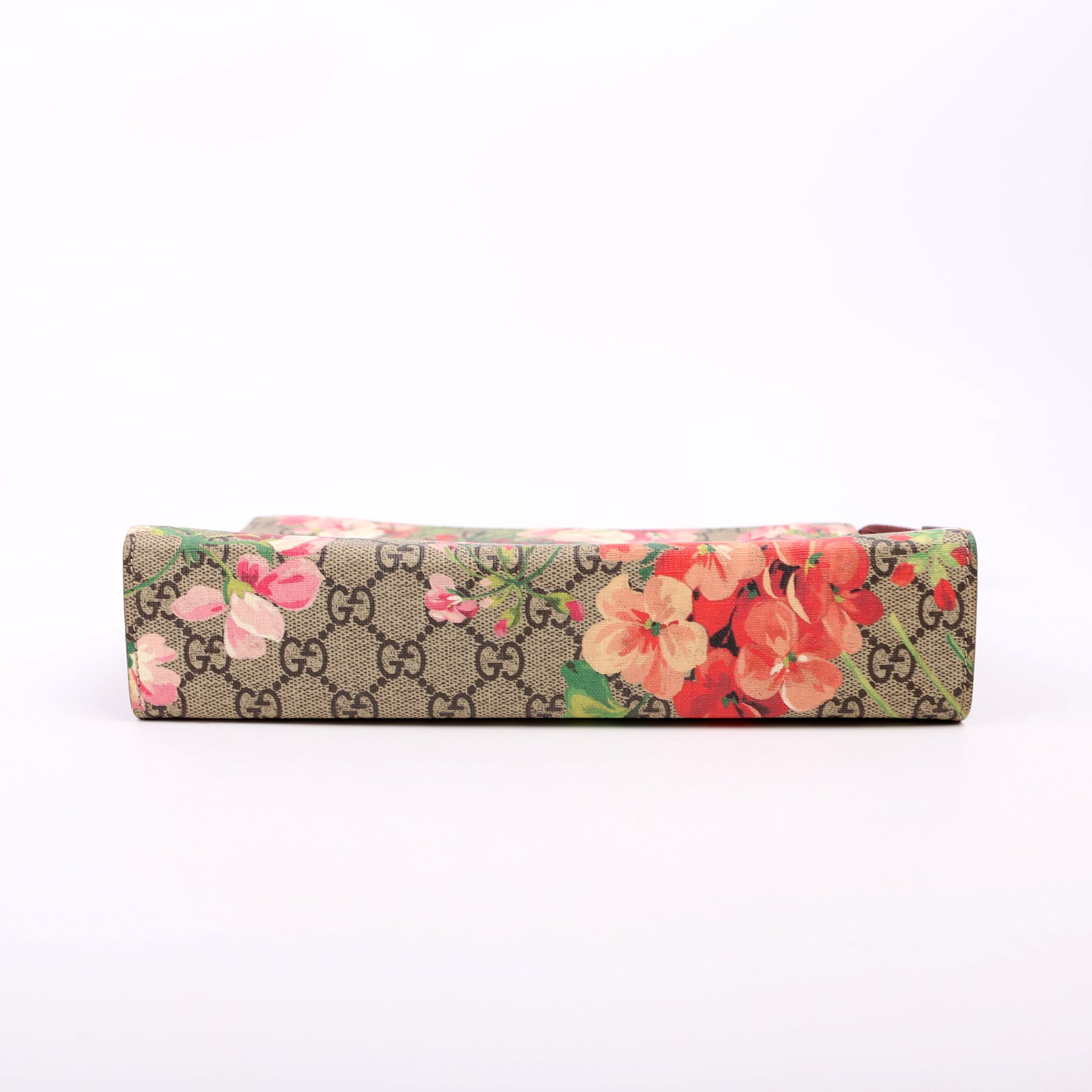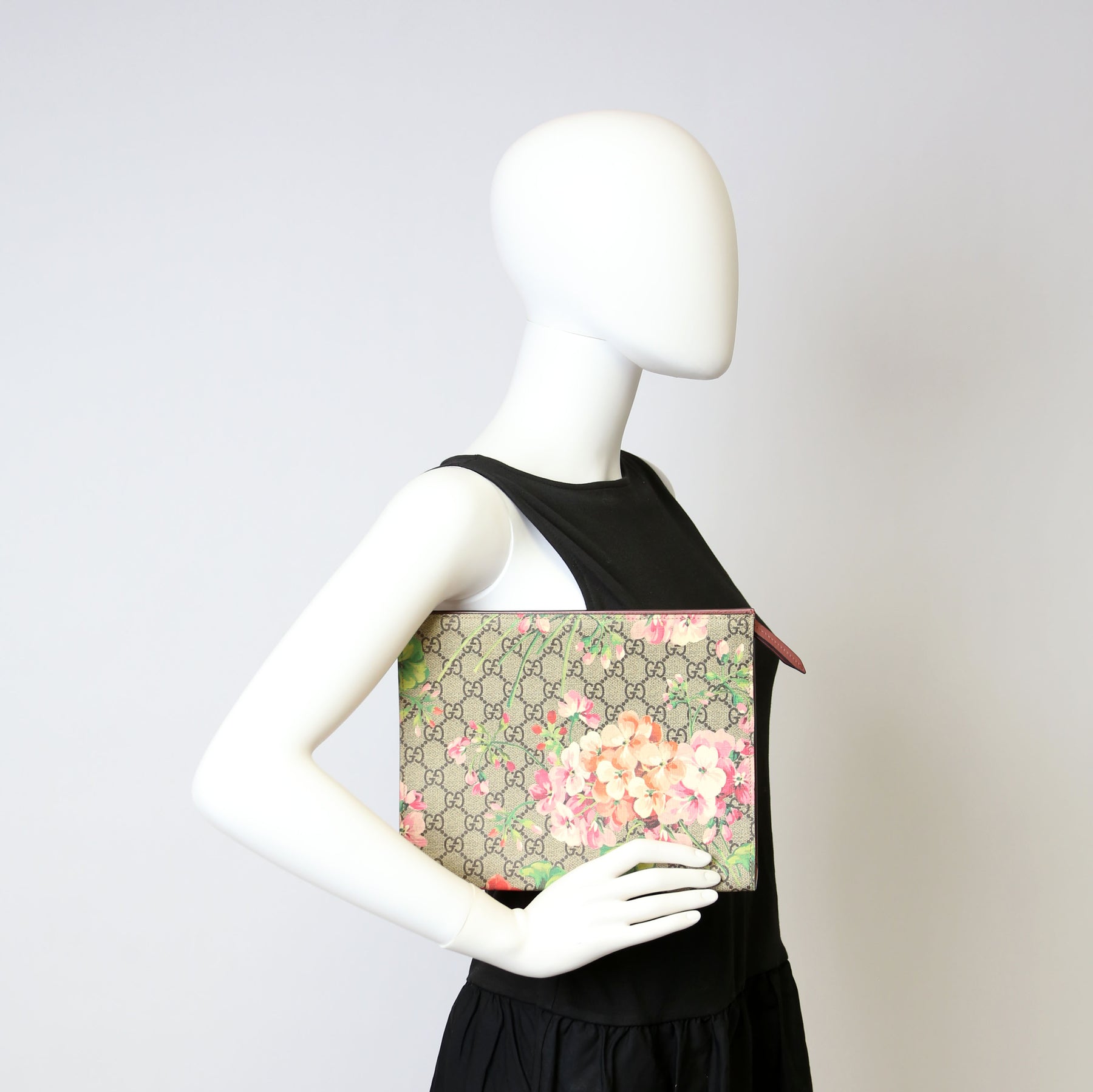 This pre-owned Gucci GG Blooms Cosmetic Pouch is guaranteed 100% authentic. The exterior is in the classic Gucci GG Supreme coated canvas.