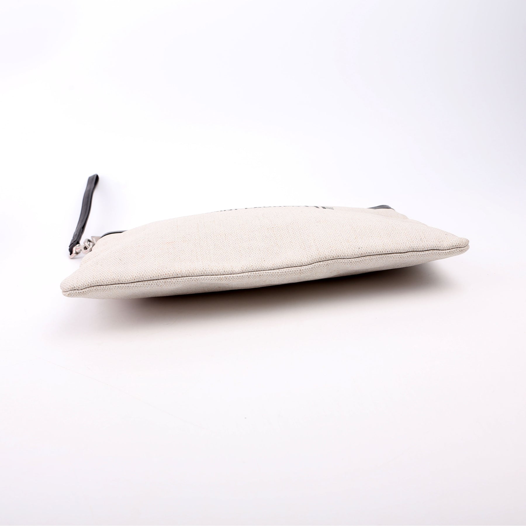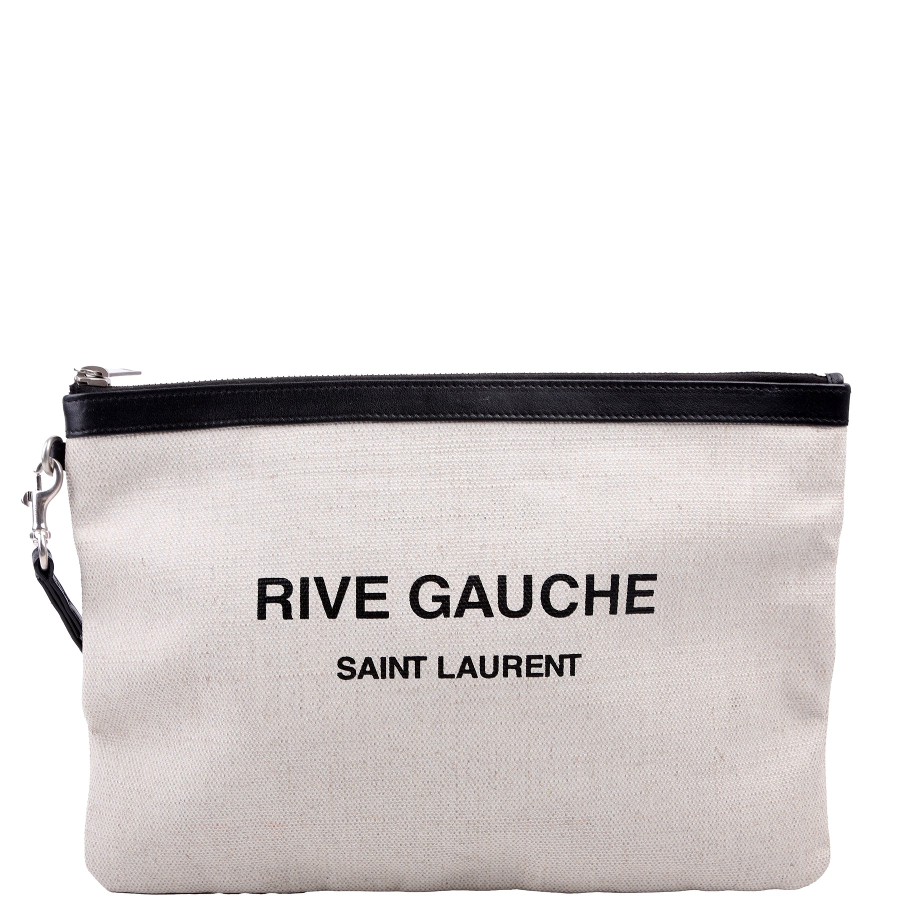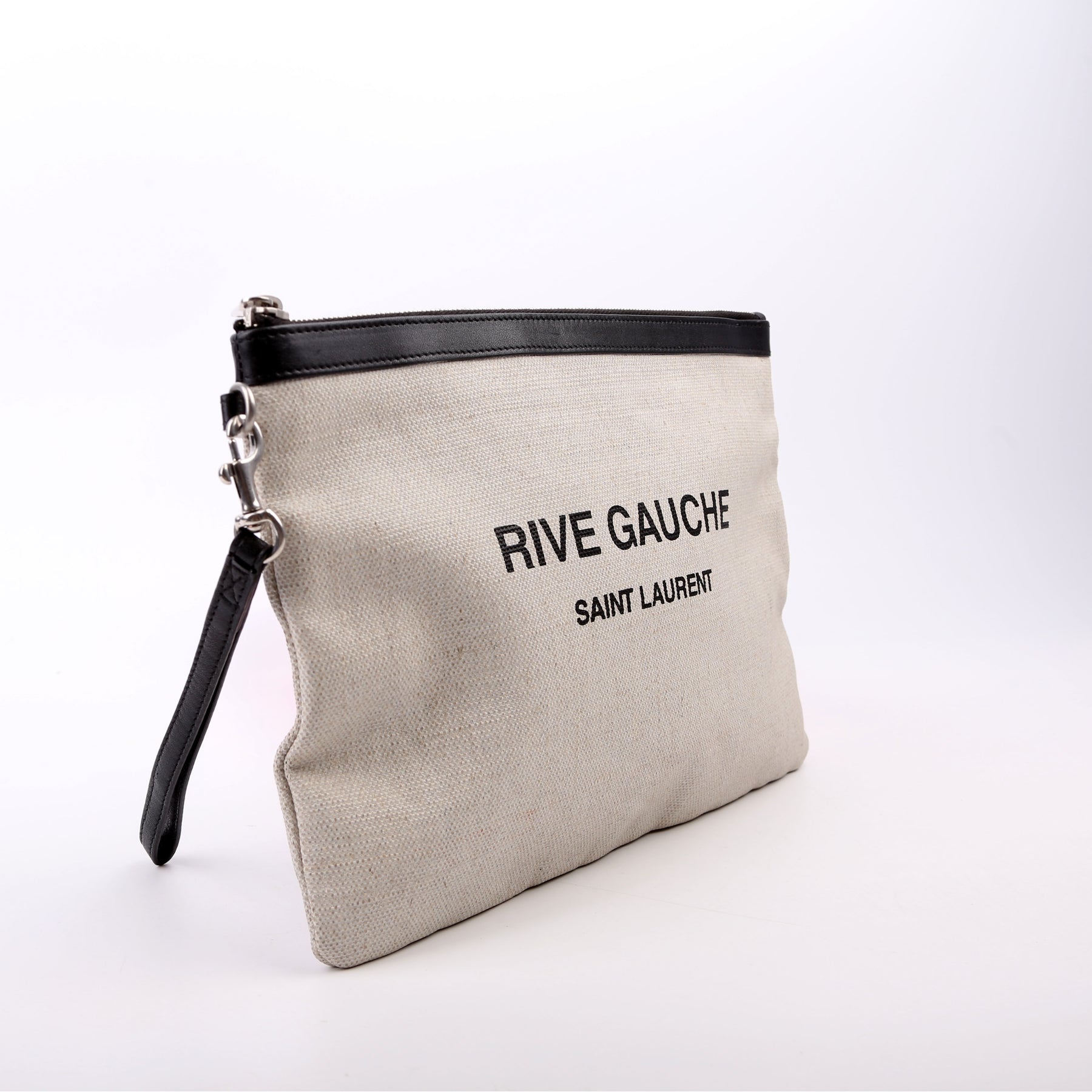 This pre-owned Saint Laurent Rive Gauche Wristlet Pouch is guaranteed 100% authentic. The exterior is in the classic Saint Laurent canvas.