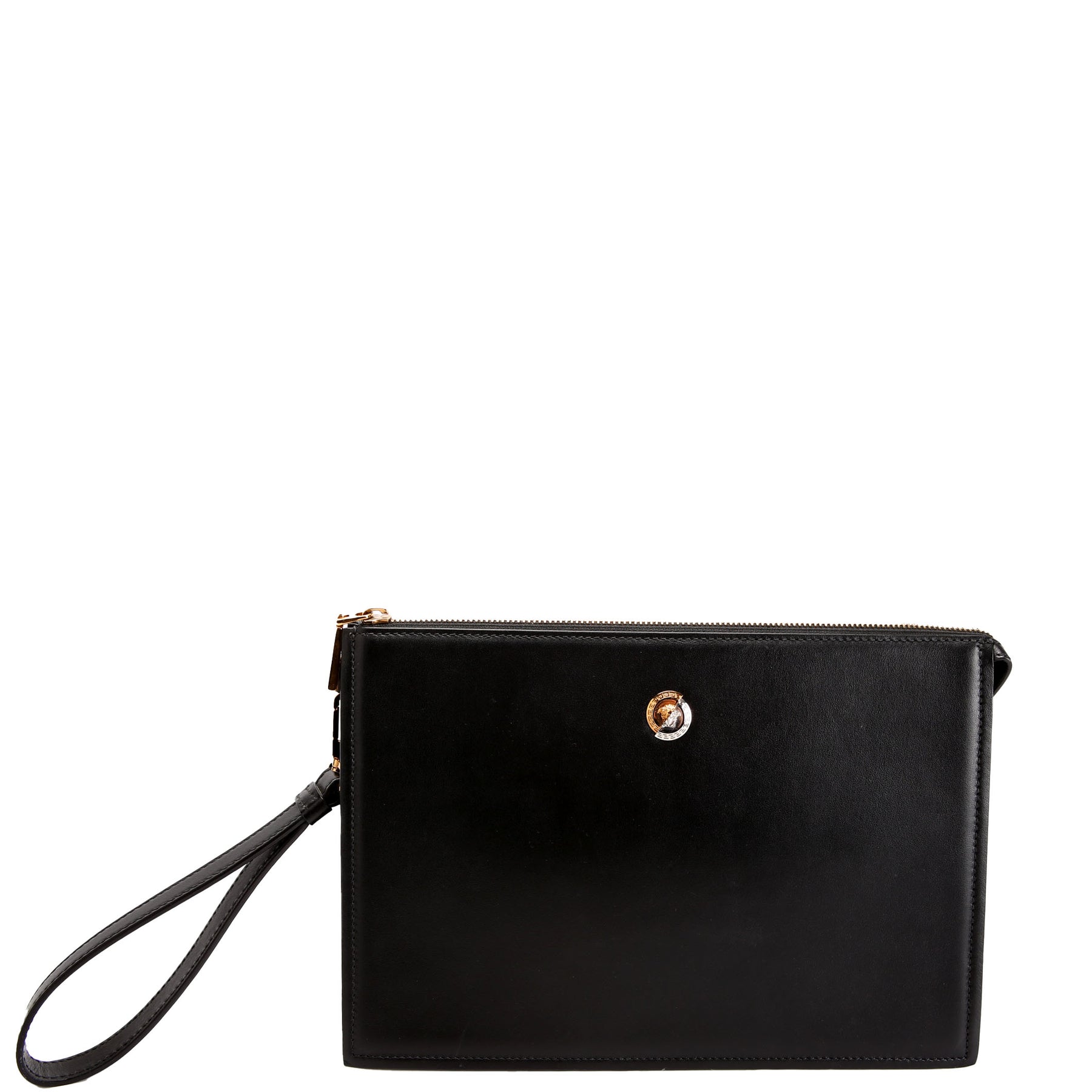 This pre-owned Versace Tribute Icon Zip Pouch is guaranteed 100% authentic. The exterior is in the classic Versace Calfskin Leather.