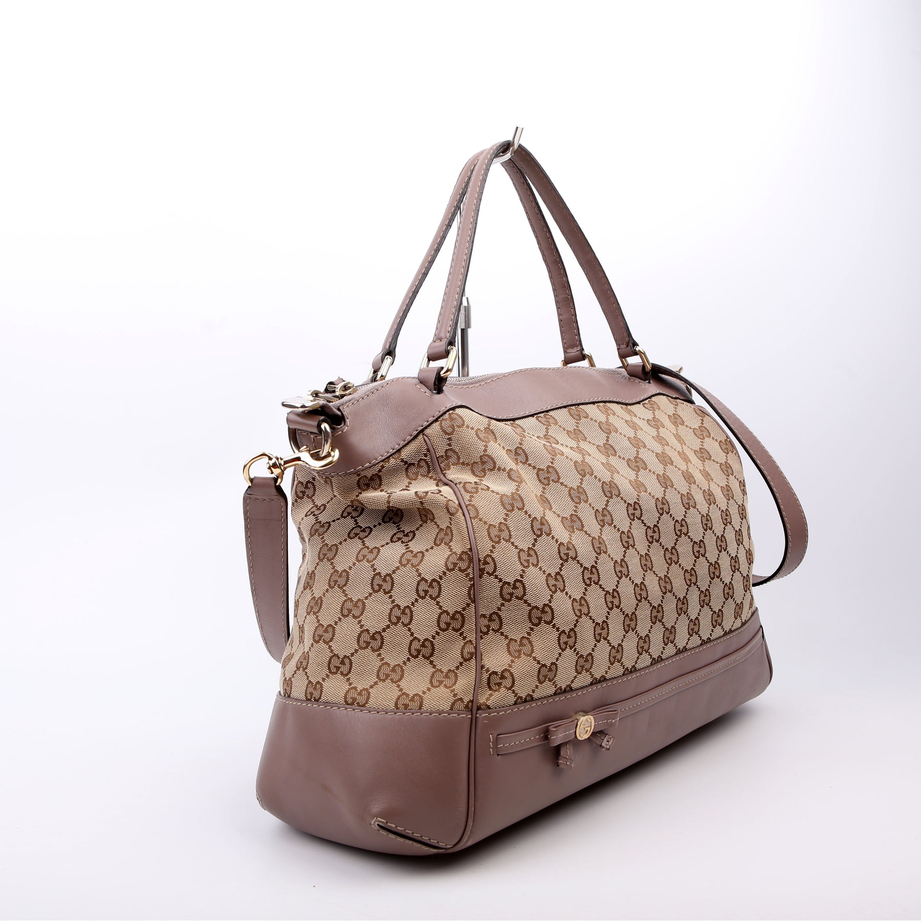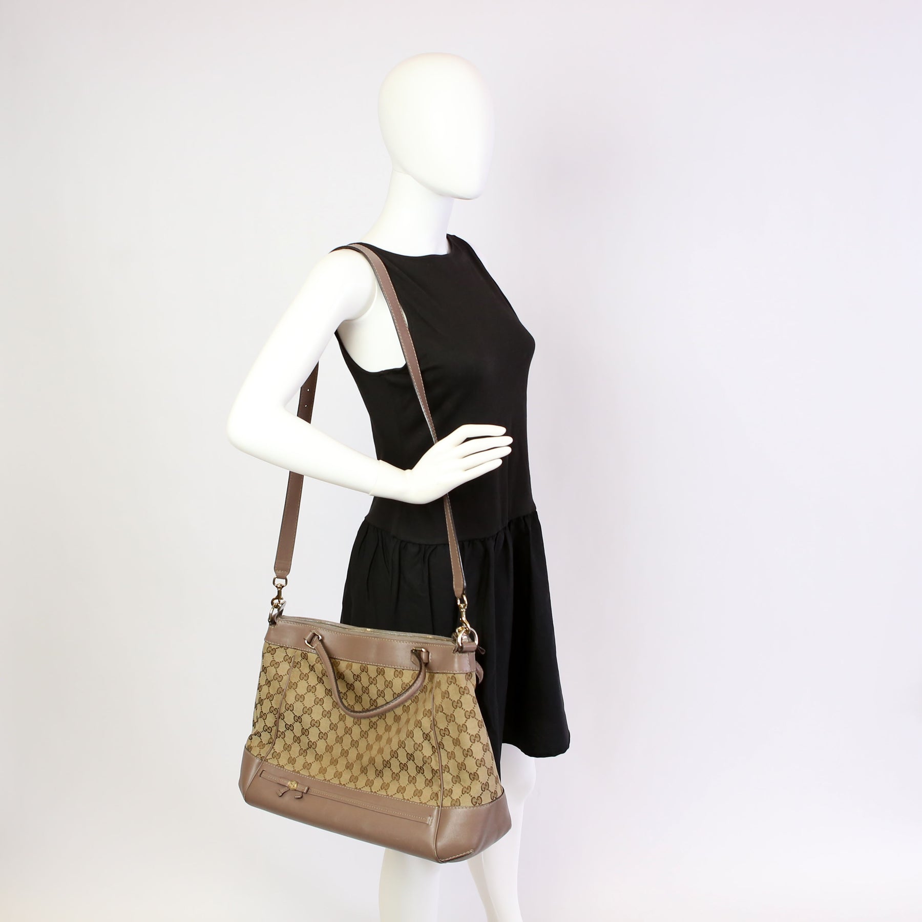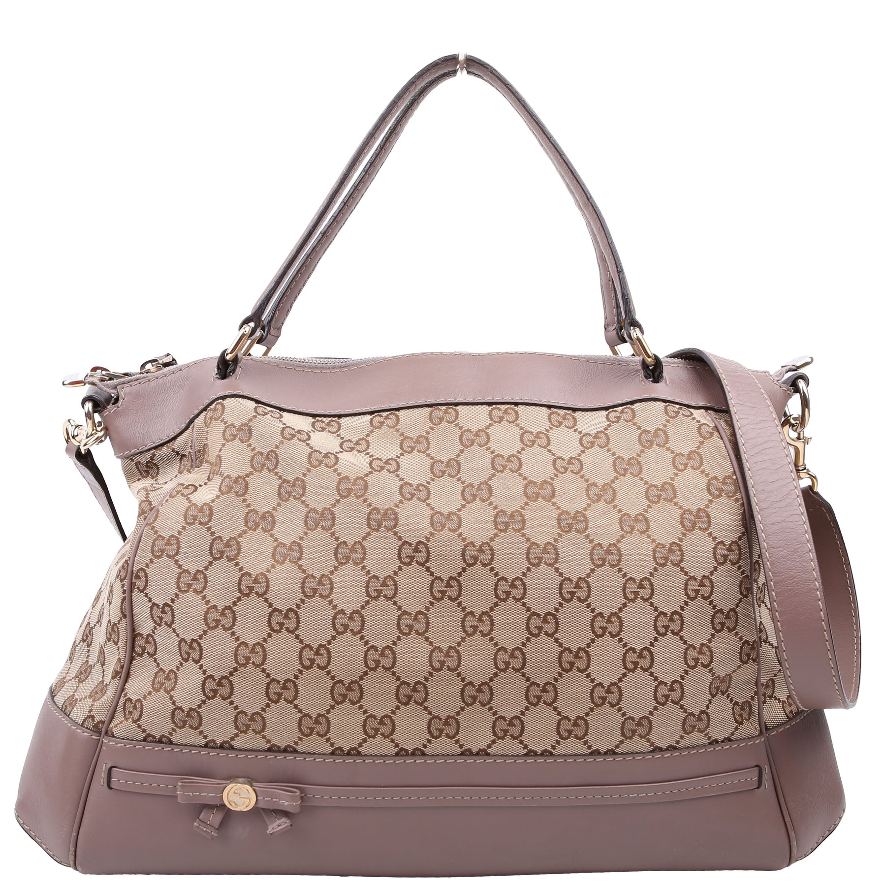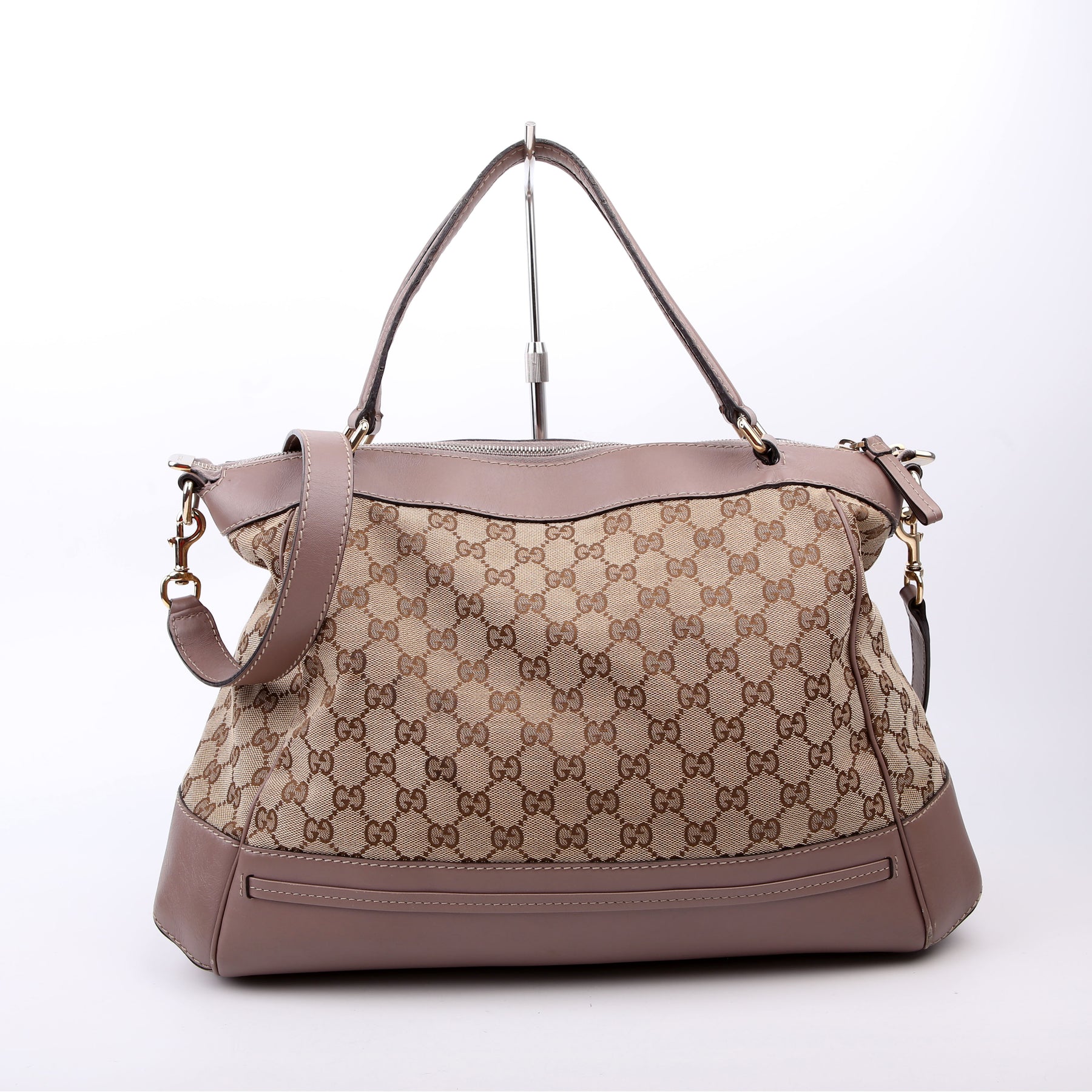 This pre-owned Gucci GG Canvas Mayfair Large is guaranteed 100% authentic. The exterior is in the classic Gucci GG Canvas.