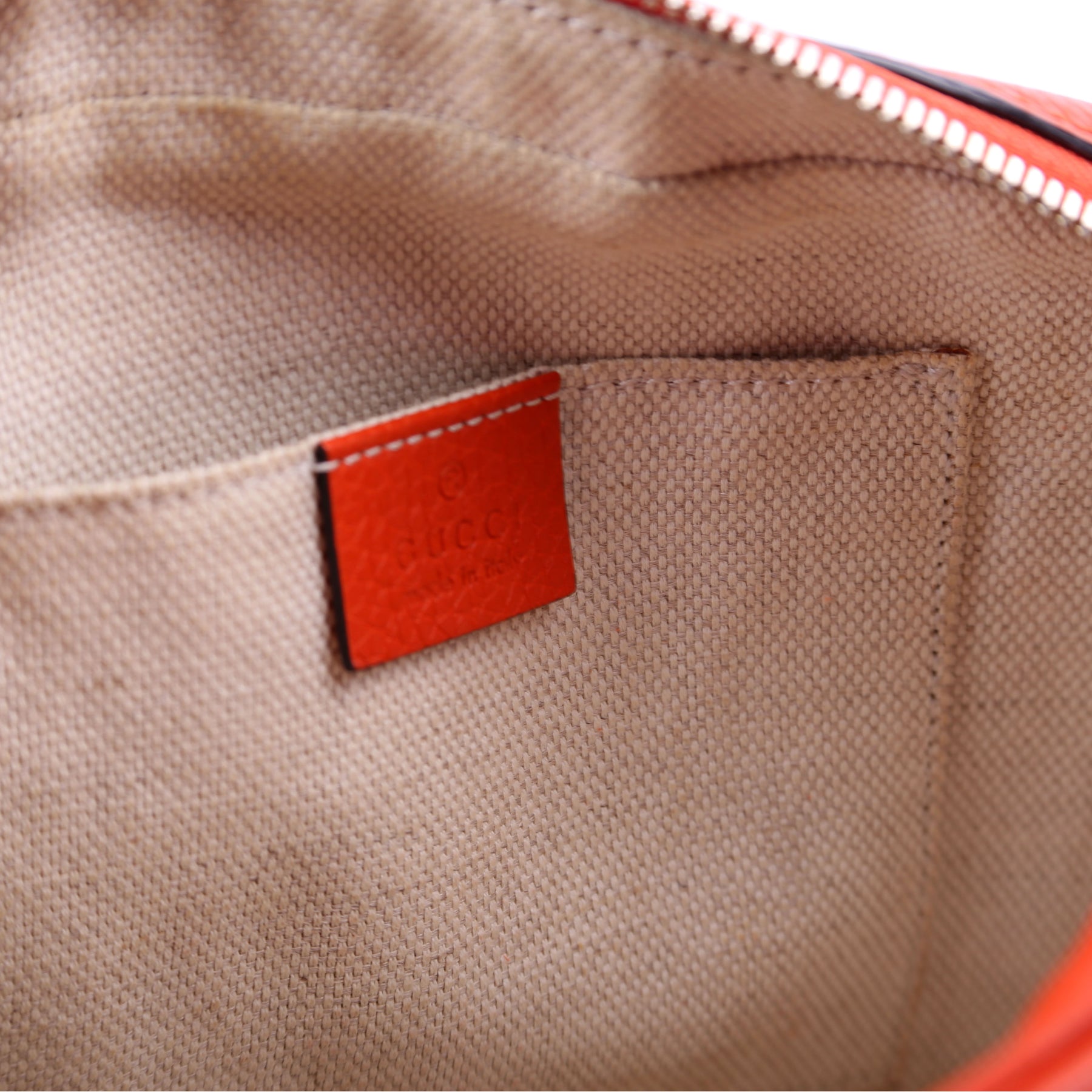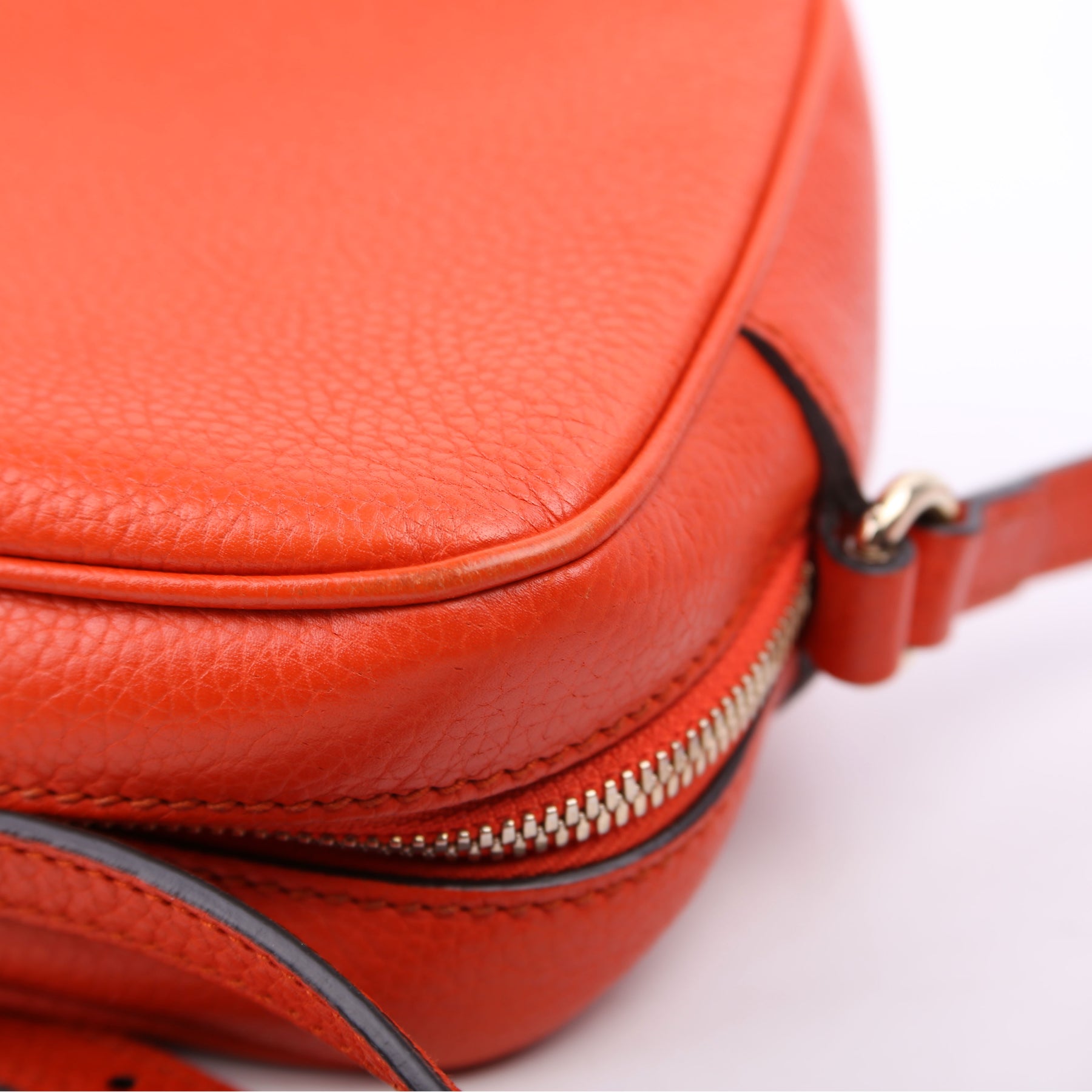 Hardware: The zipper operates properly and runs smoothly. The hardware shows light wear. The leather on the zipper pull shows light wear.