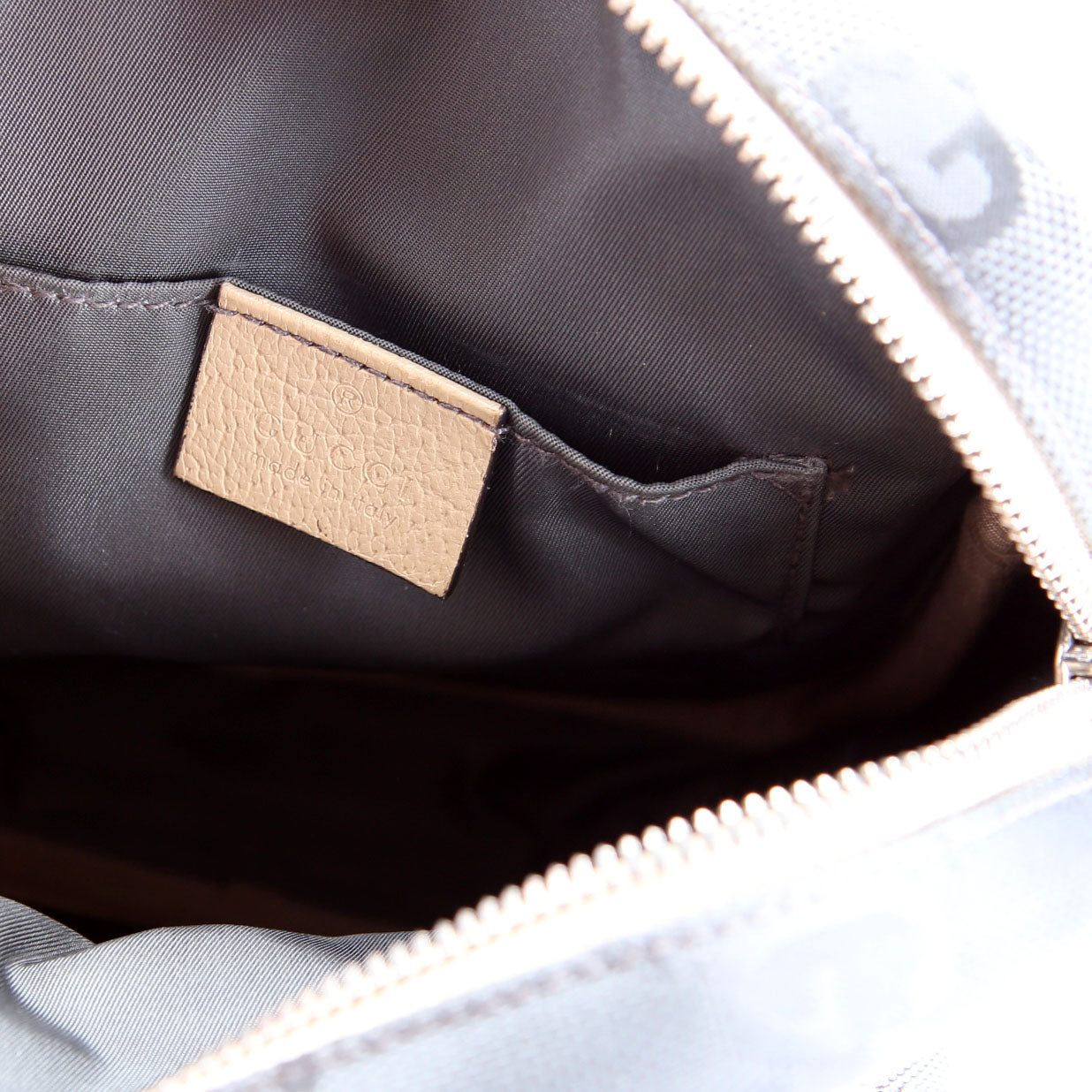 Exterior: The exterior nylon is free from wear. The leather piping shows wear and rubbing throughout. It features one zip closure pocket.