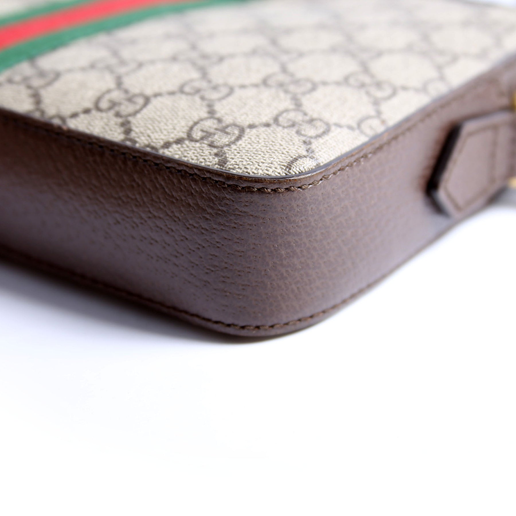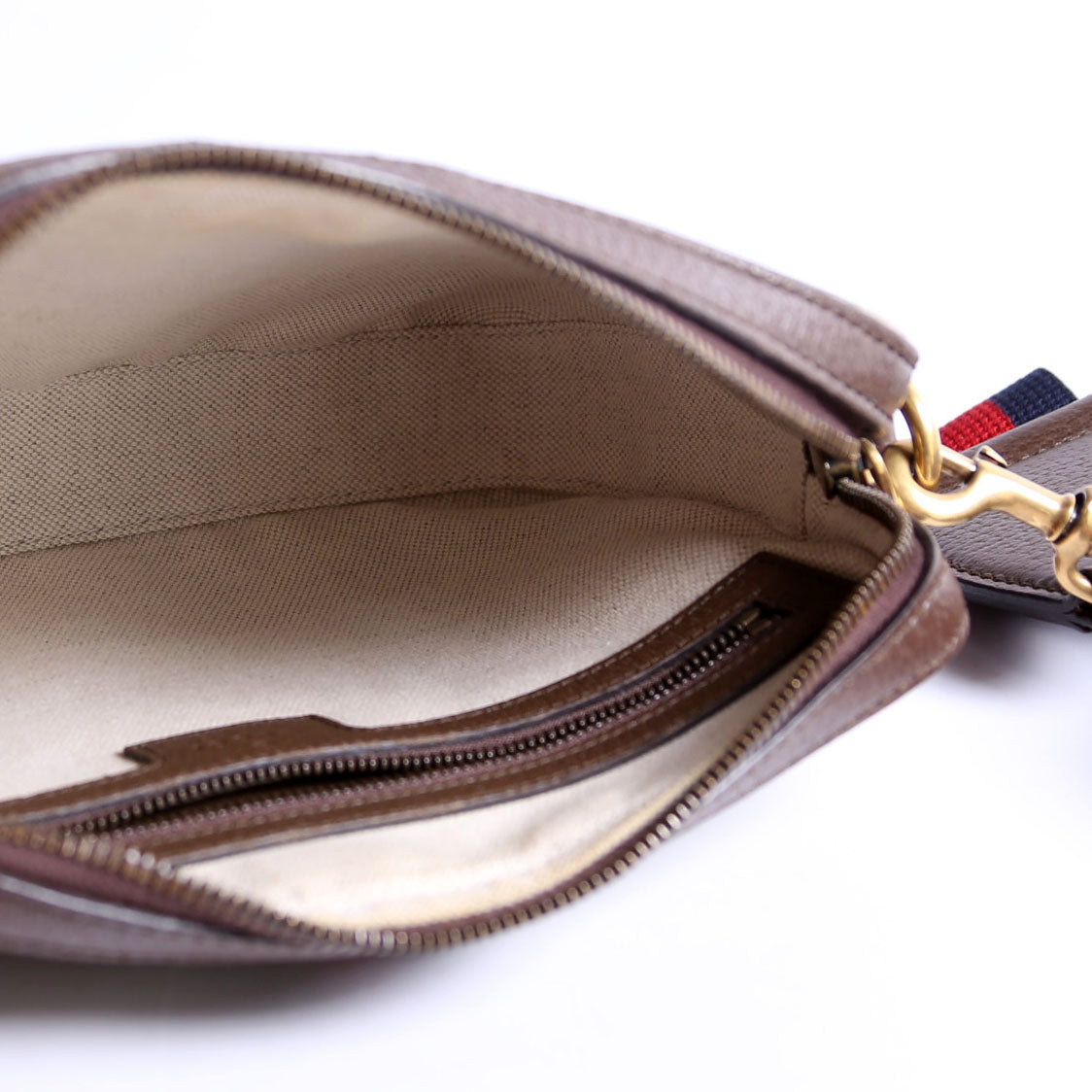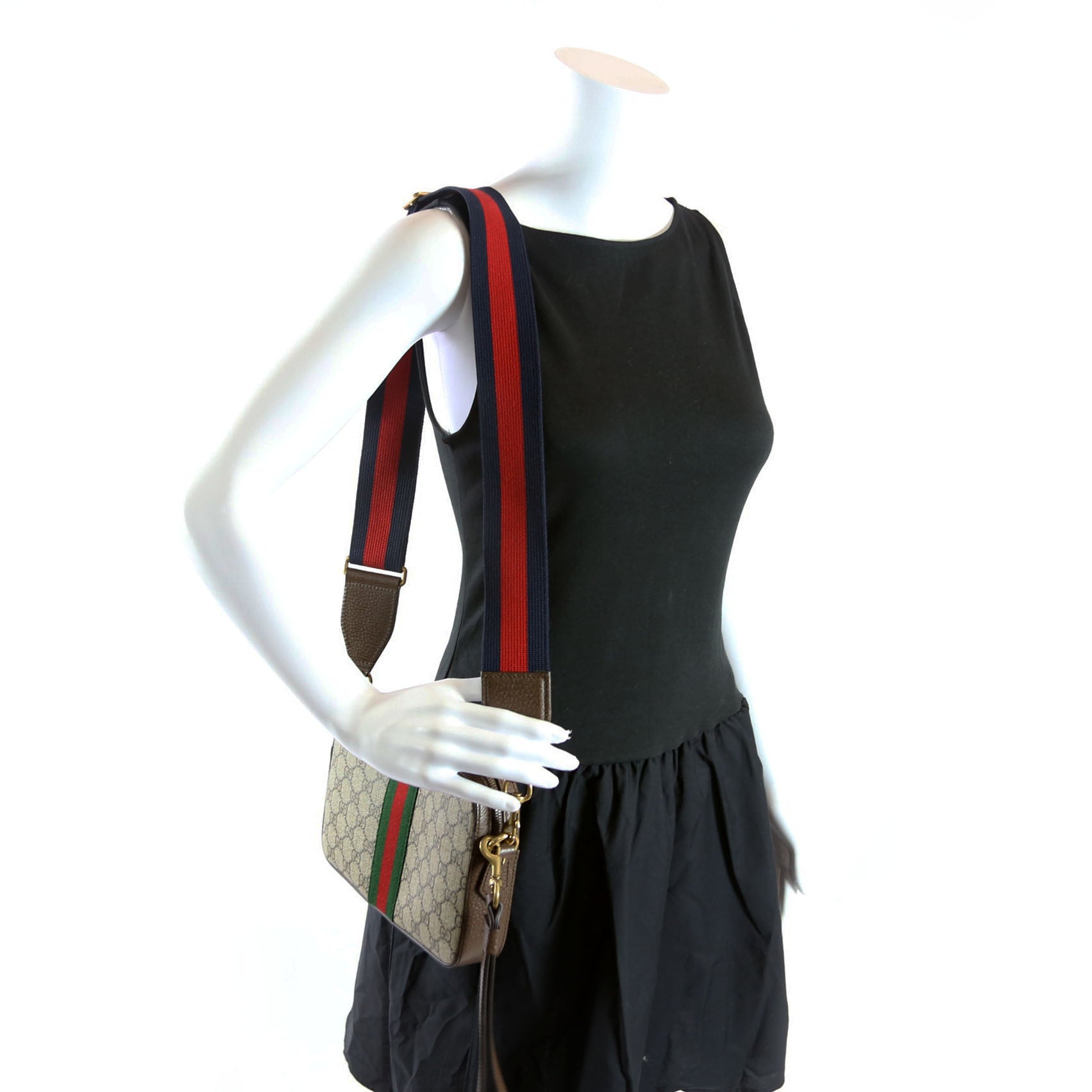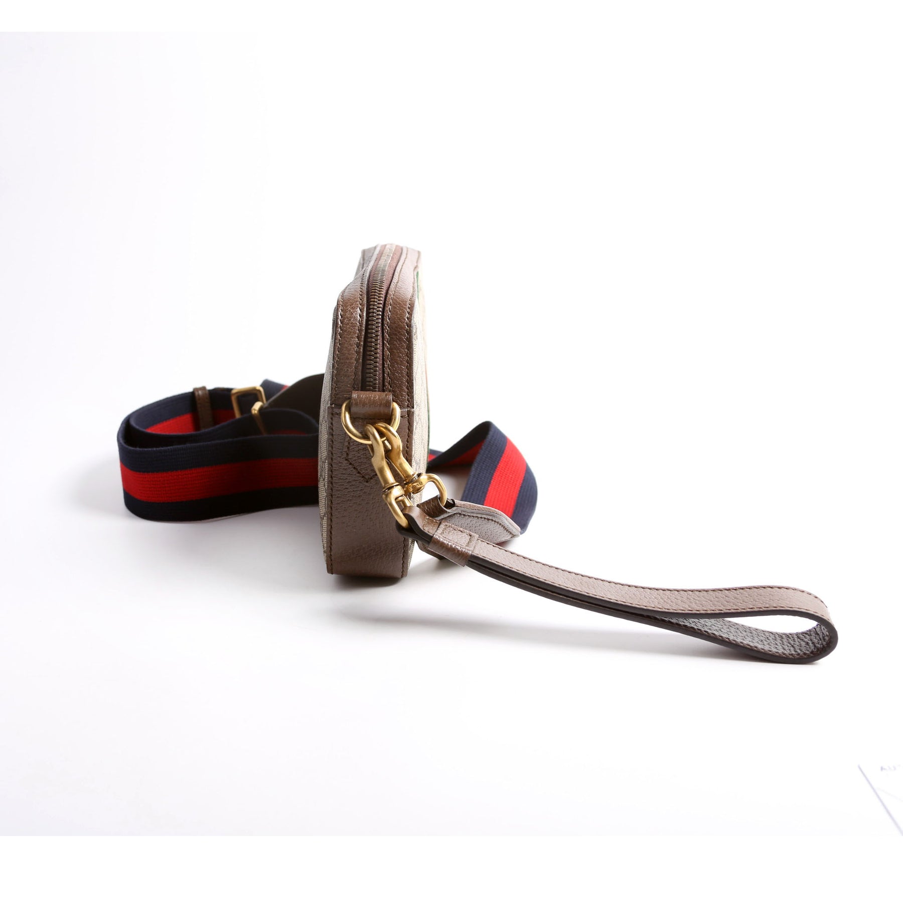 This pre-owned Gucci GG Supreme Ophidia Small Wristlet Crossbody is guaranteed 100% authentic. The exterior is in the classic Gucci coated canvas.
