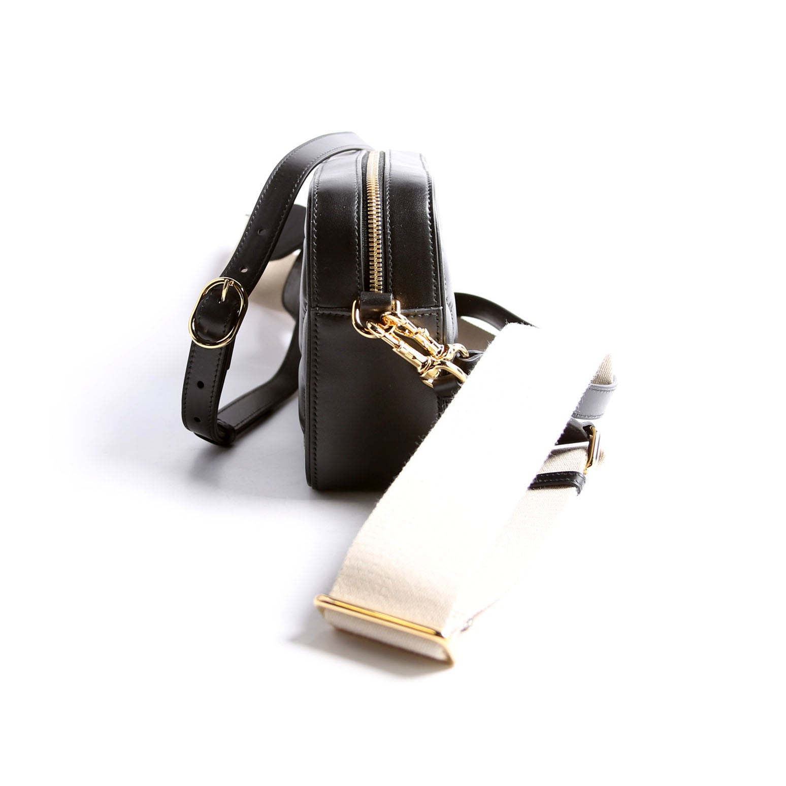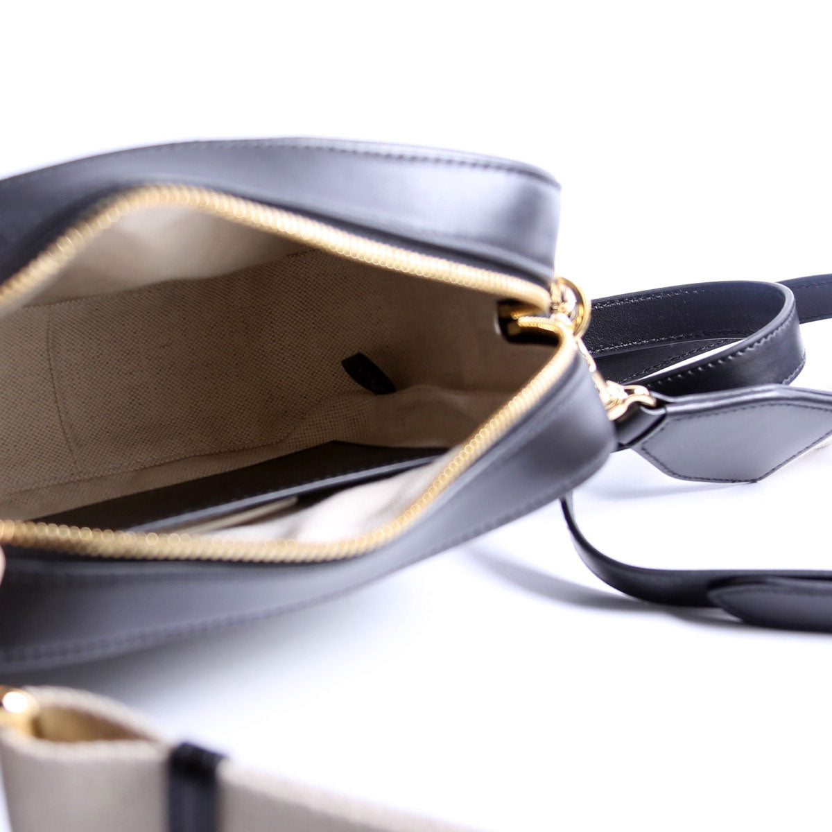Strap: The leather strap shows light wrinkling. The fabric strap show light wear throughout.
