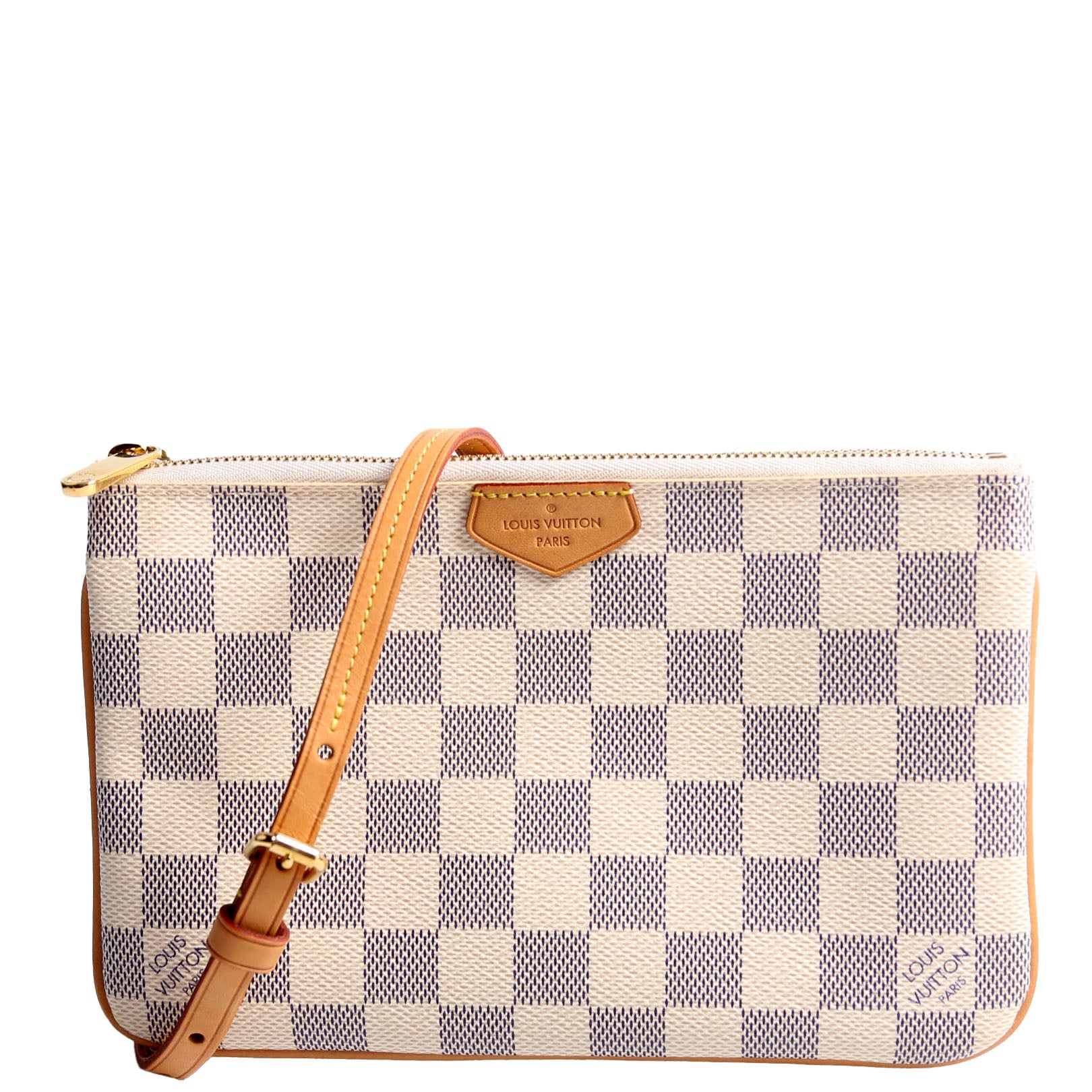 This pre-owned Louis Vuitton Double Zip Pochette is guaranteed 100% authentic. The exterior is in the classic Louis Vuitton Damier Azur coated canvas.
