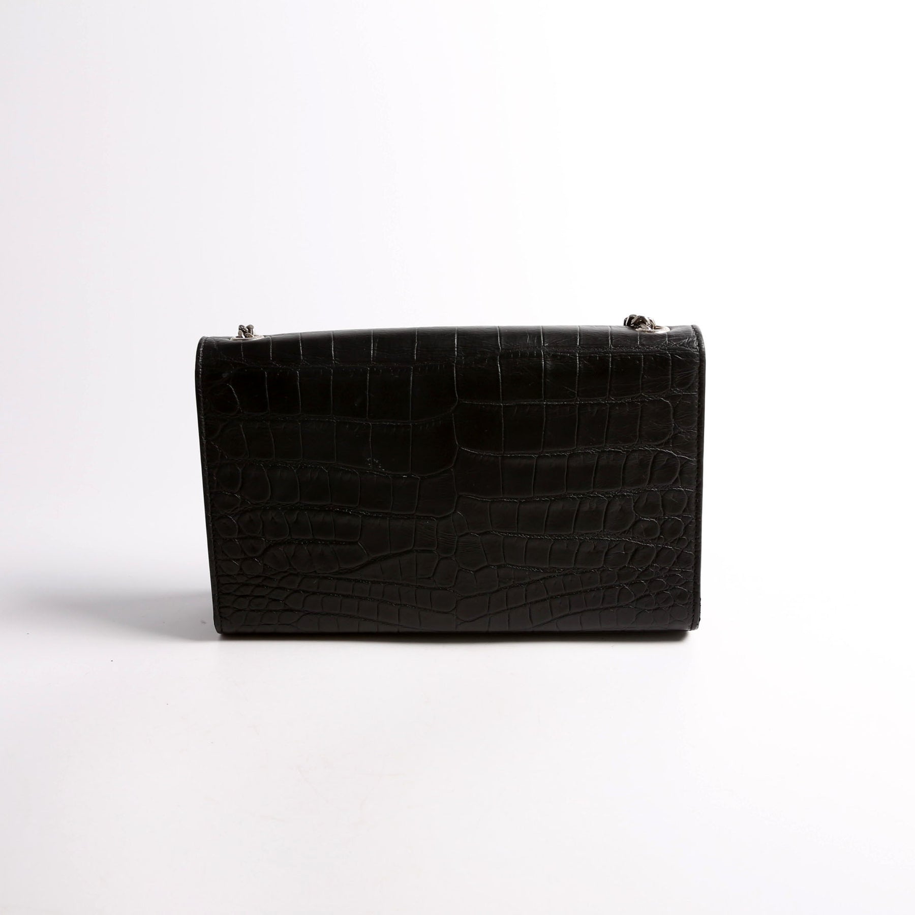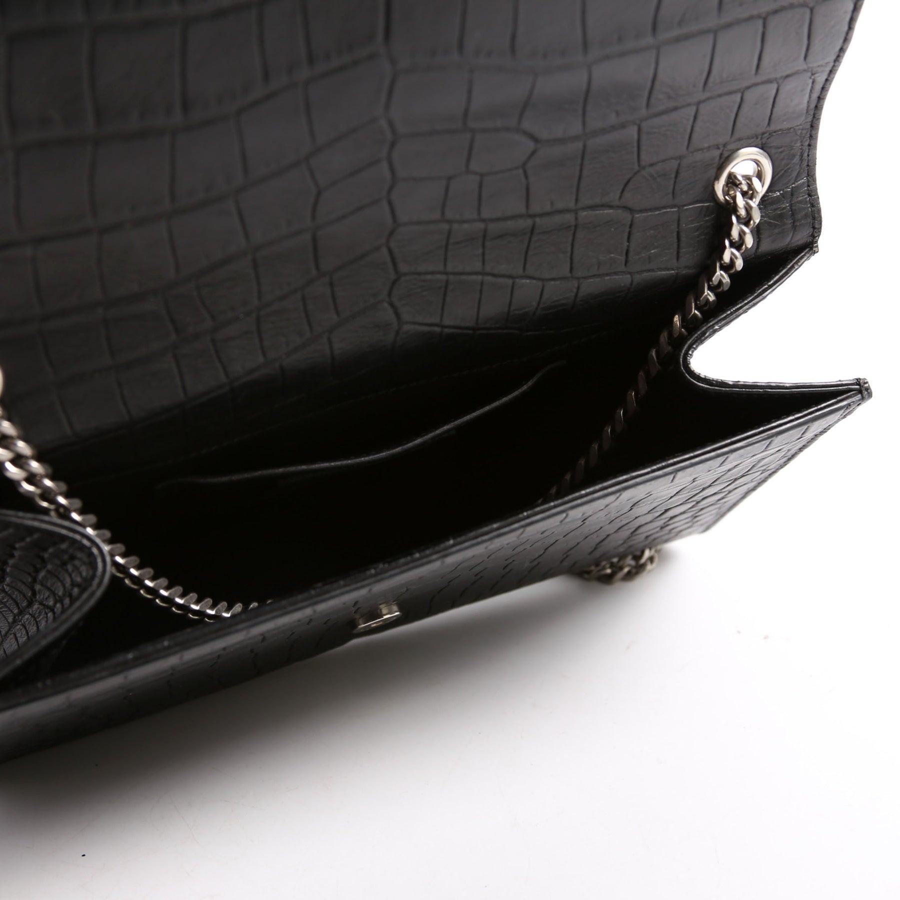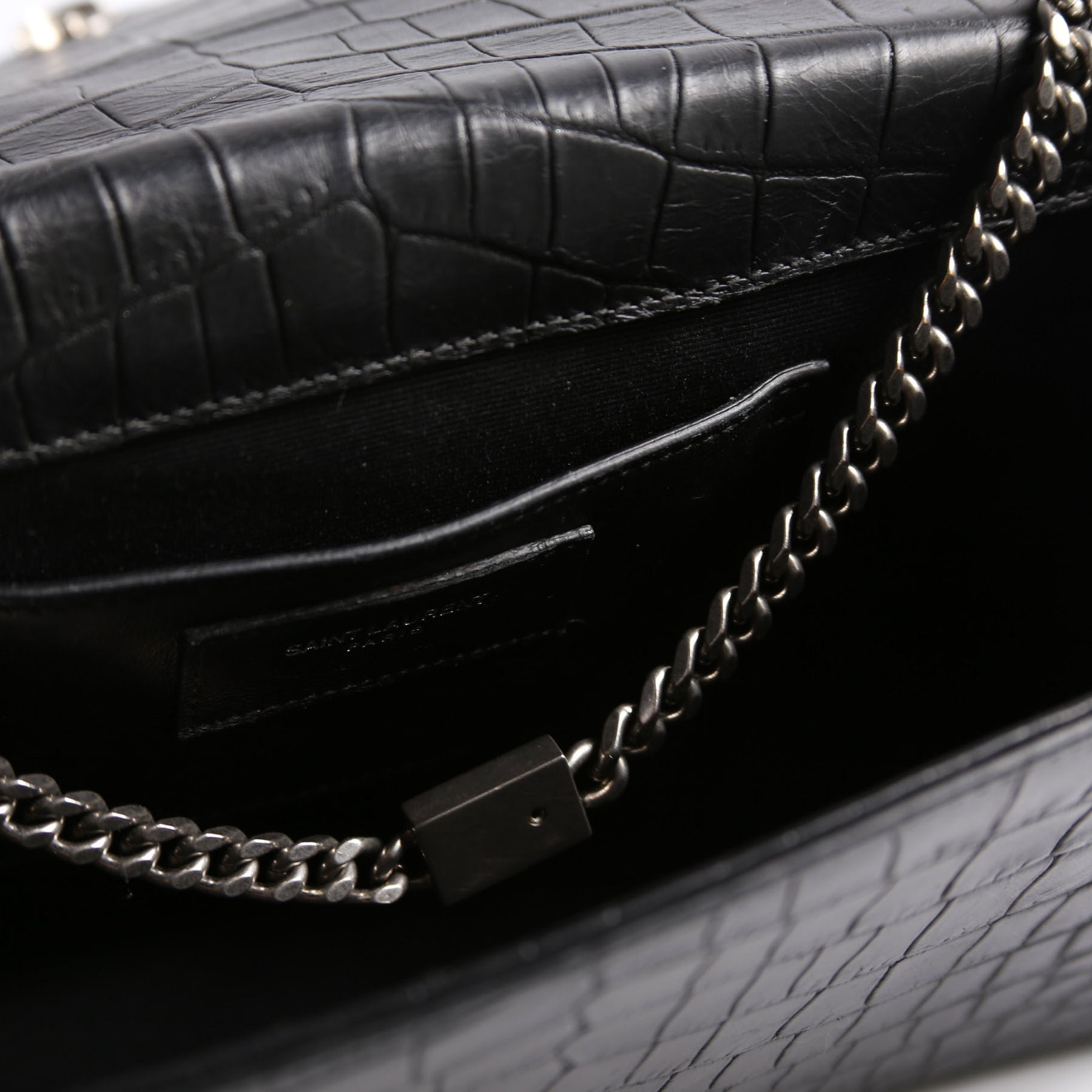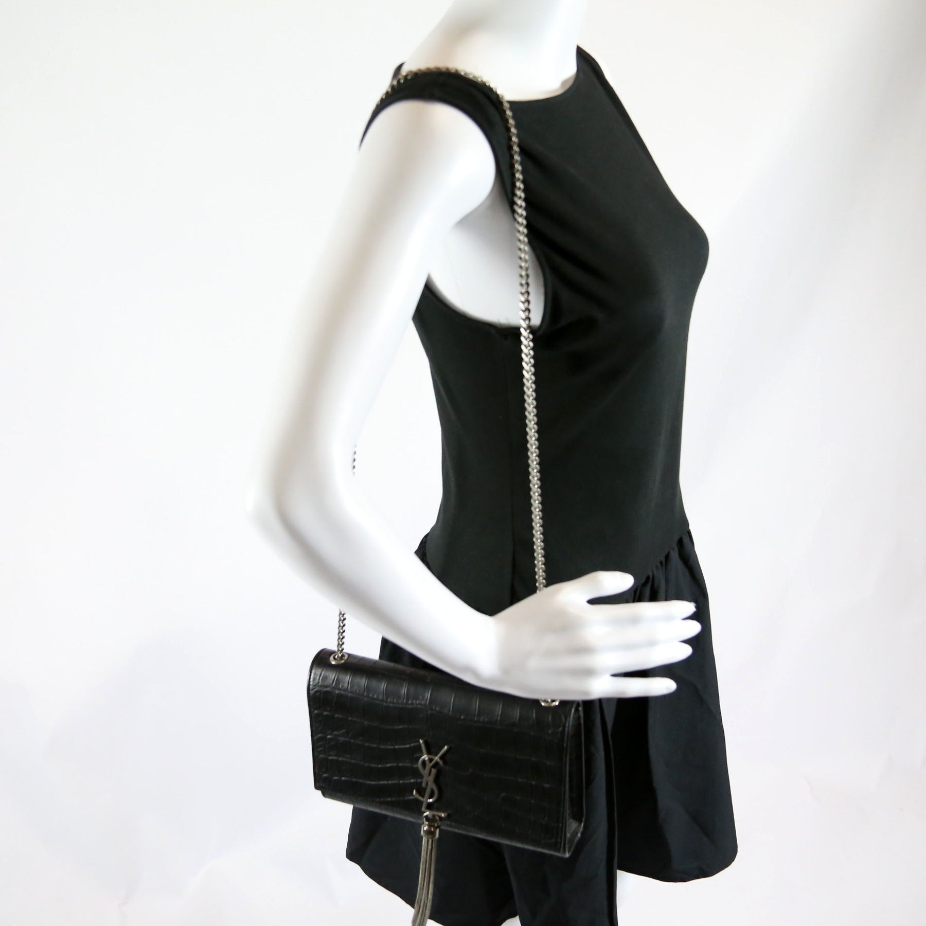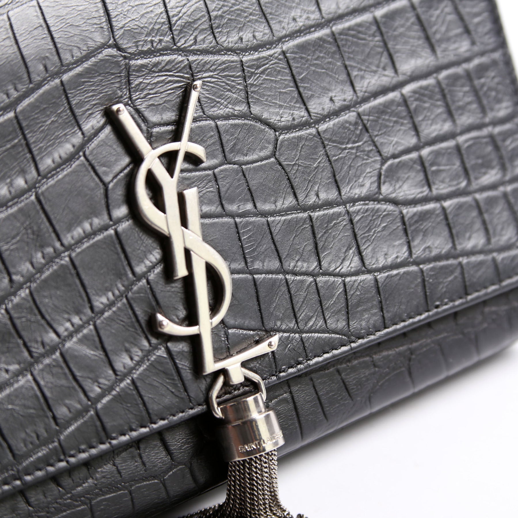 This pre-owned Saint Laurent Kate Tassel Satchel Medium Crocodile Embossed Bag is guaranteed 100% authentic. The exterior is in the classic Saint Laurent Leather.