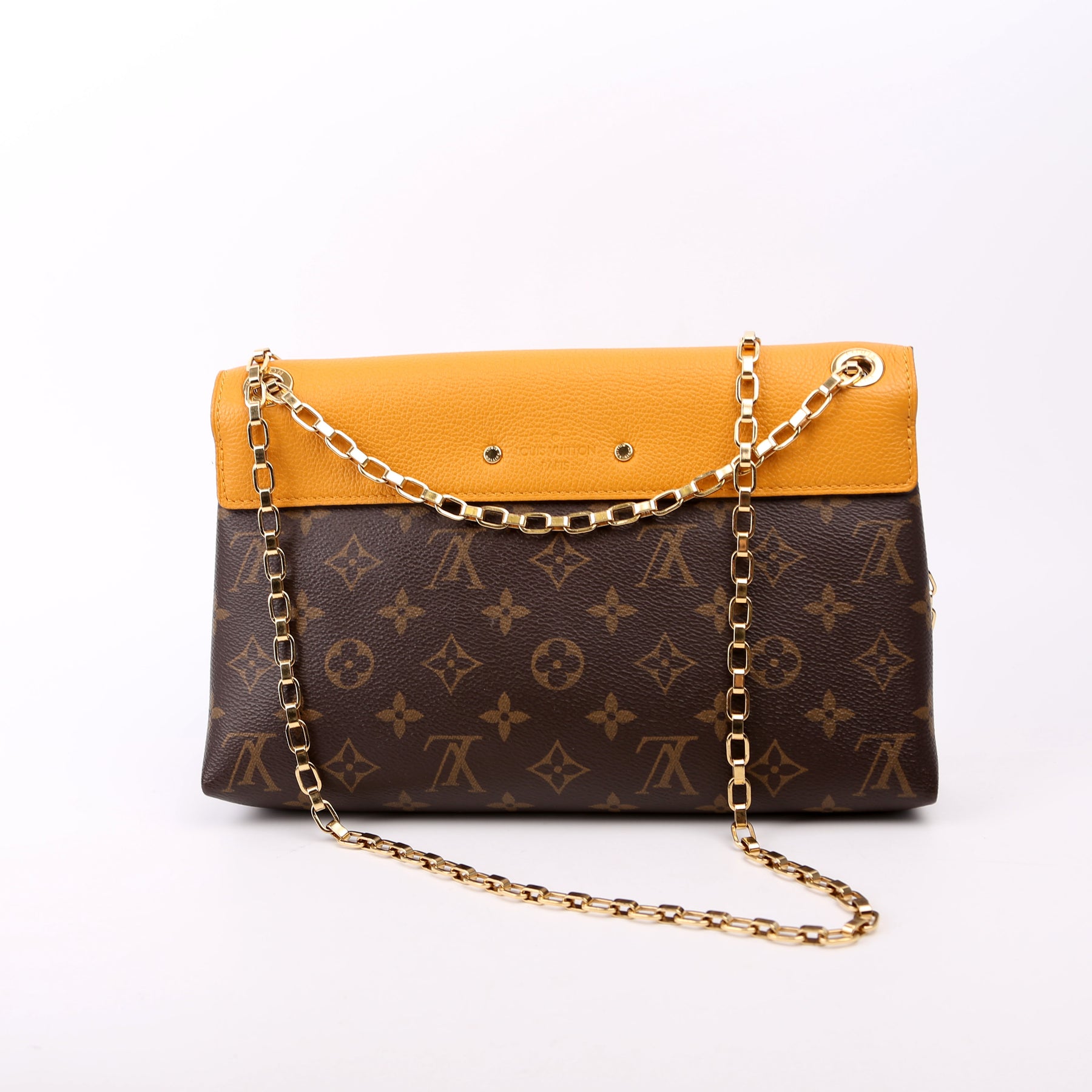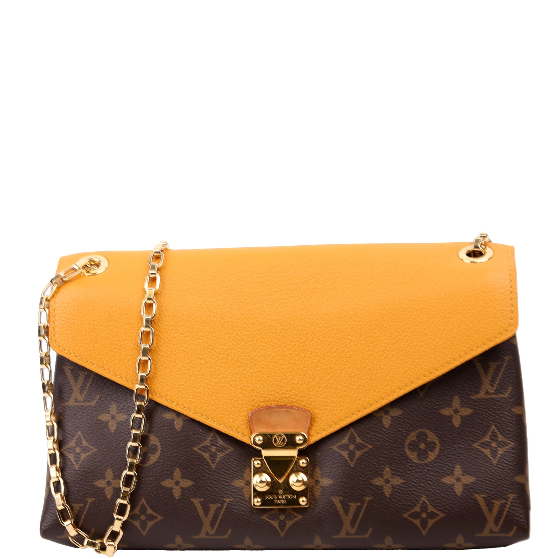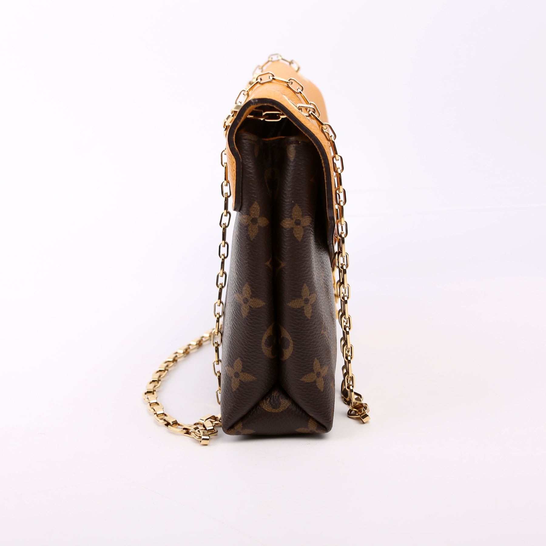 This pre-owned Louis Vuitton Pallas Chain is guaranteed 100% authentic. The exterior is in the classic Louis Vuitton Monogram coated canvas.