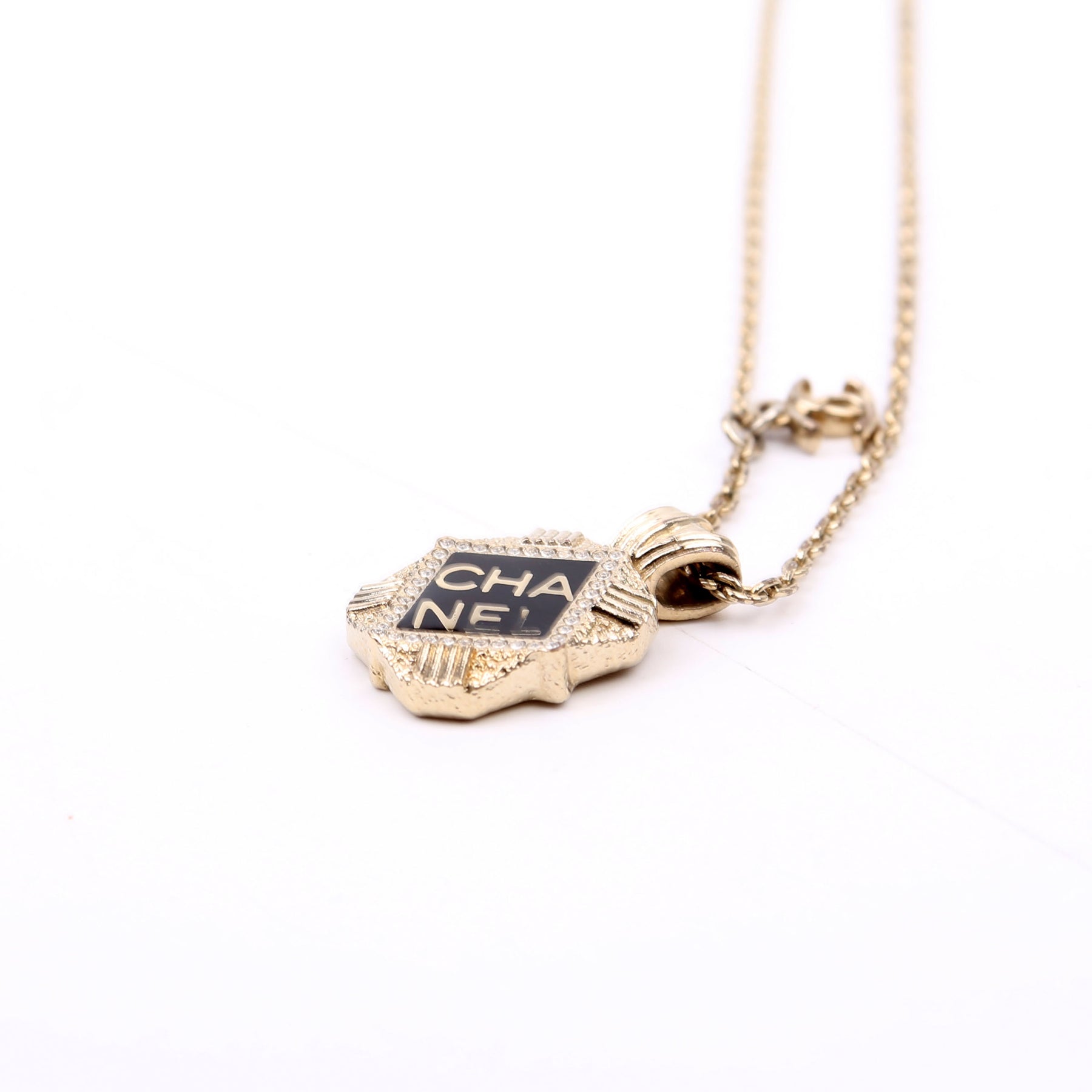 This pre-owned Chanel Square Crystal Resin Logo Pendant Necklace is guaranteed 100% authentic.