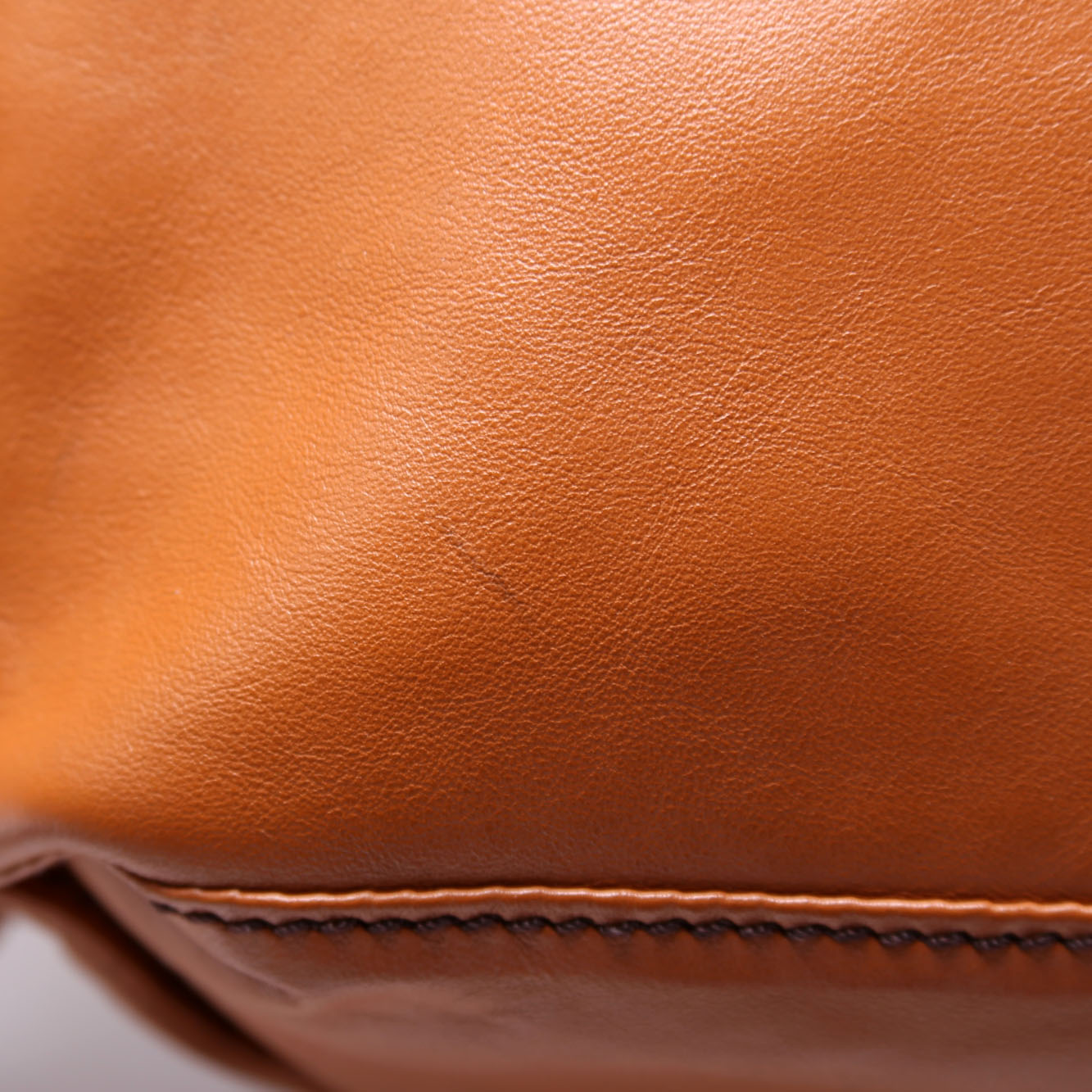 Exterior: The exterior leather is free from major signs of wear. The corners show light wear and rubbing. There is minor stitch fraying along the piping.