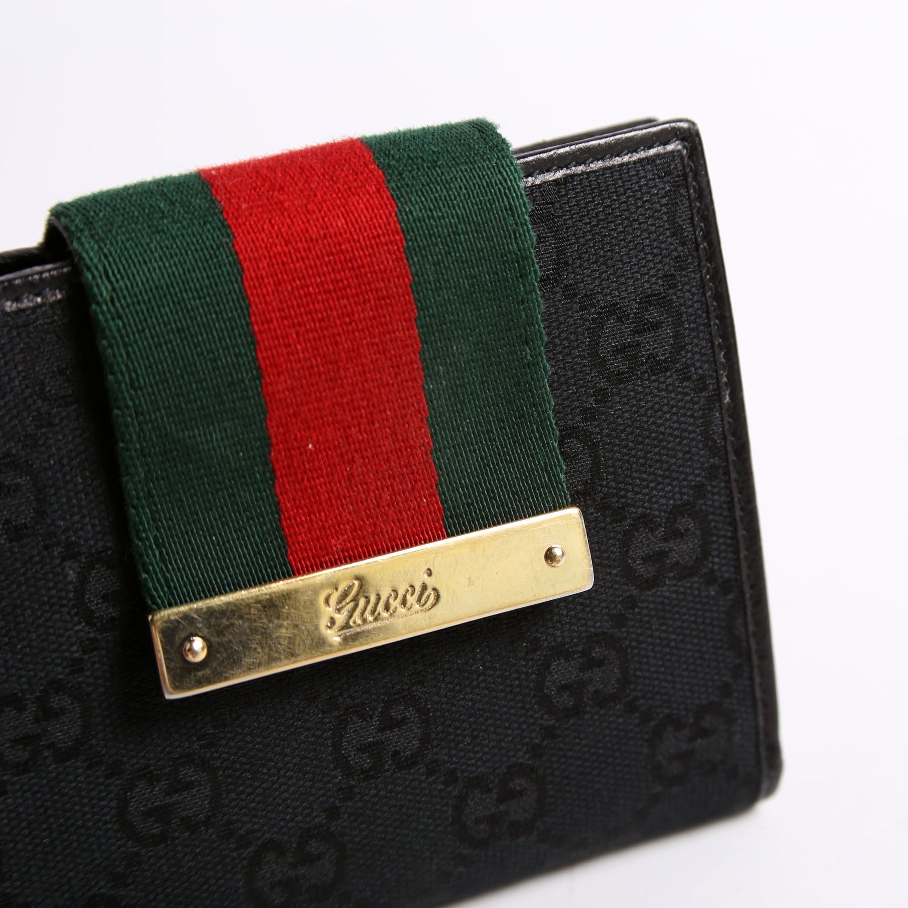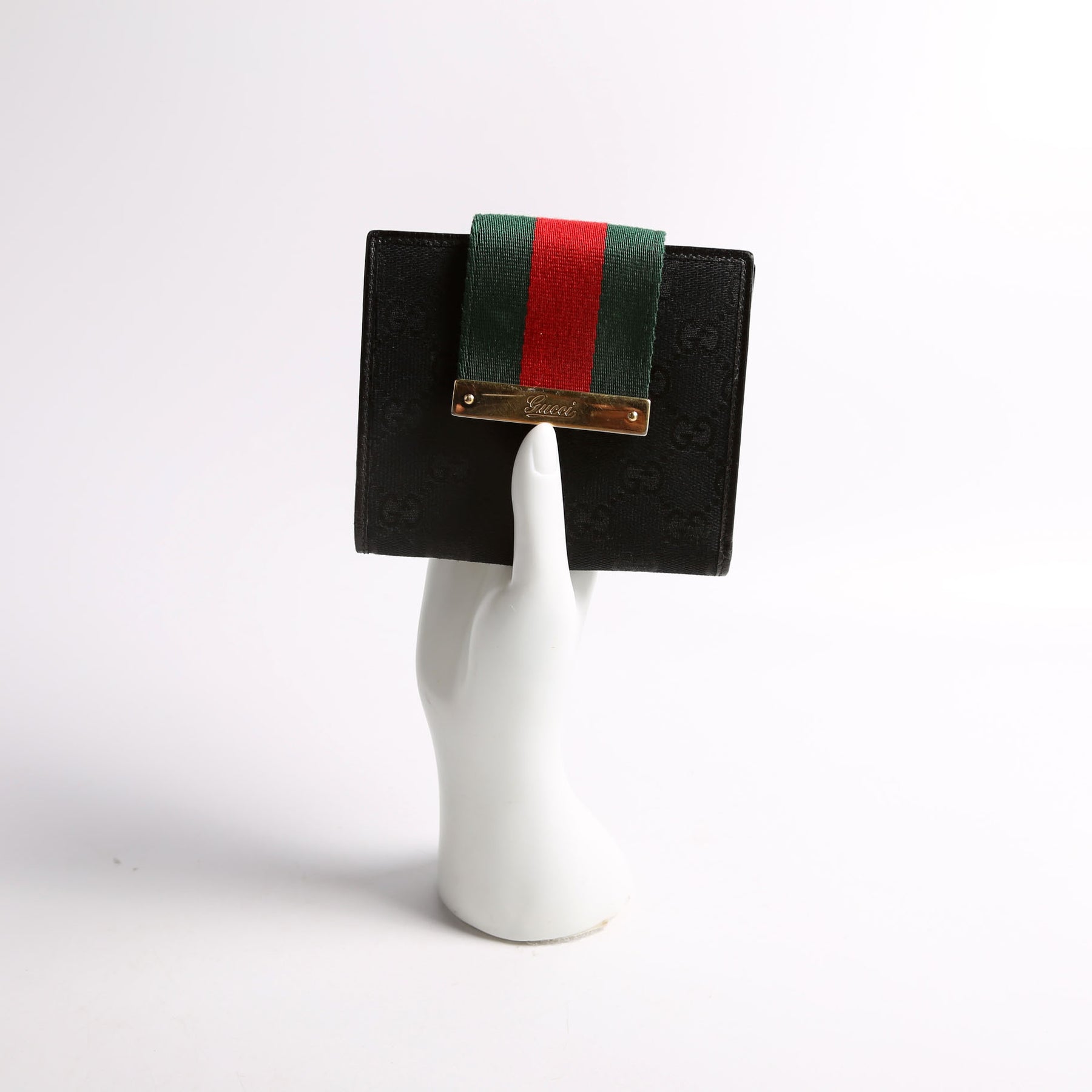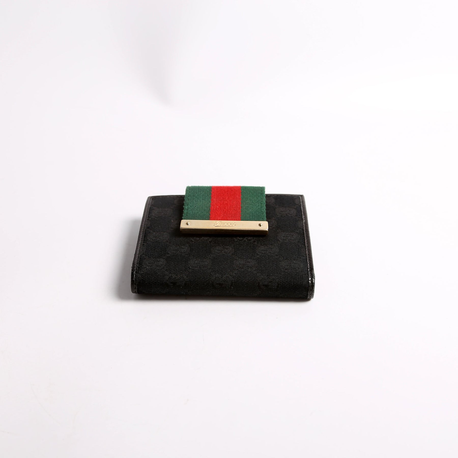This pre-owned Gucci GG Canvas Web Compact Wallet is guaranteed 100% authentic.