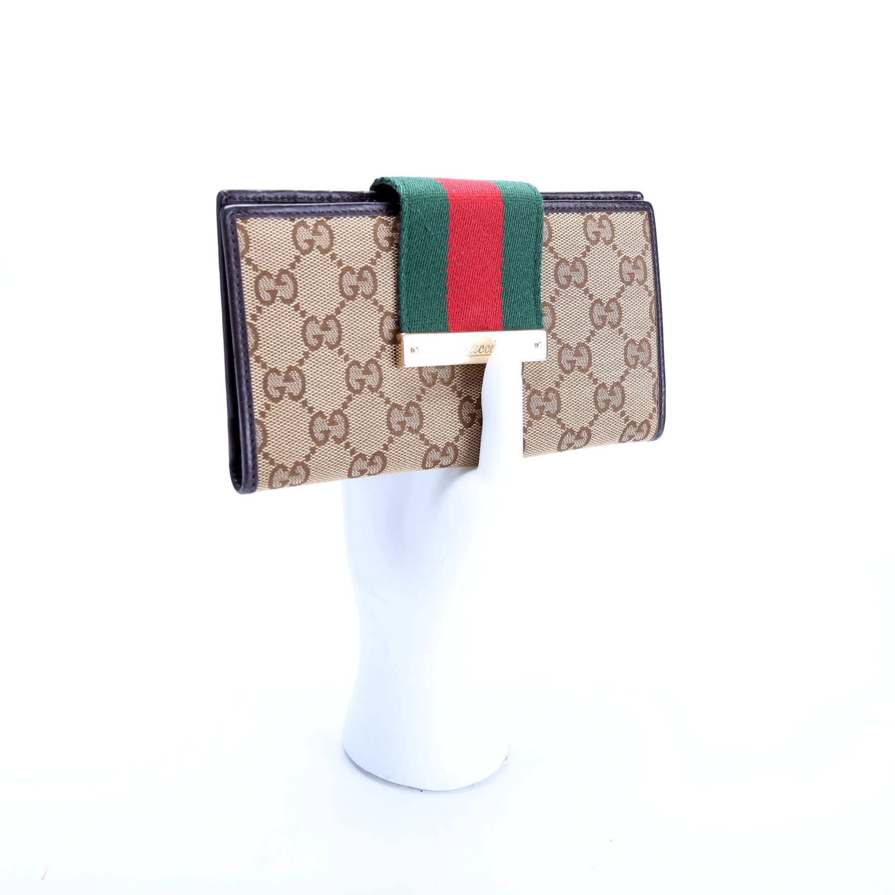 This pre-owned Gucci GG Canvas Continental Wallet is guaranteed 100% authentic. The exterior is in the classic Gucci GG canvas.