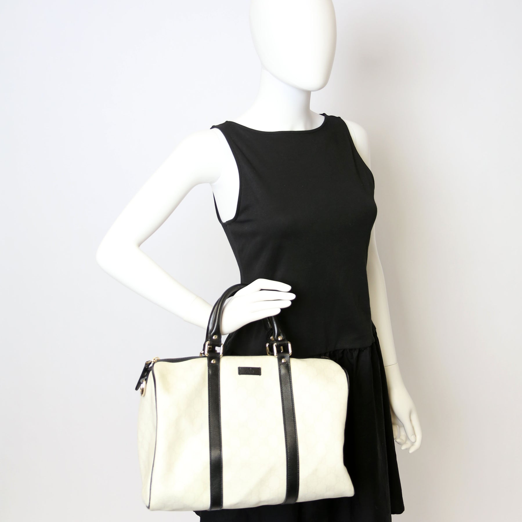 This pre-owned Gucci Joy Boston Bag is guaranteed 100% authentic. The exterior is in the classic Gucci GG coated canvas.