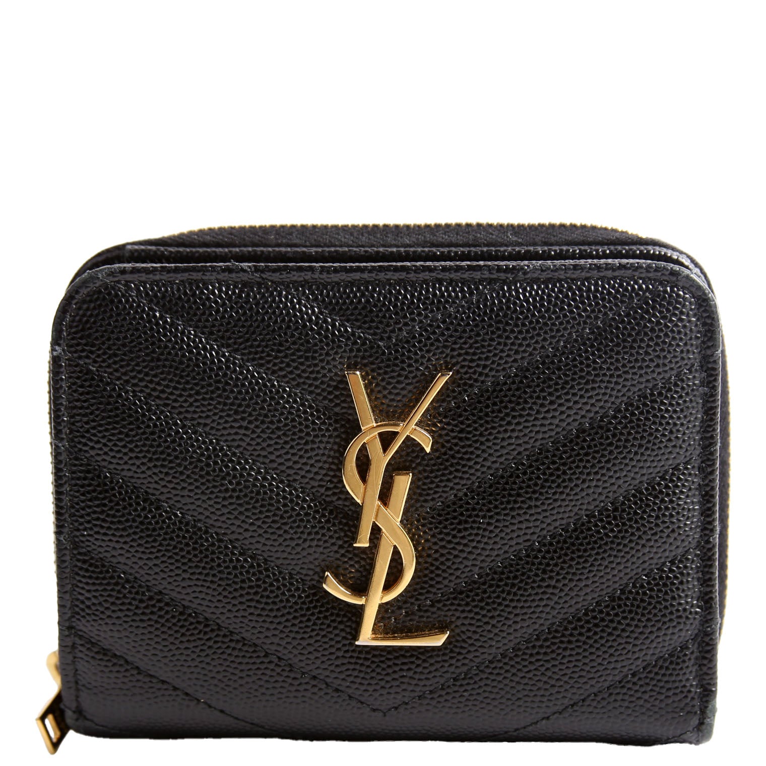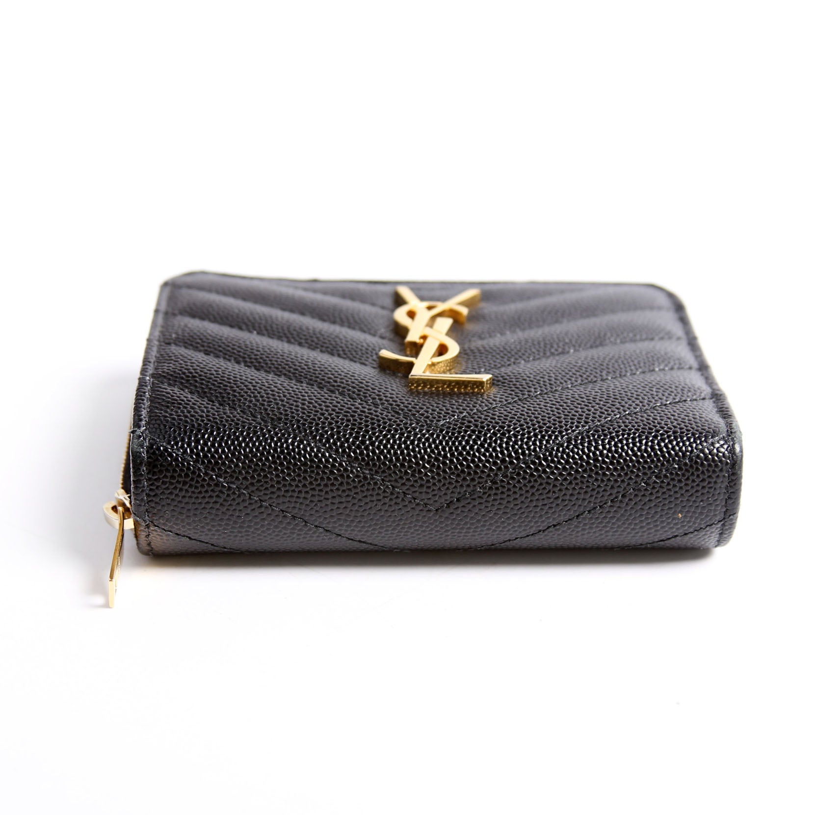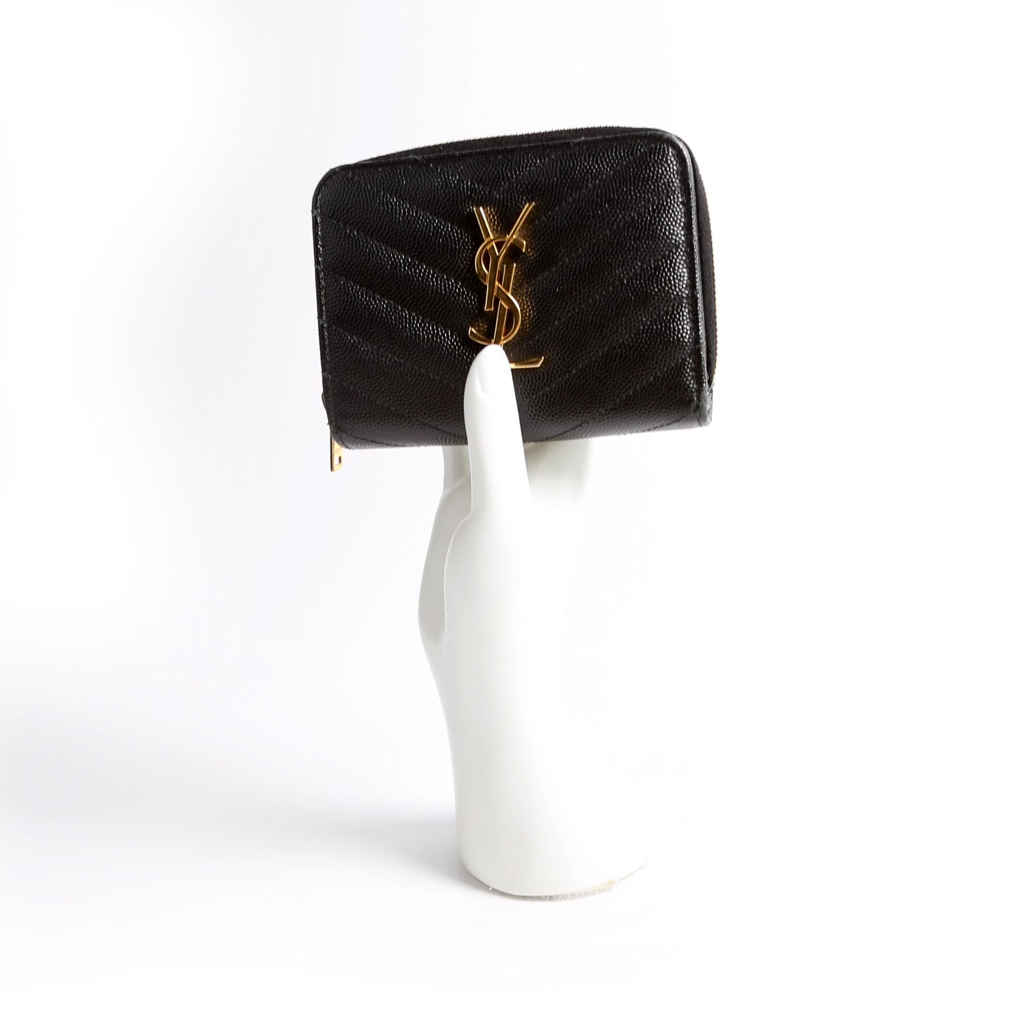 This pre-owned Saint Laurent Cassandre Compact Zip Around Wallet is guaranteed 100% authentic. The exterior is in the classic Saint Laurent Grain De Poudre leather.