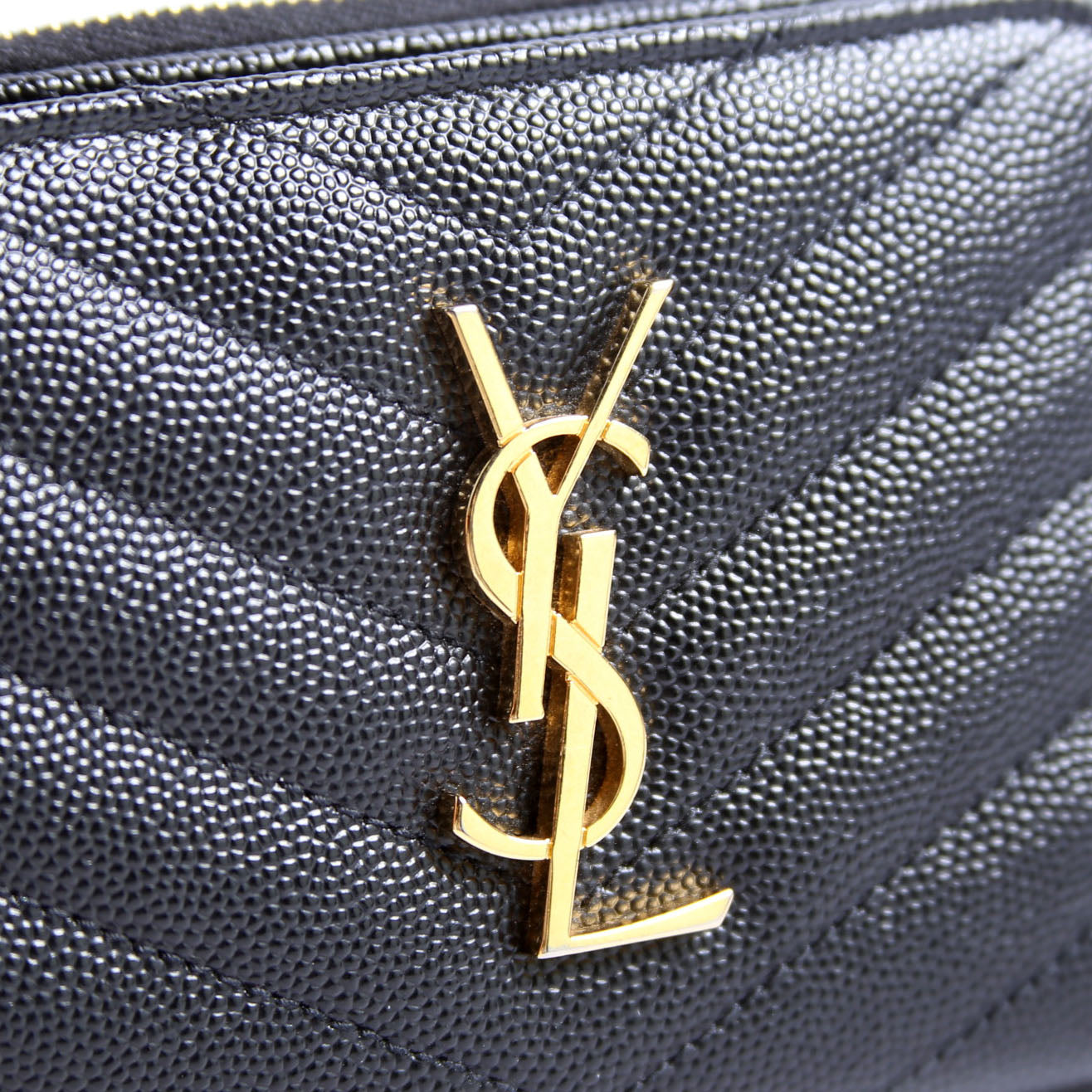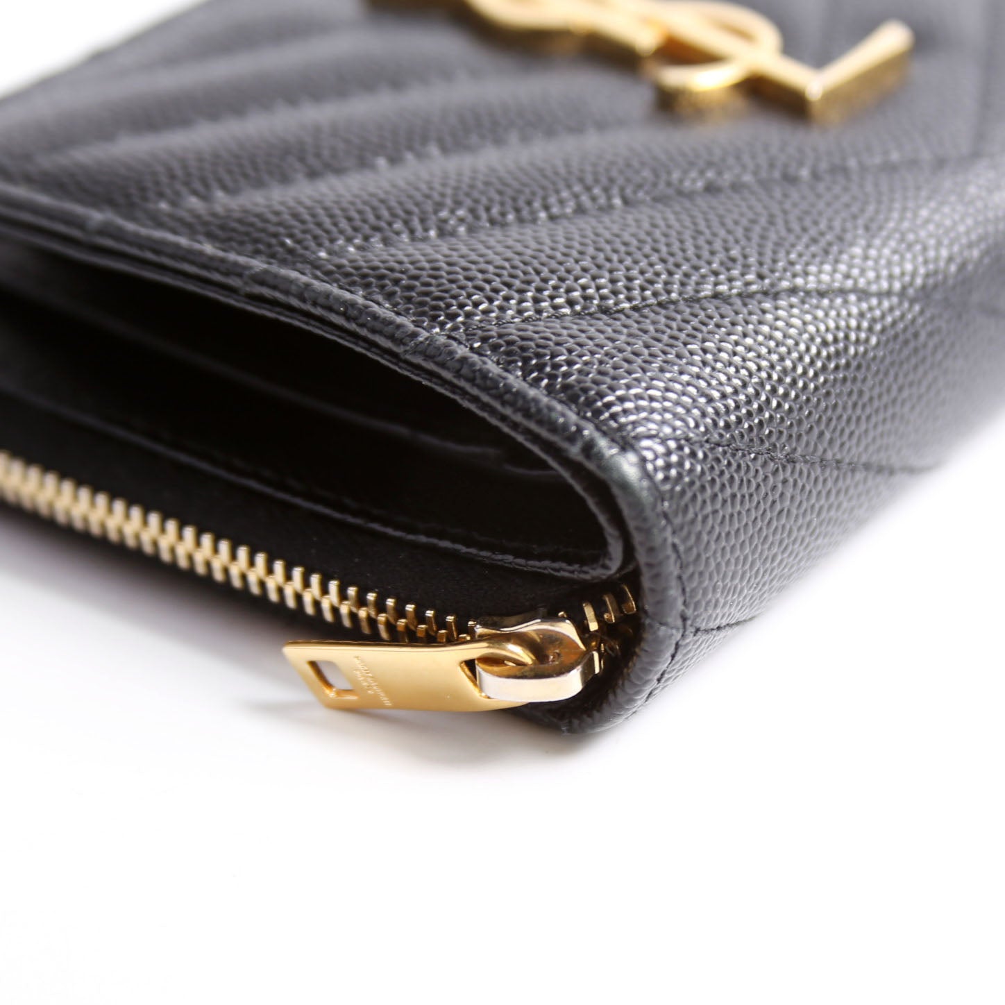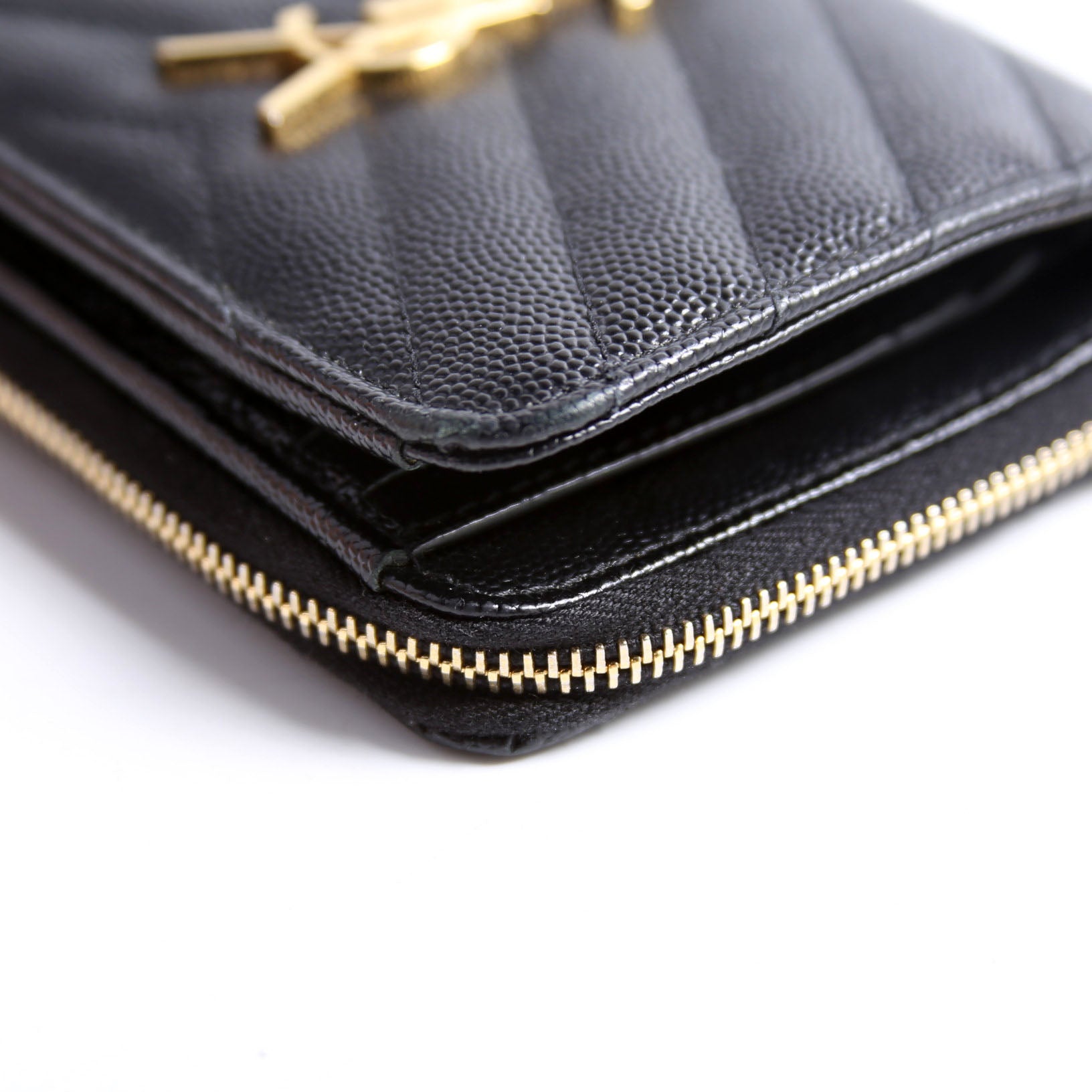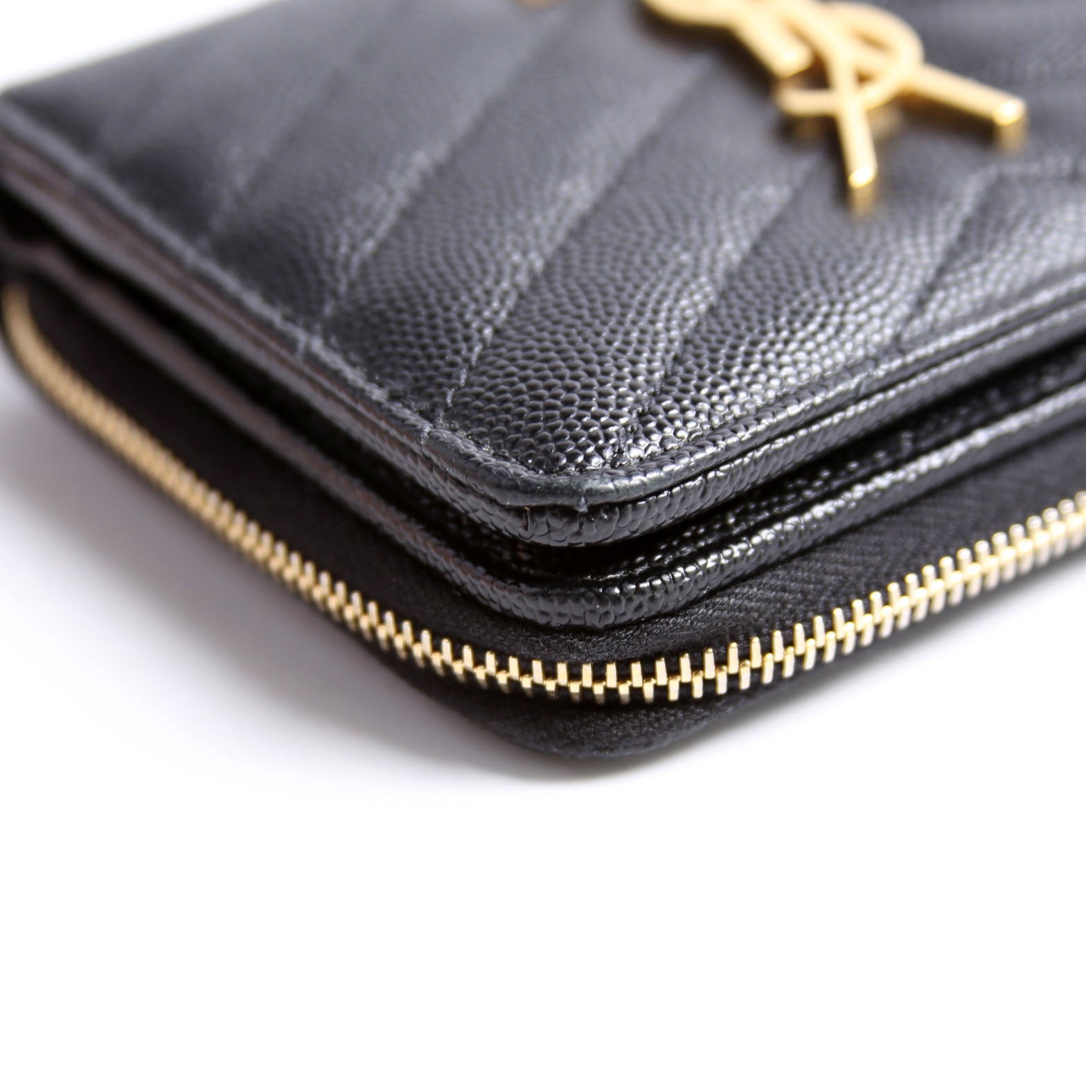 This pre-owned Saint Laurent Cassandre Compact Zip Around Wallet is guaranteed 100% authentic. The exterior is in the classic Saint Laurent Grain De Poudre leather.