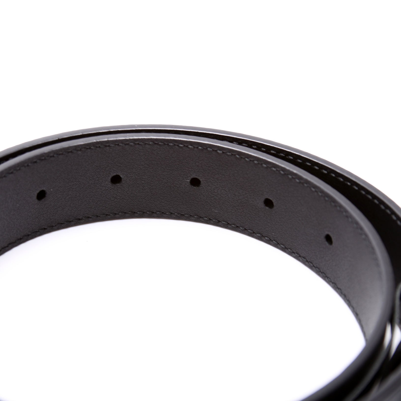 Exterior: The exterior leather shows scuffs and indentions throughout. There is a normal bend in the middle of the belt. It is slightly misshapen from storage and wear.