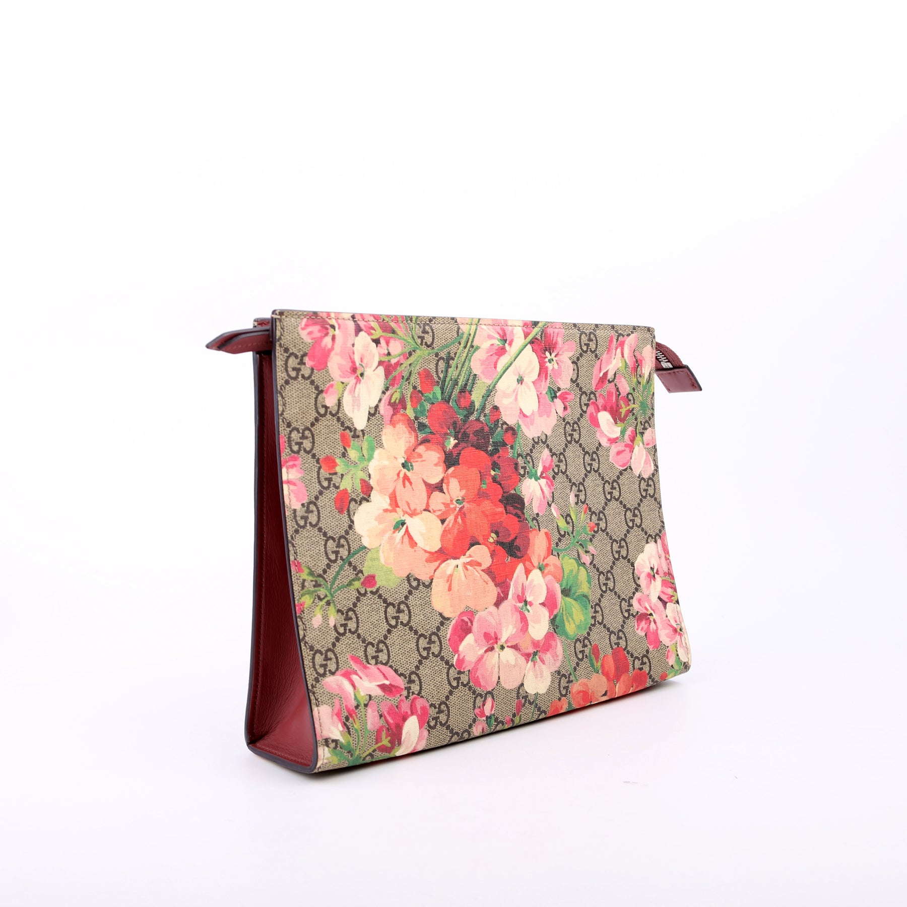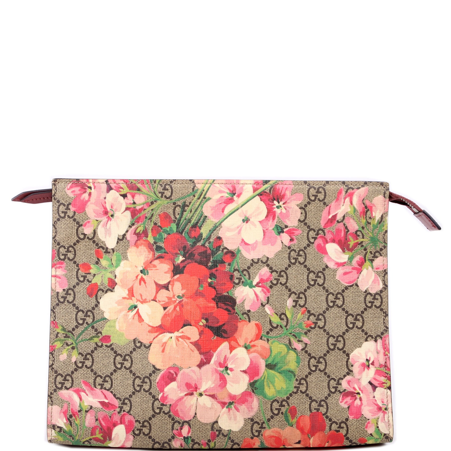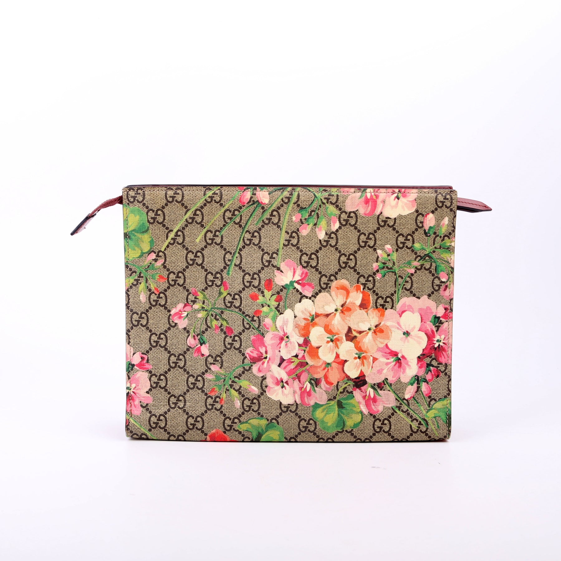 This pre-owned Gucci GG Blooms Cosmetic Pouch is guaranteed 100% authentic. The exterior is in the classic Gucci GG Supreme coated canvas.