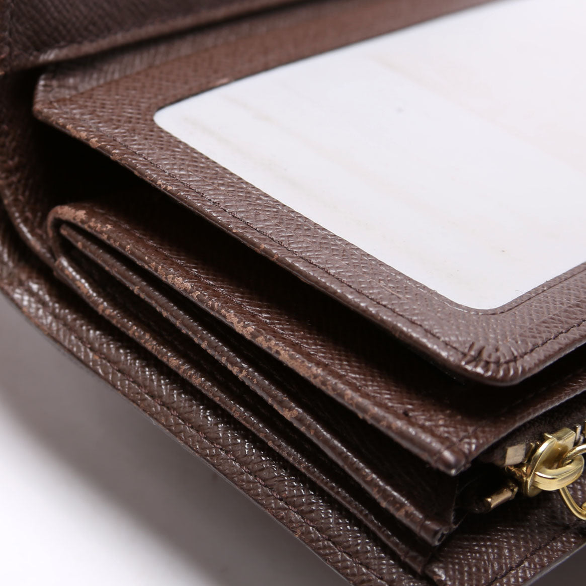 Interior: The interior shows wear and scuffs throughout. There is a heat stamp of "Y.K." that is fading in the corner. It features thirteen card slots, three open pockets, one bill slots, and one ID slot.
