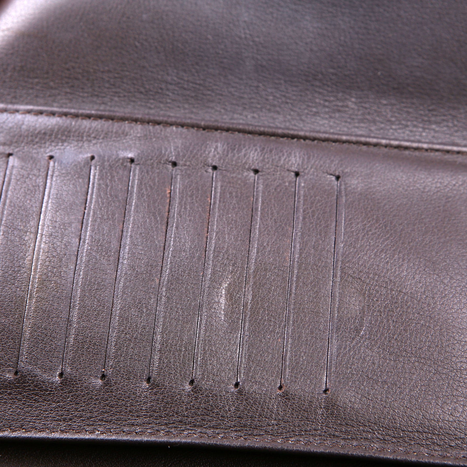 Interior: The interior leather has minor scuffs. It features eighteen card slots, three bill slots, and one zip closure pocket.