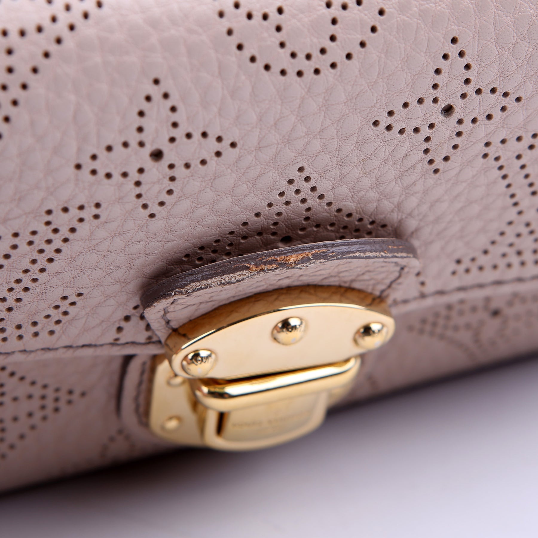 This pre-owned Louis Vuitton Amelia Wallet is guaranteed 100% authentic. The exterior is in the classic Louis Vuitton Mahina leather.