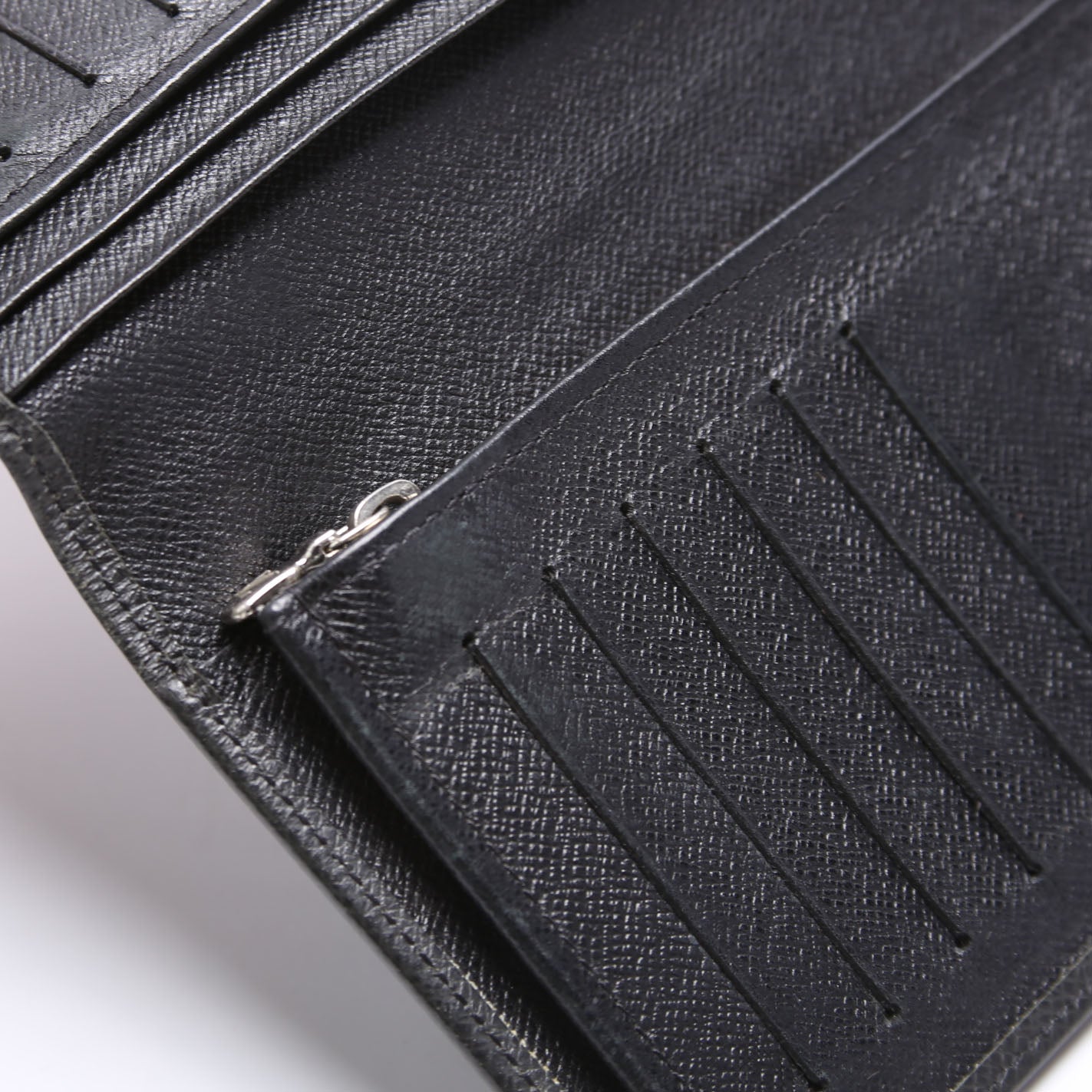 Interior: The interior is clean and free of rips or tears. The interior features three card slots and two bill folds.