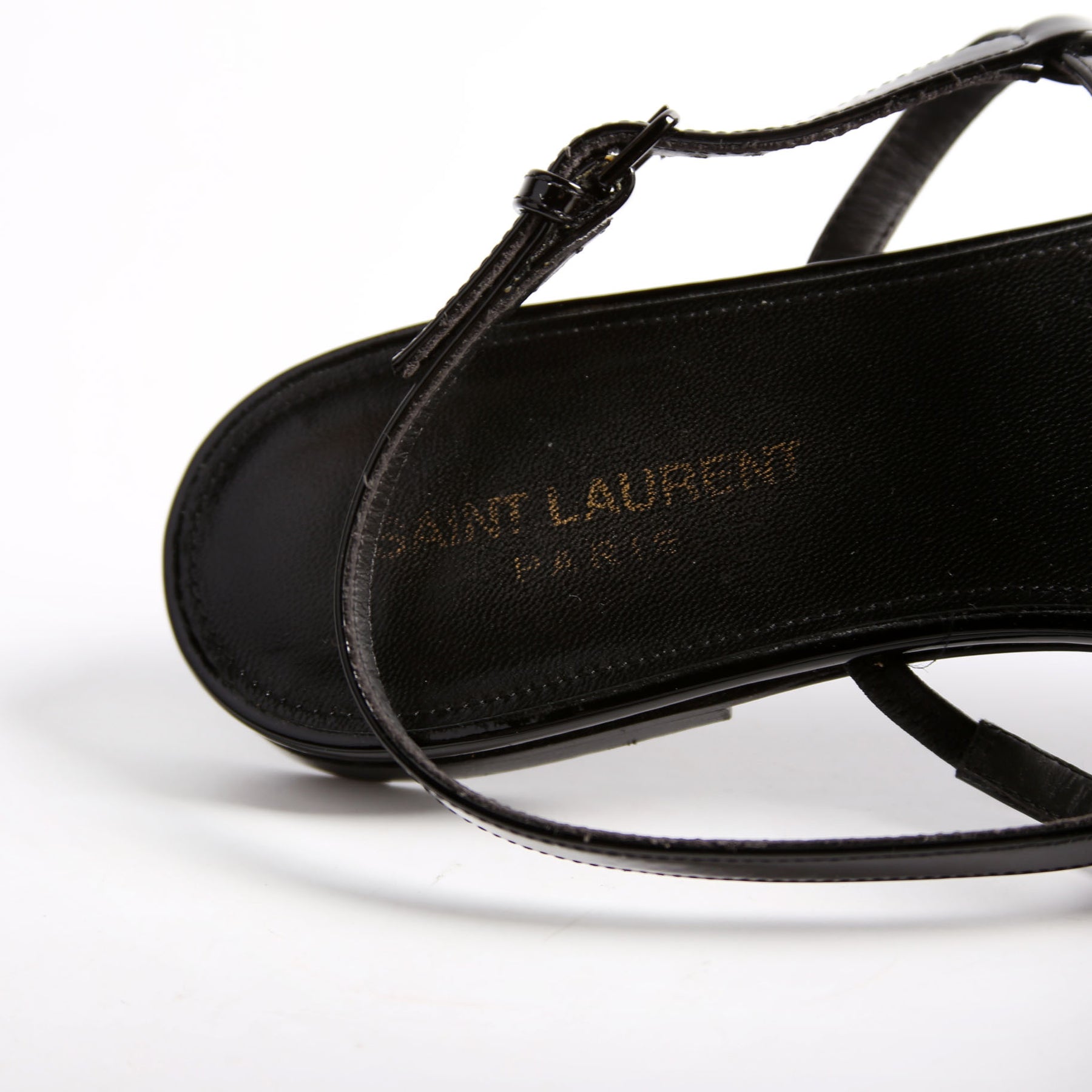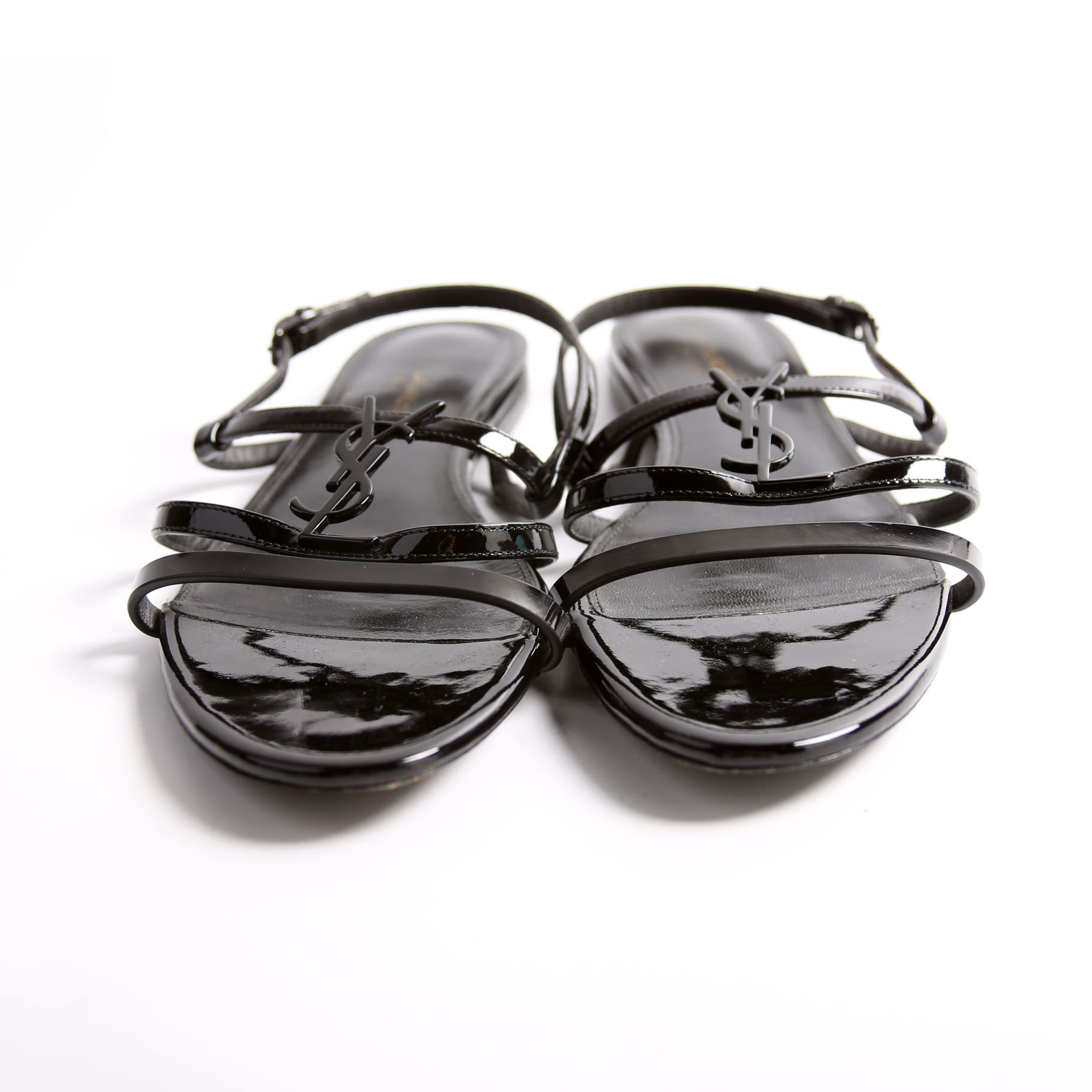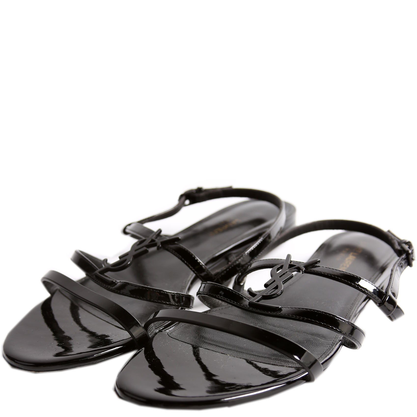 These pre-owned Saint Laurent Cassandre Flat Patent Sandals are guaranteed 100% authentic.