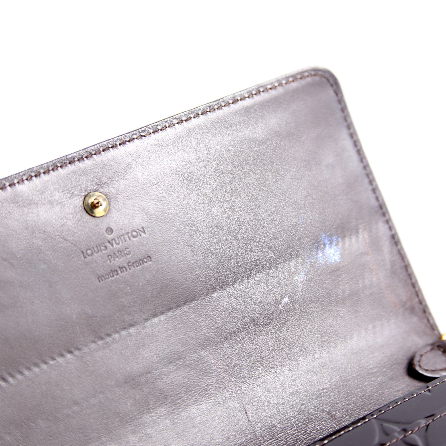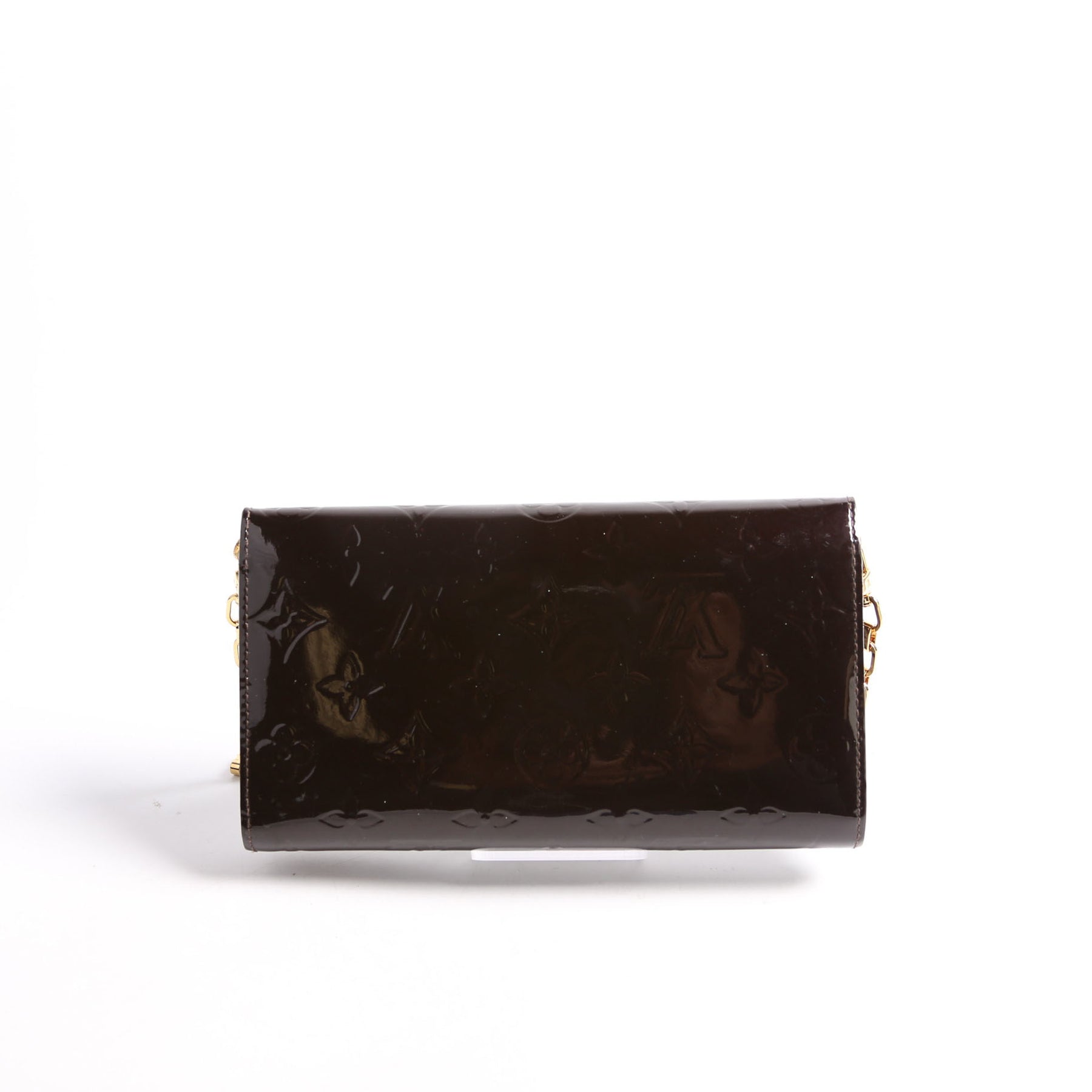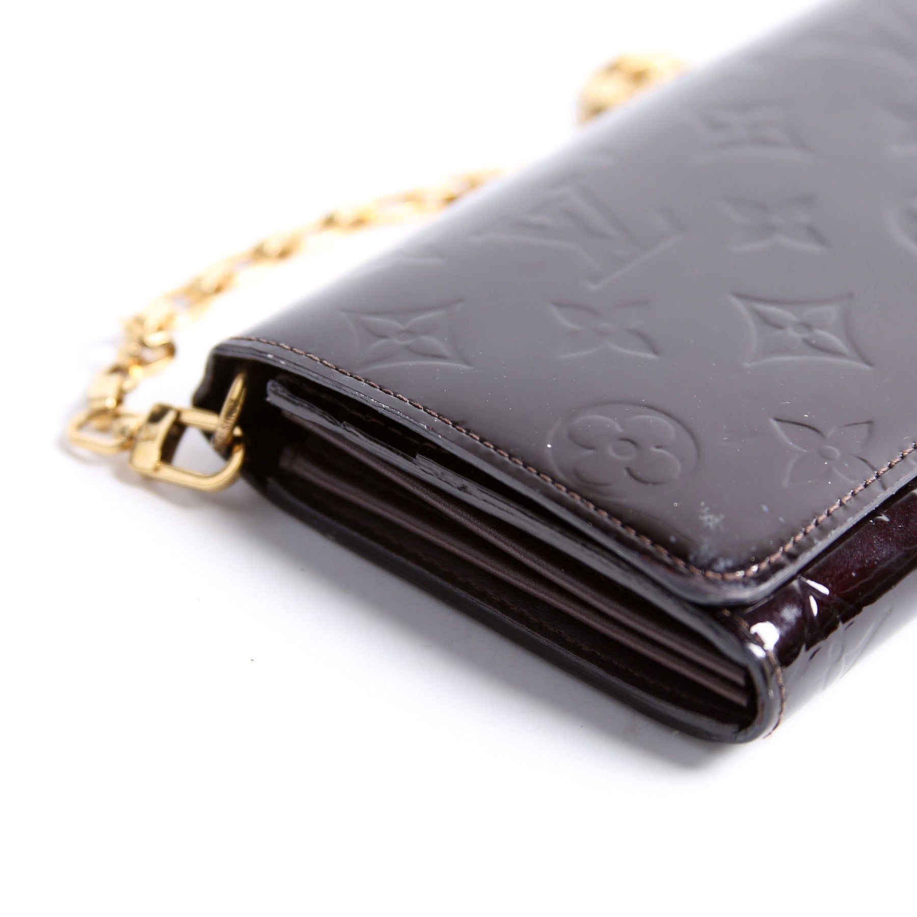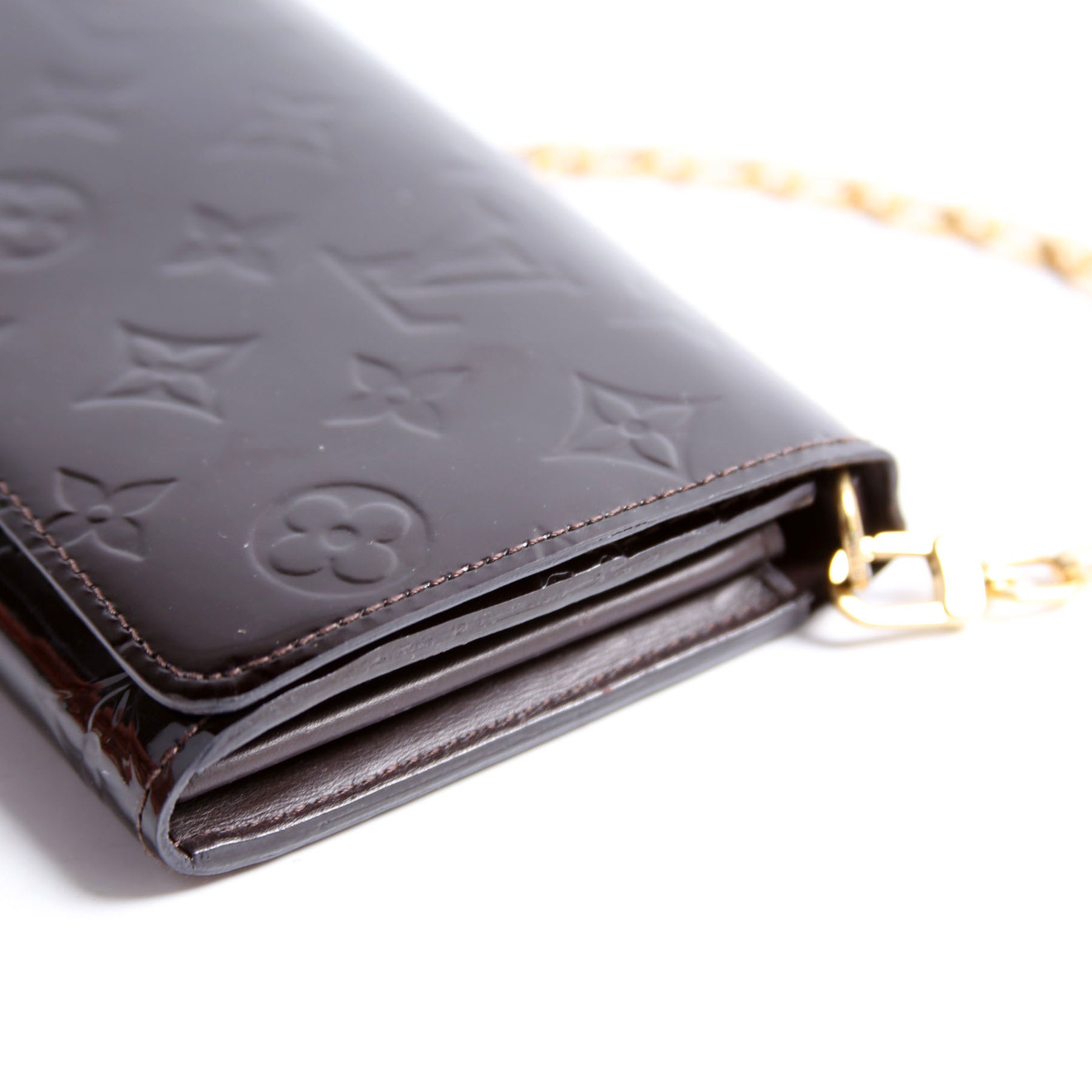 This pre-owned Louis Vuitton Chaine Wallet is guaranteed 100% authentic. The exterior is in the classic Louis Vuitton Vernis leather.