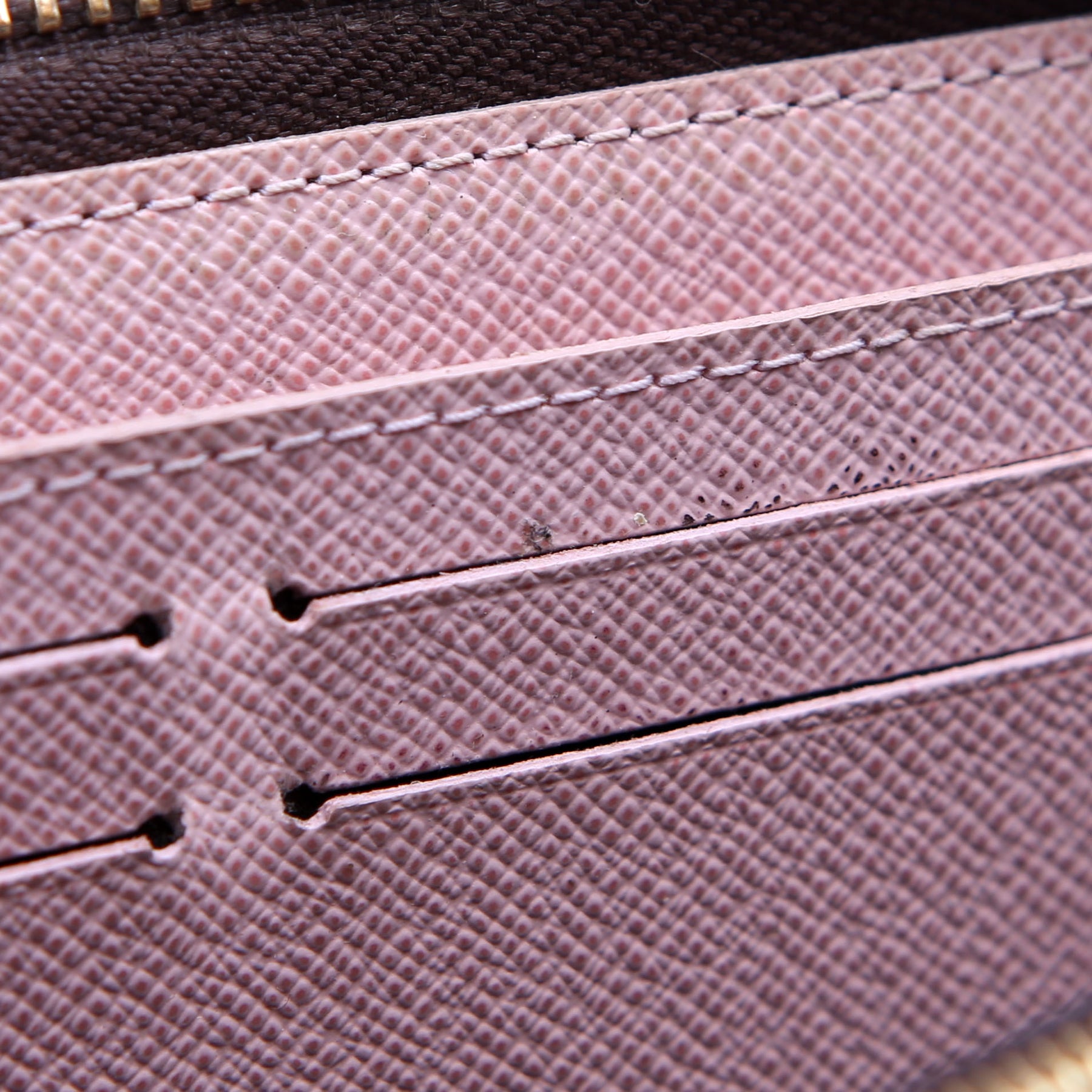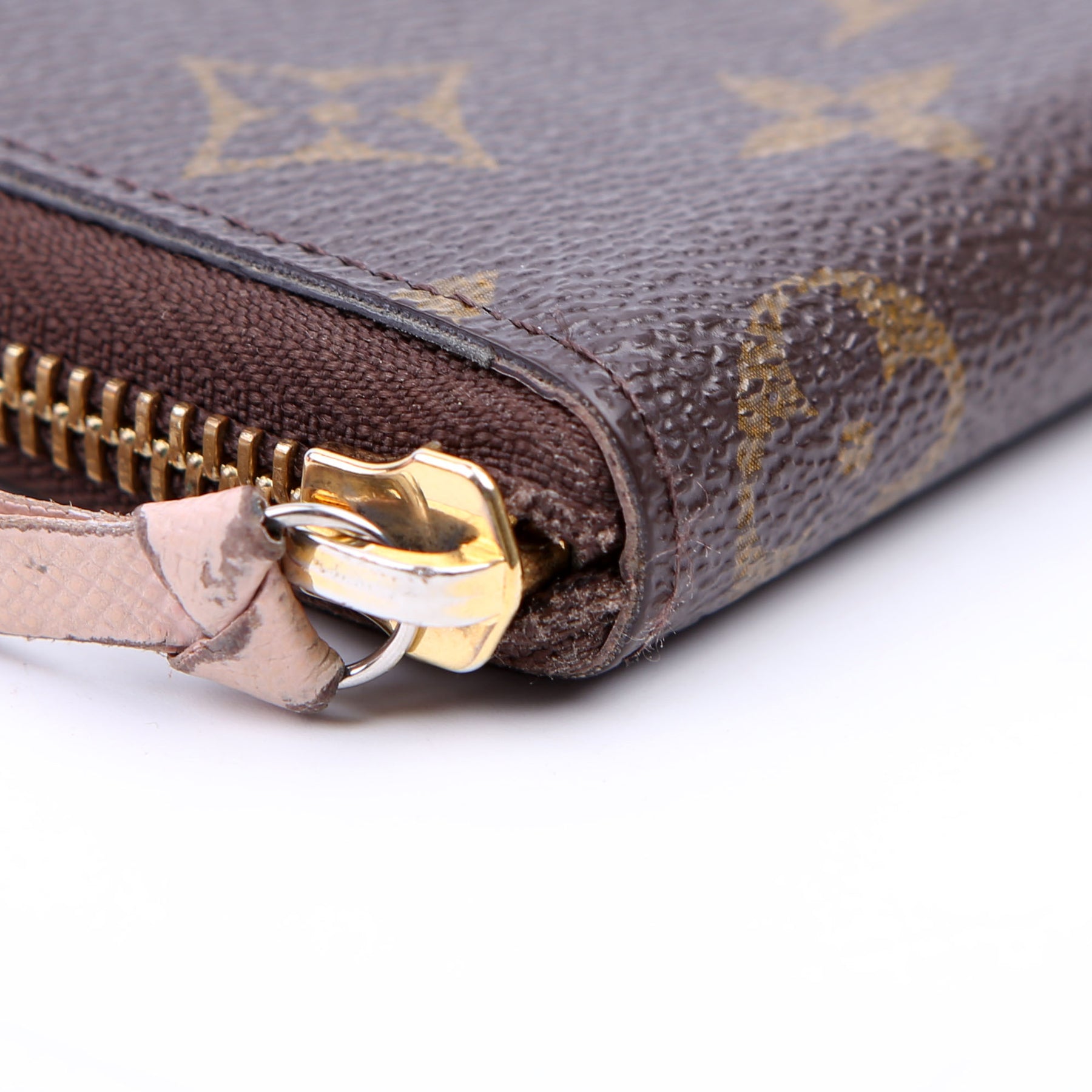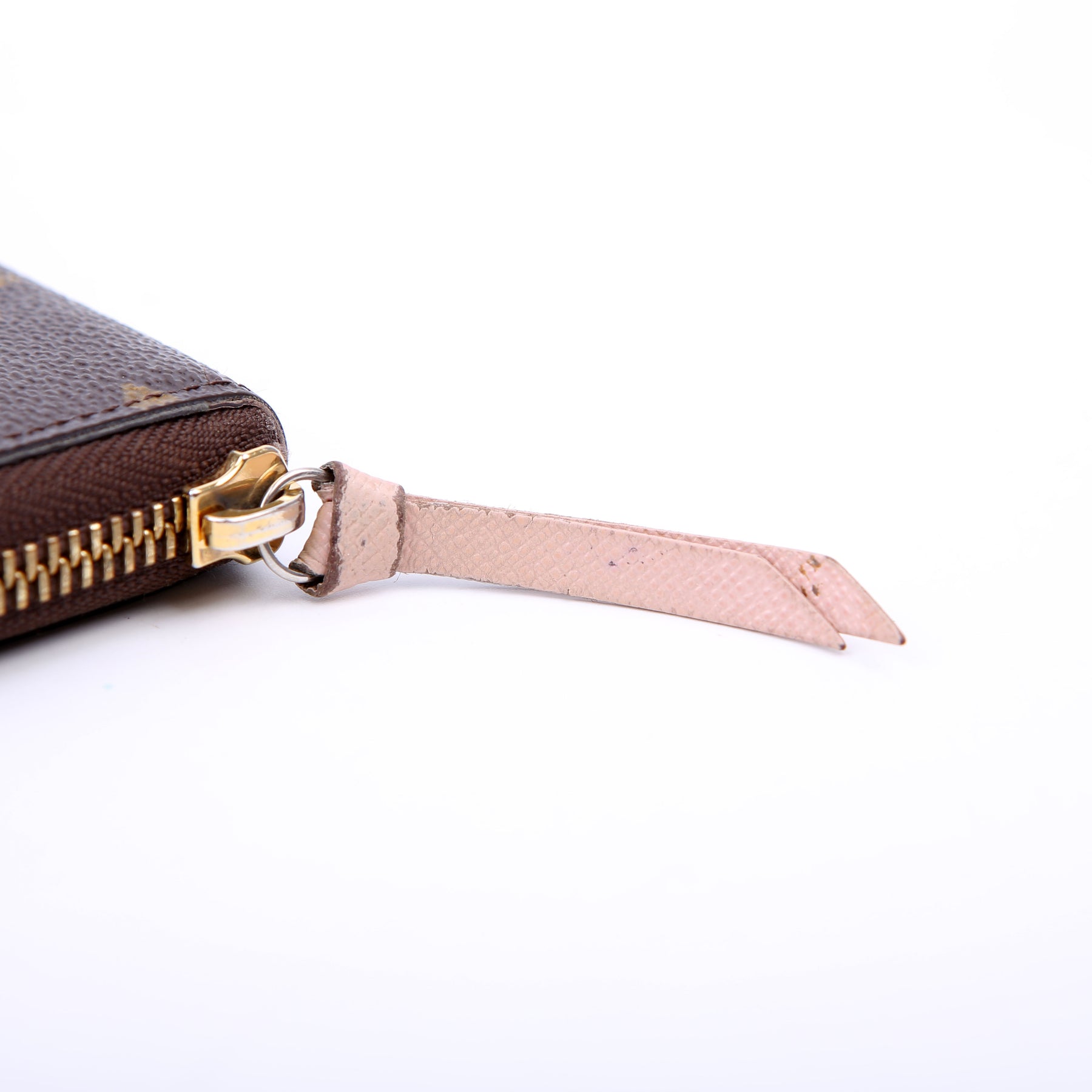 Hardware: The zipper operates properly and runs smoothly. The hardware and leather zipper pull show minor wear.