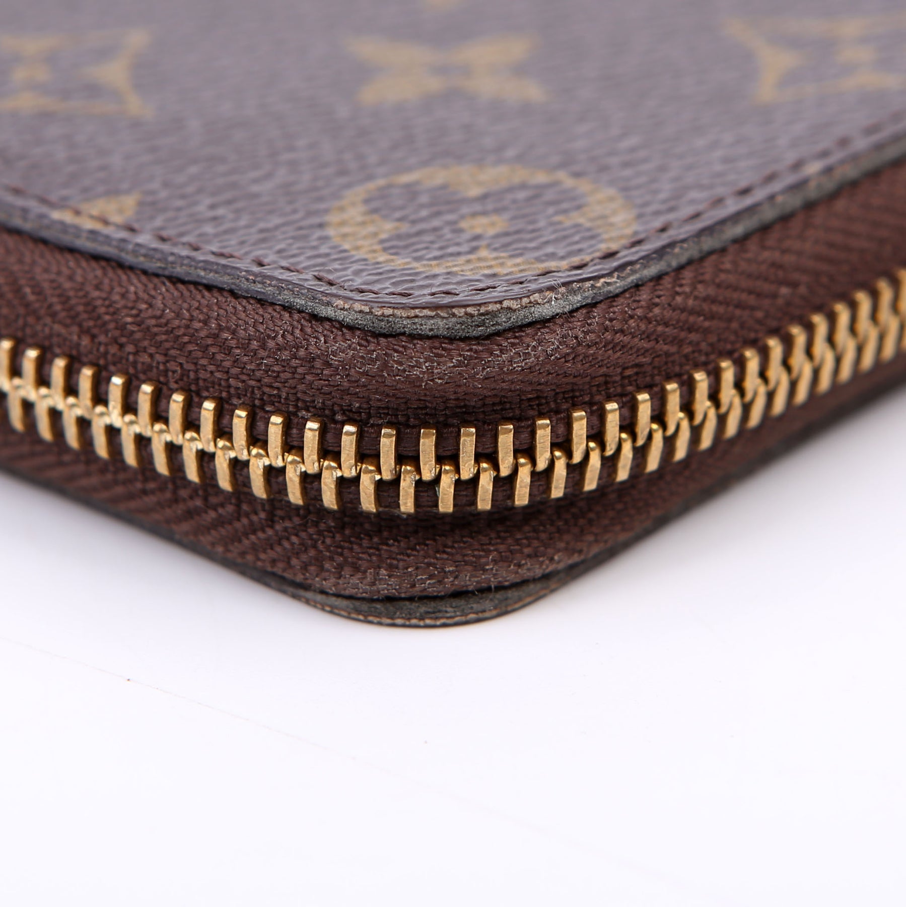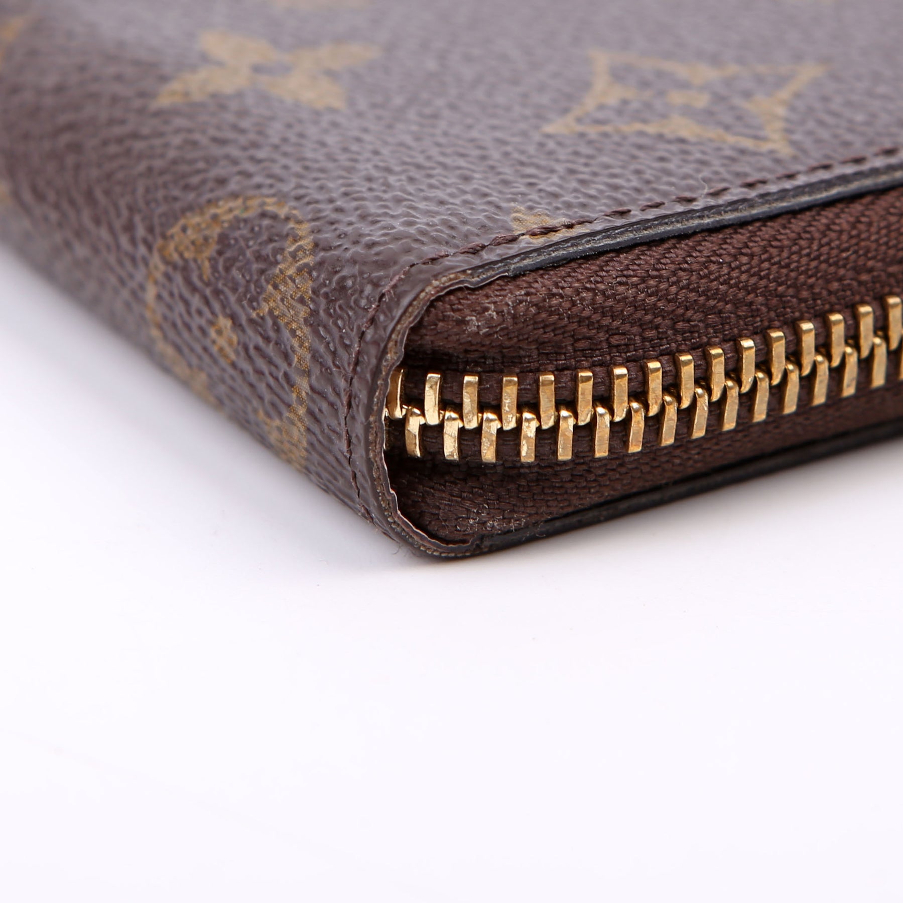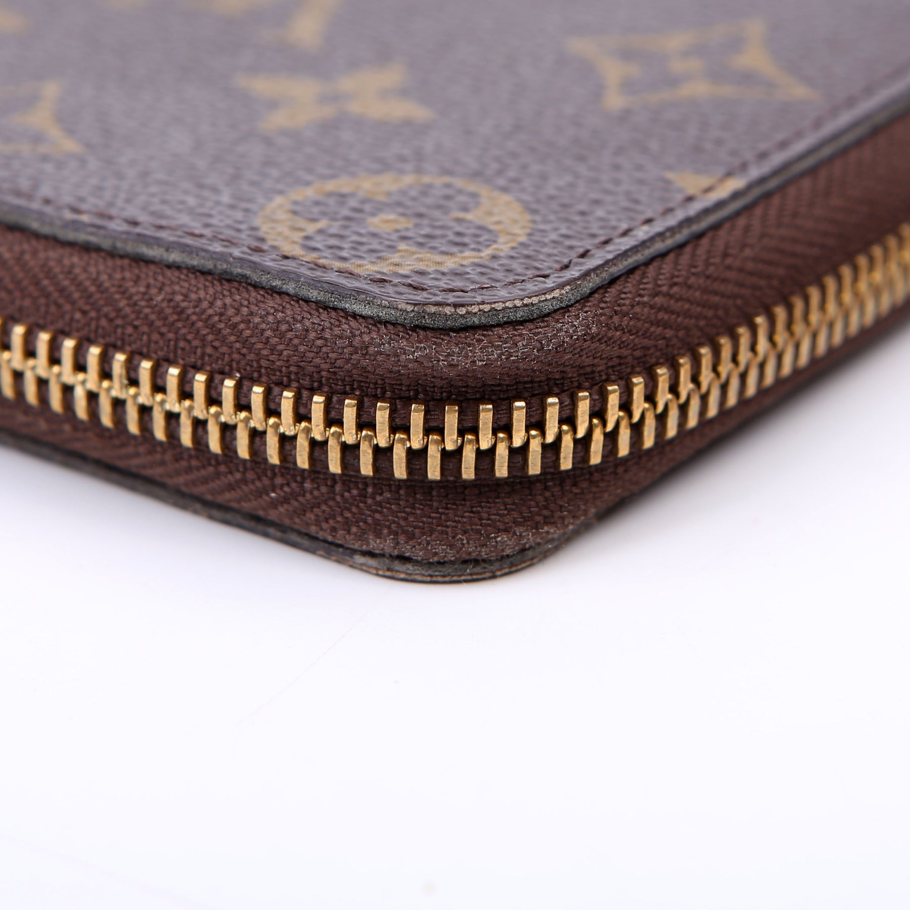 Hardware: The zipper operates properly and runs smoothly. The hardware and leather zipper pull show minor wear.
